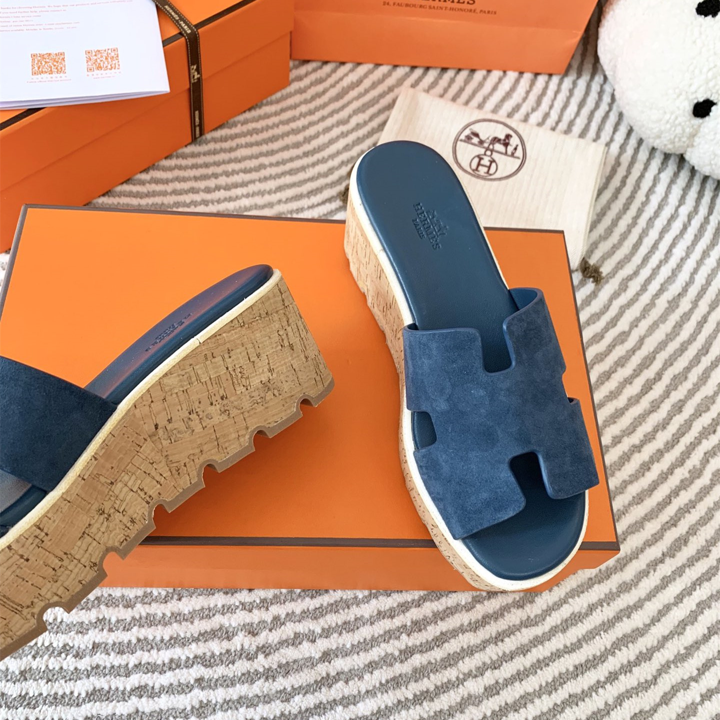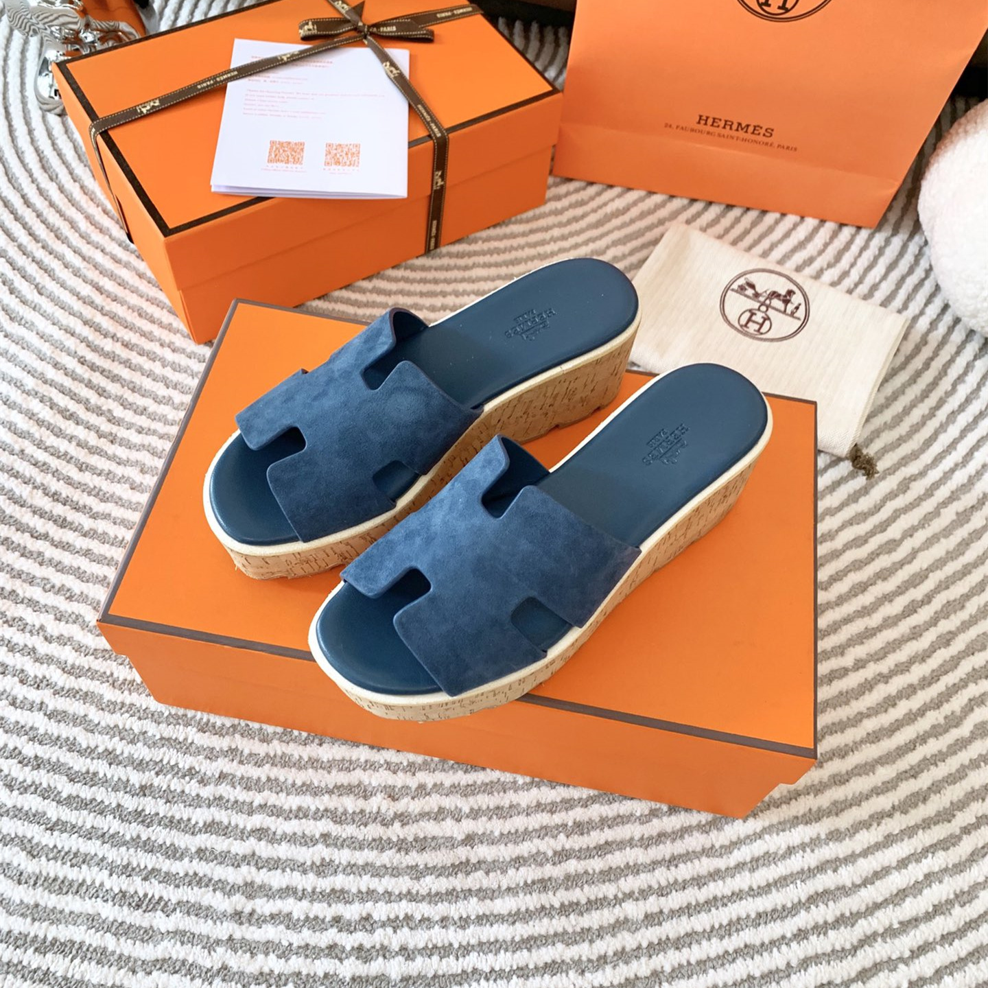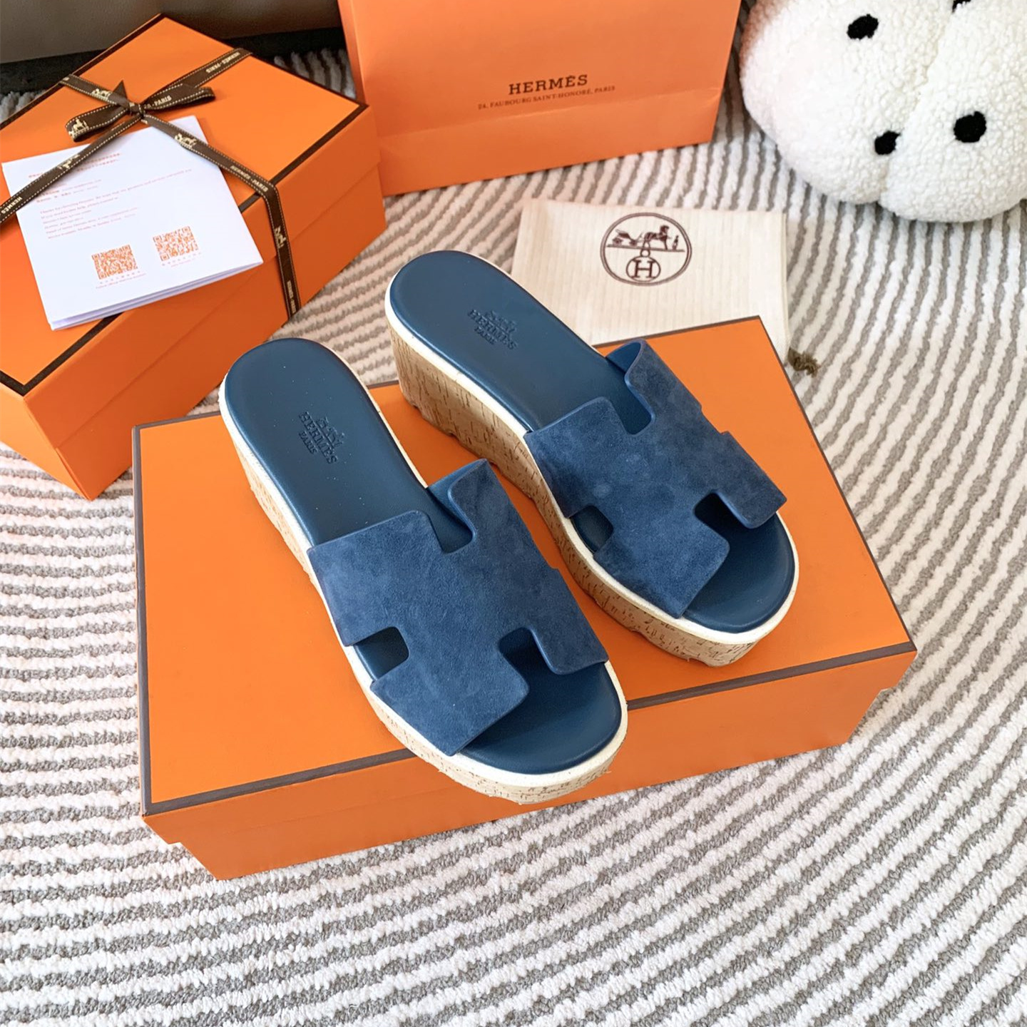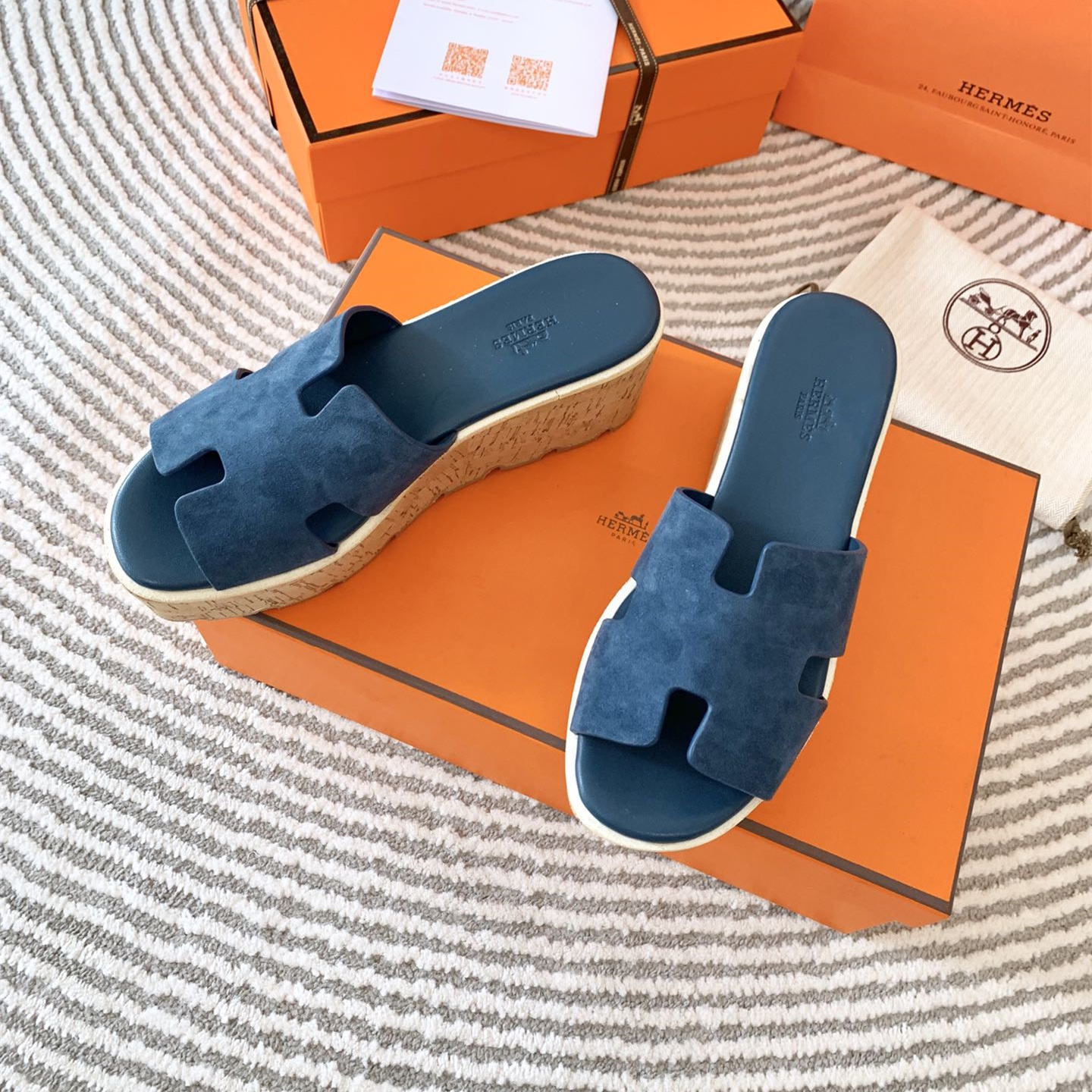 高仿Hermes*H232150ZV9山羊皮厚底涼拖藍色6.5CM免檢版