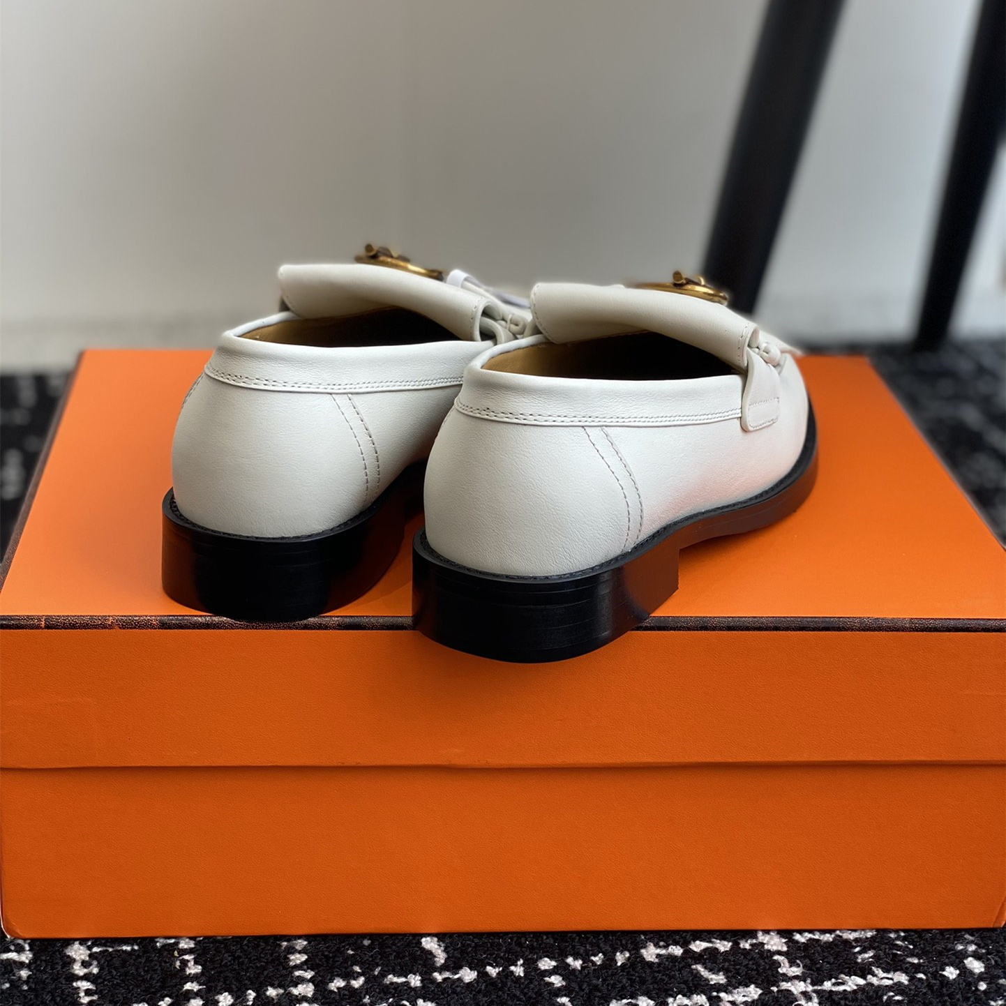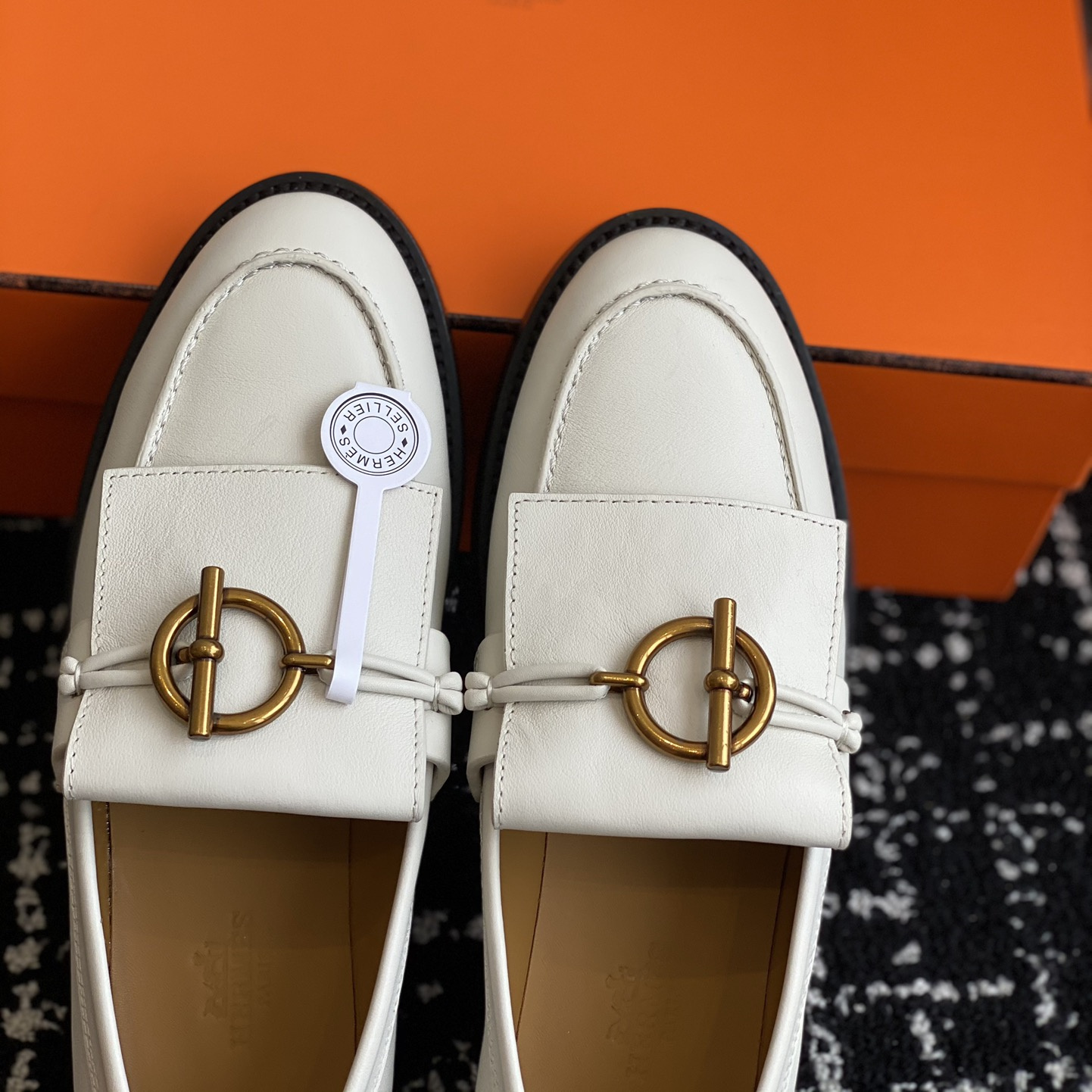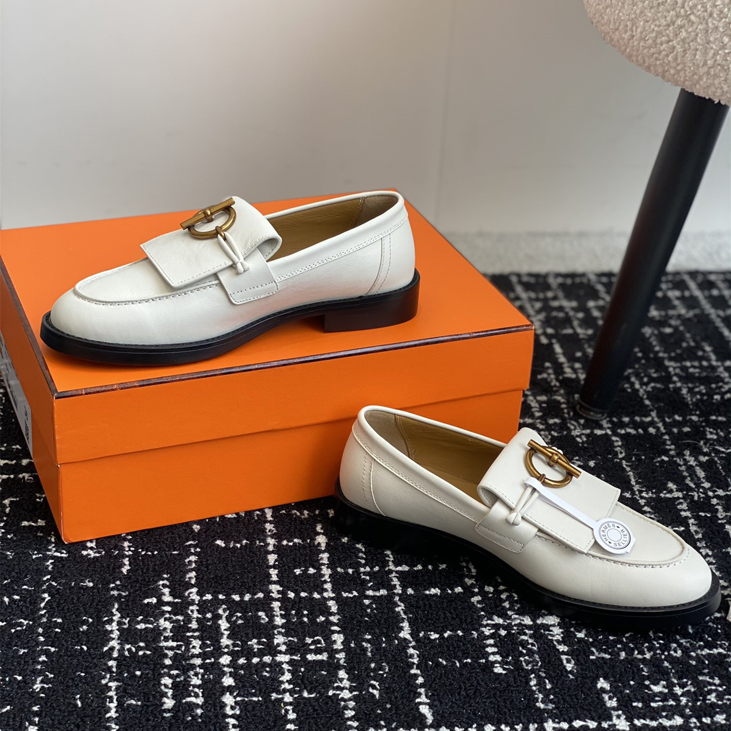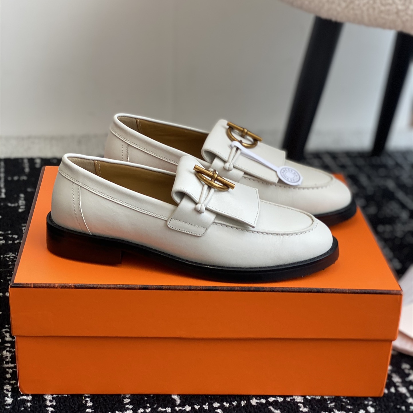 高仿Hermes*H241143ZCL塔扣小羊皮樂福鞋白色免檢版