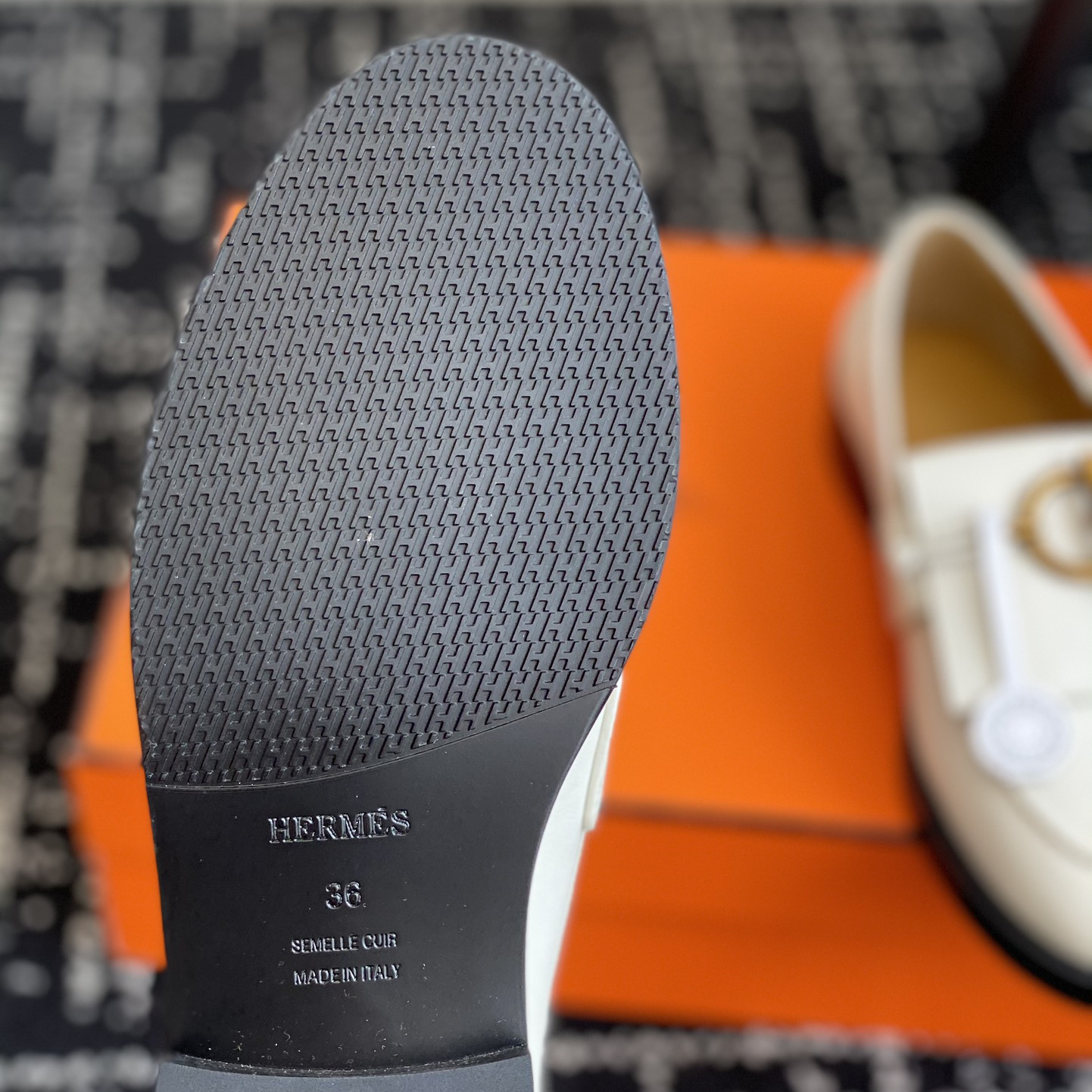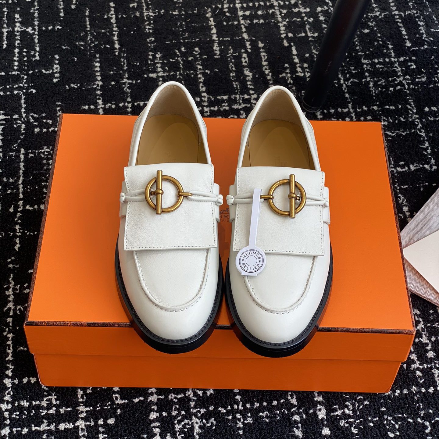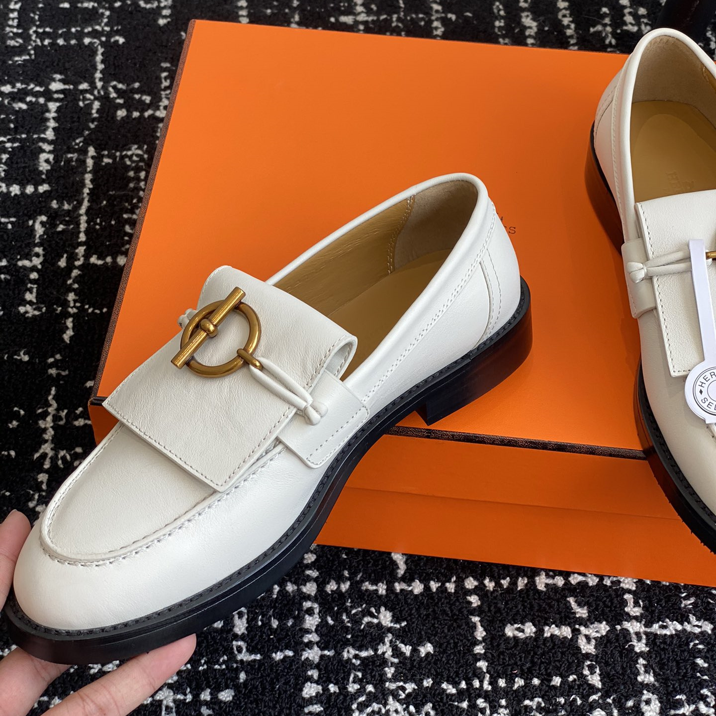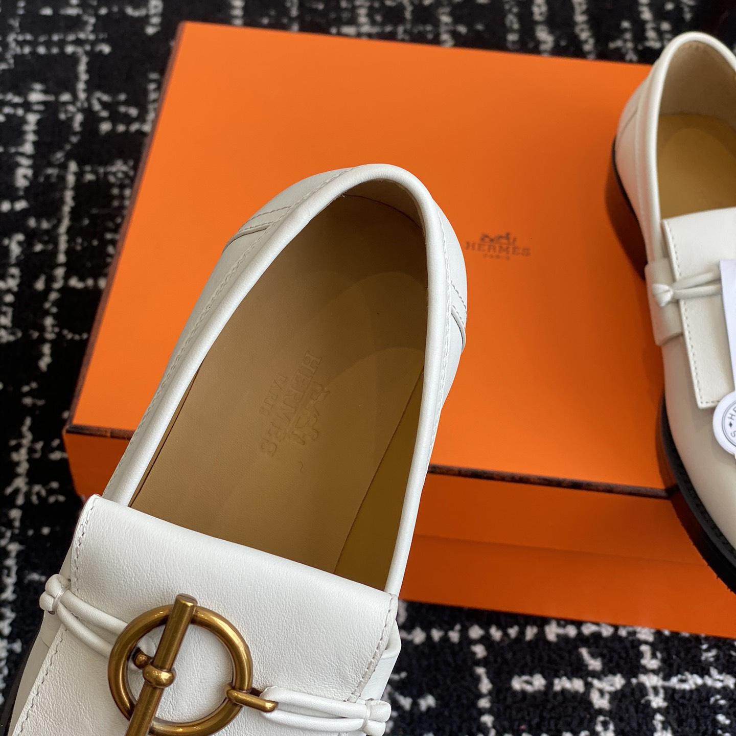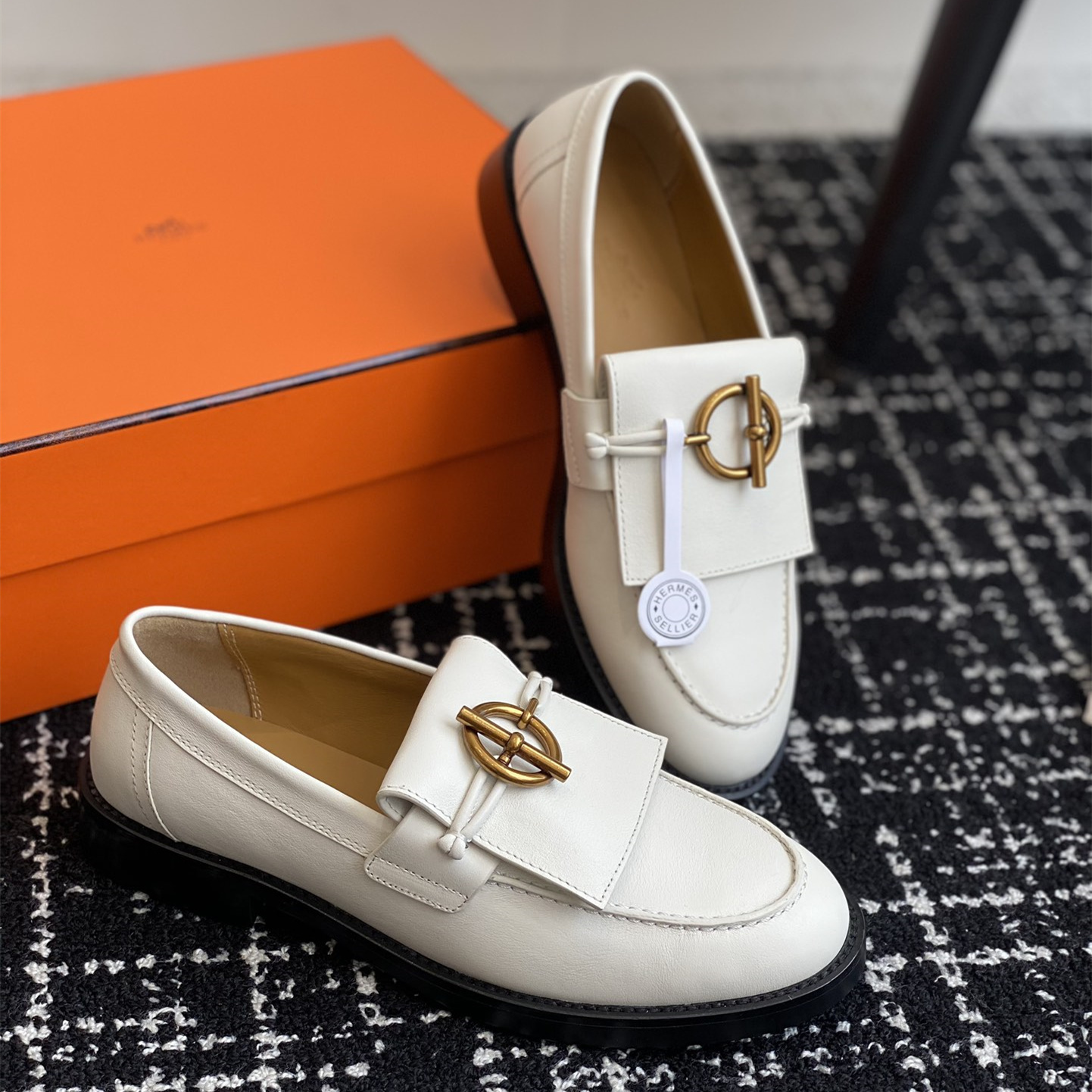 高仿Hermes*H241143ZCL塔扣小羊皮樂福鞋白色免檢版