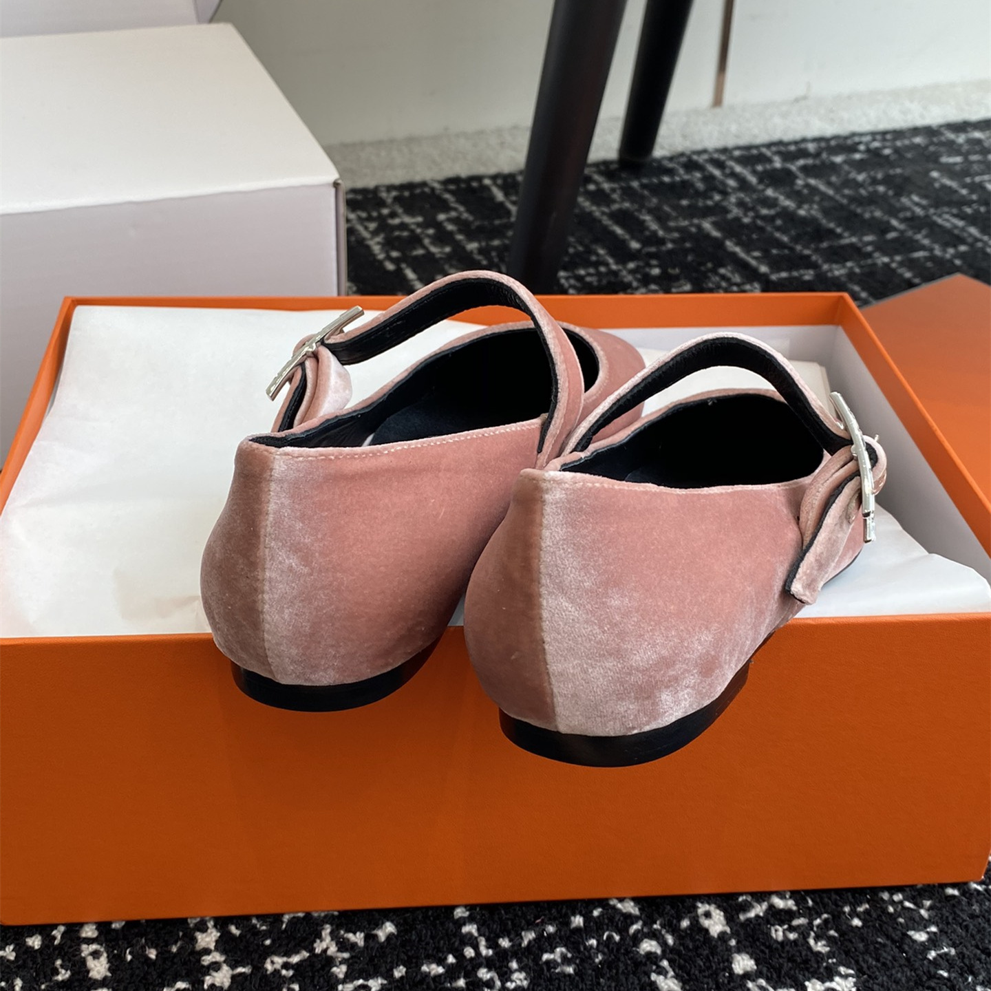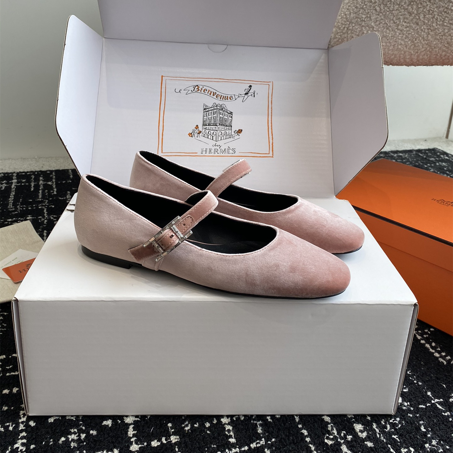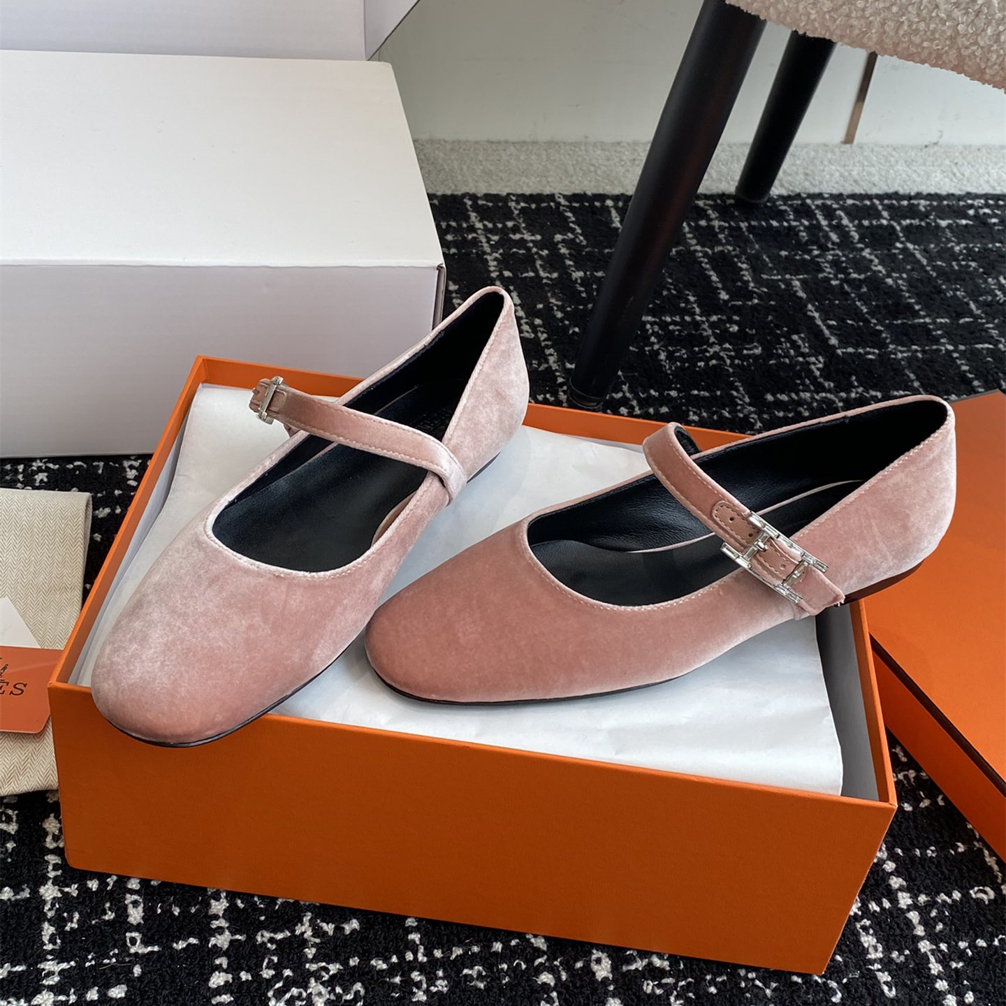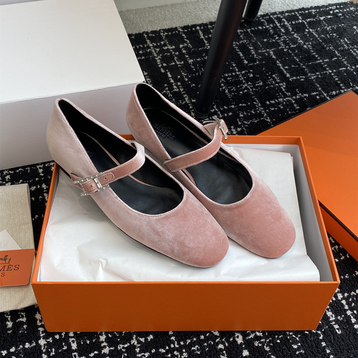 高仿Hermes*H242046ZBR絨面瑪麗珍鞋粉色免檢版
