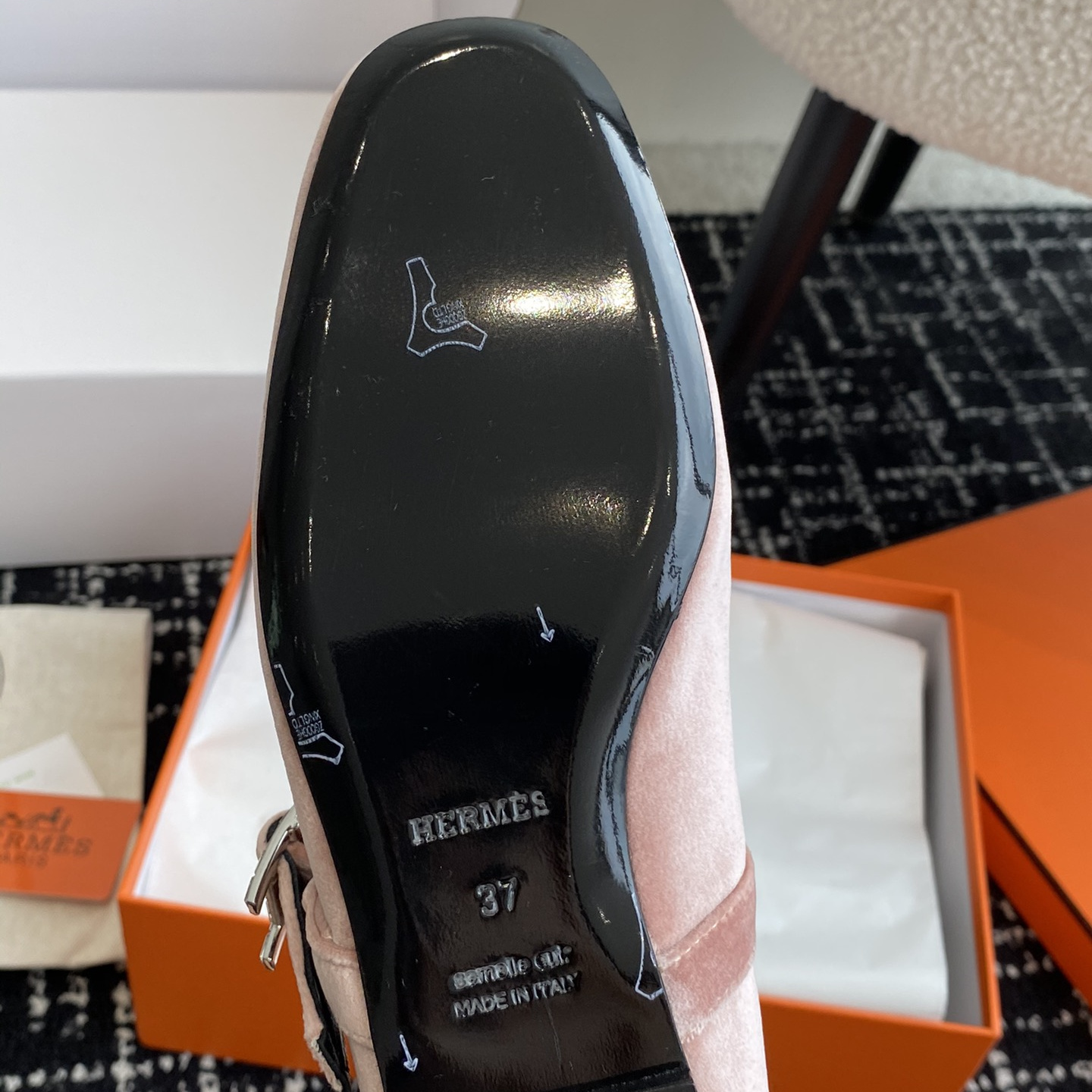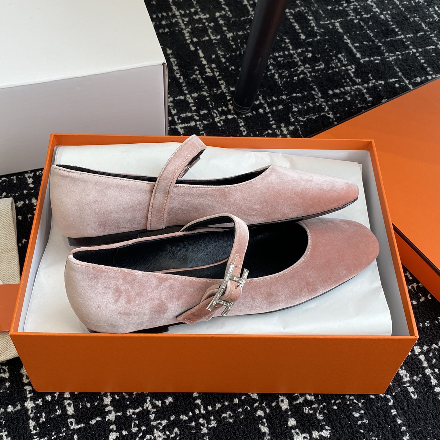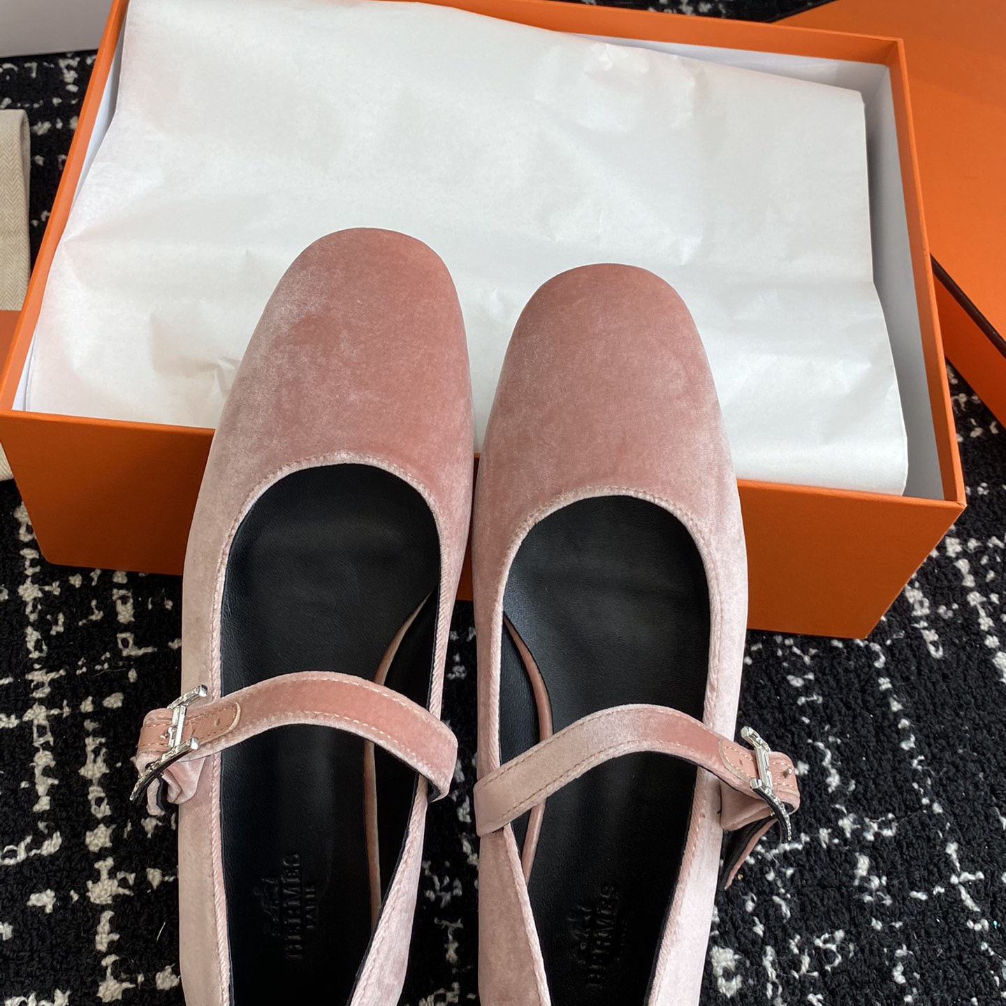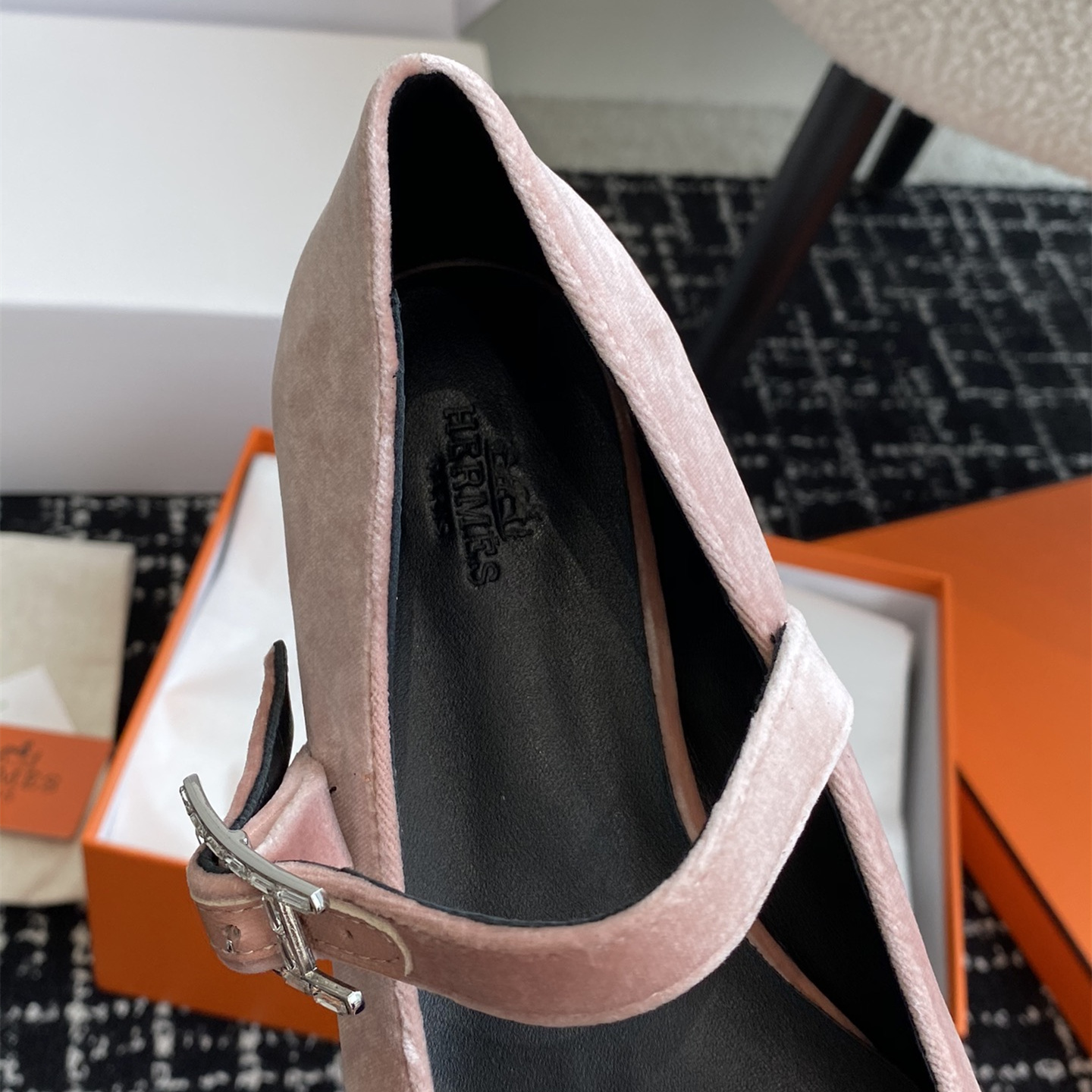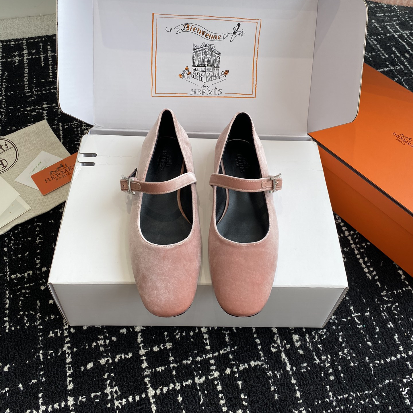 高仿Hermes*H242046ZBR絨面瑪麗珍鞋粉色免檢版