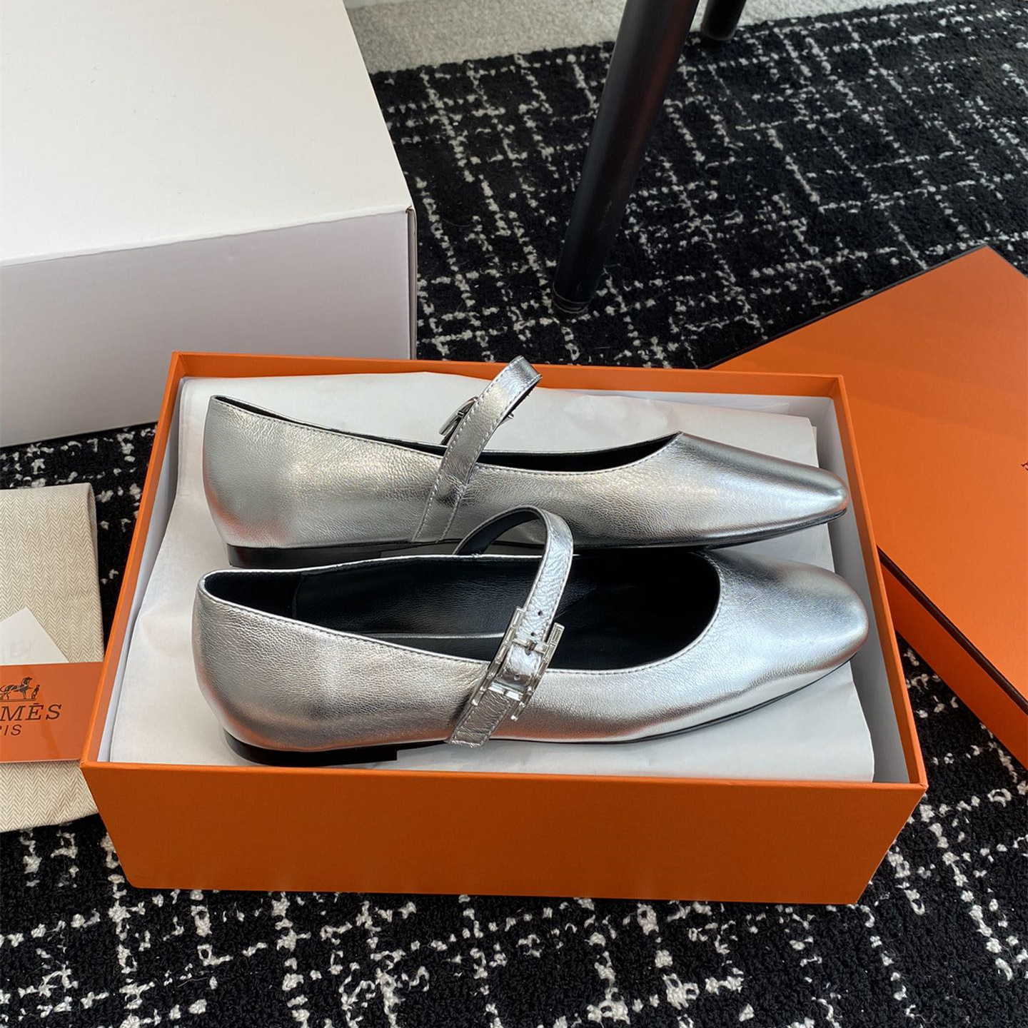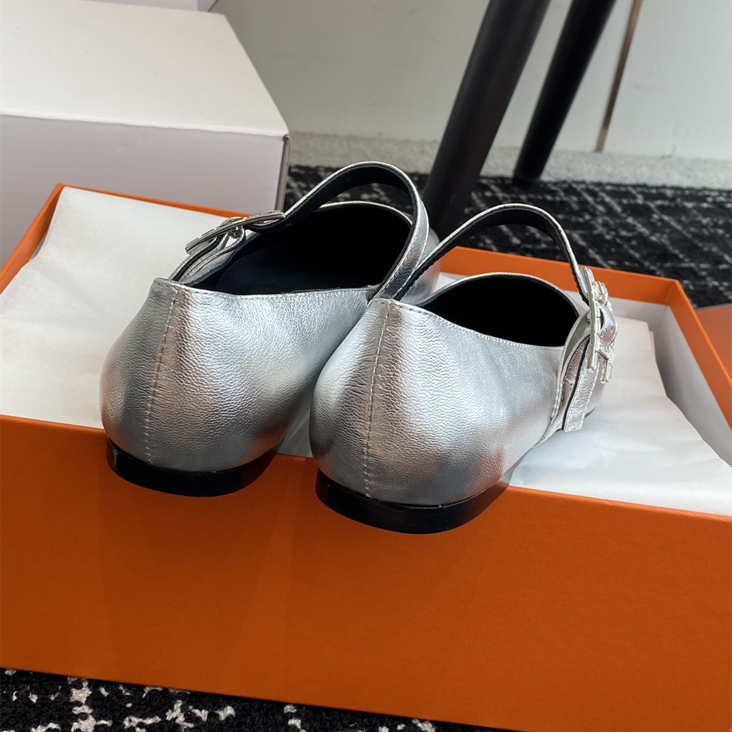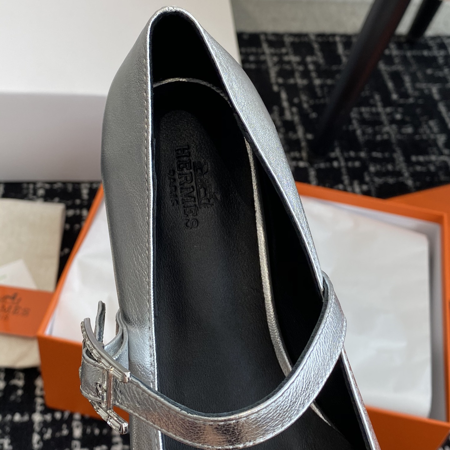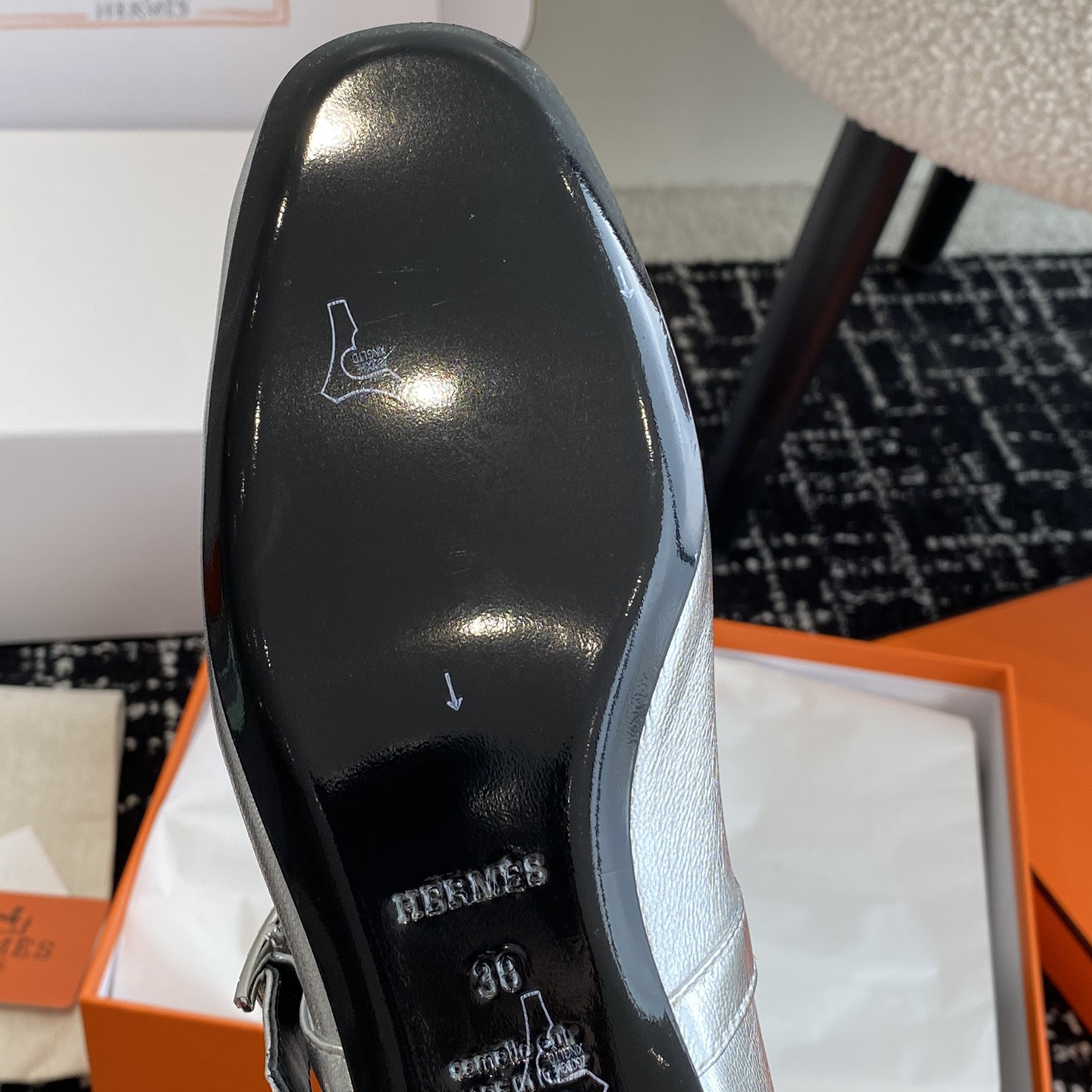 高仿Hermes*H242047ZDQ小牛漆皮瑪麗珍鞋銀色免檢版