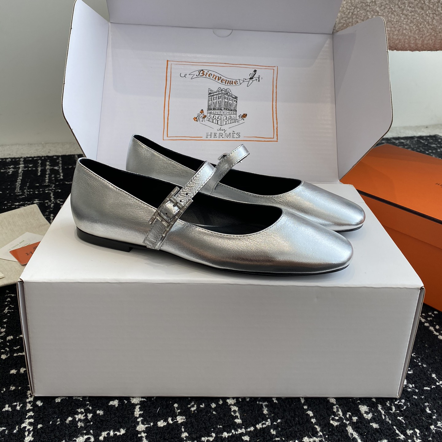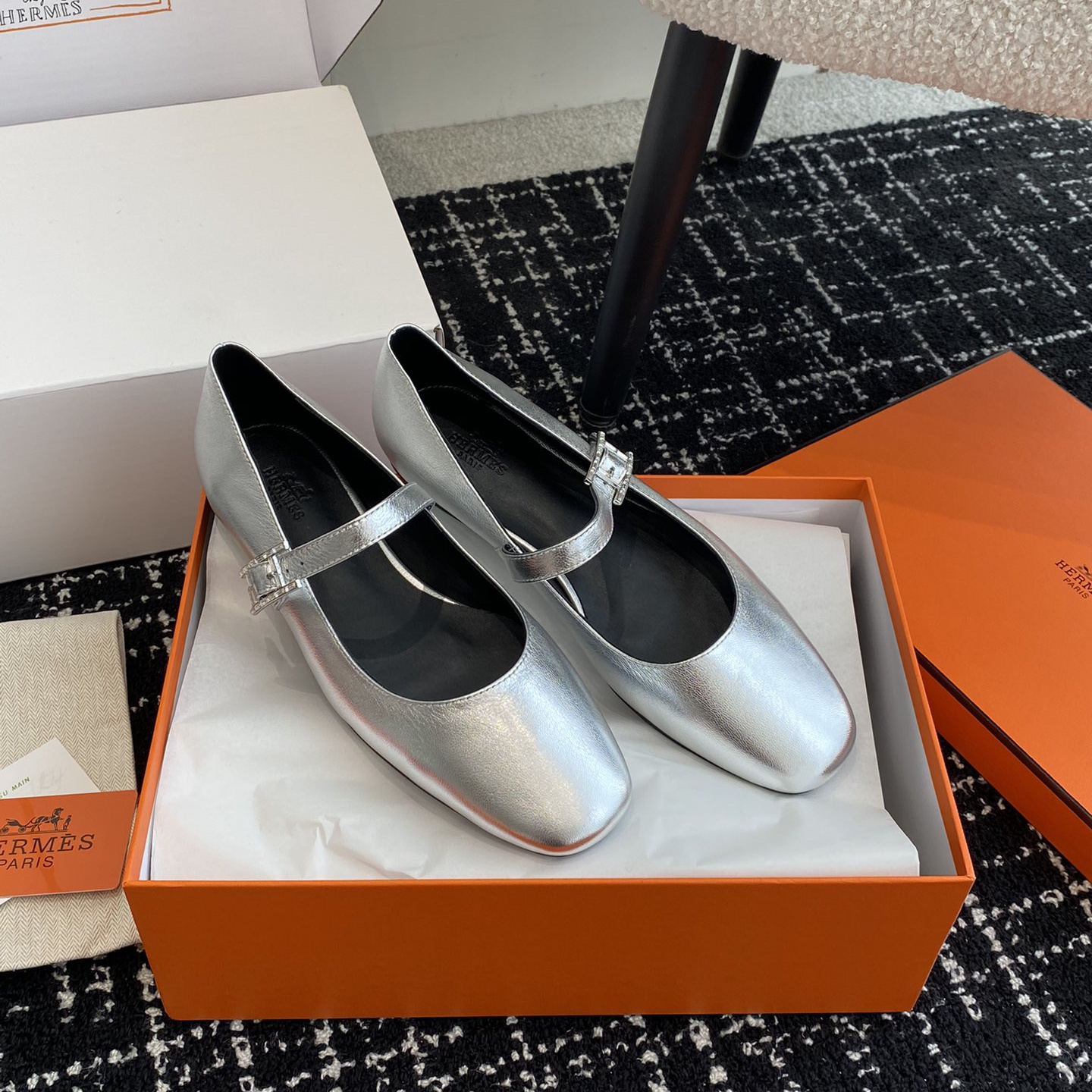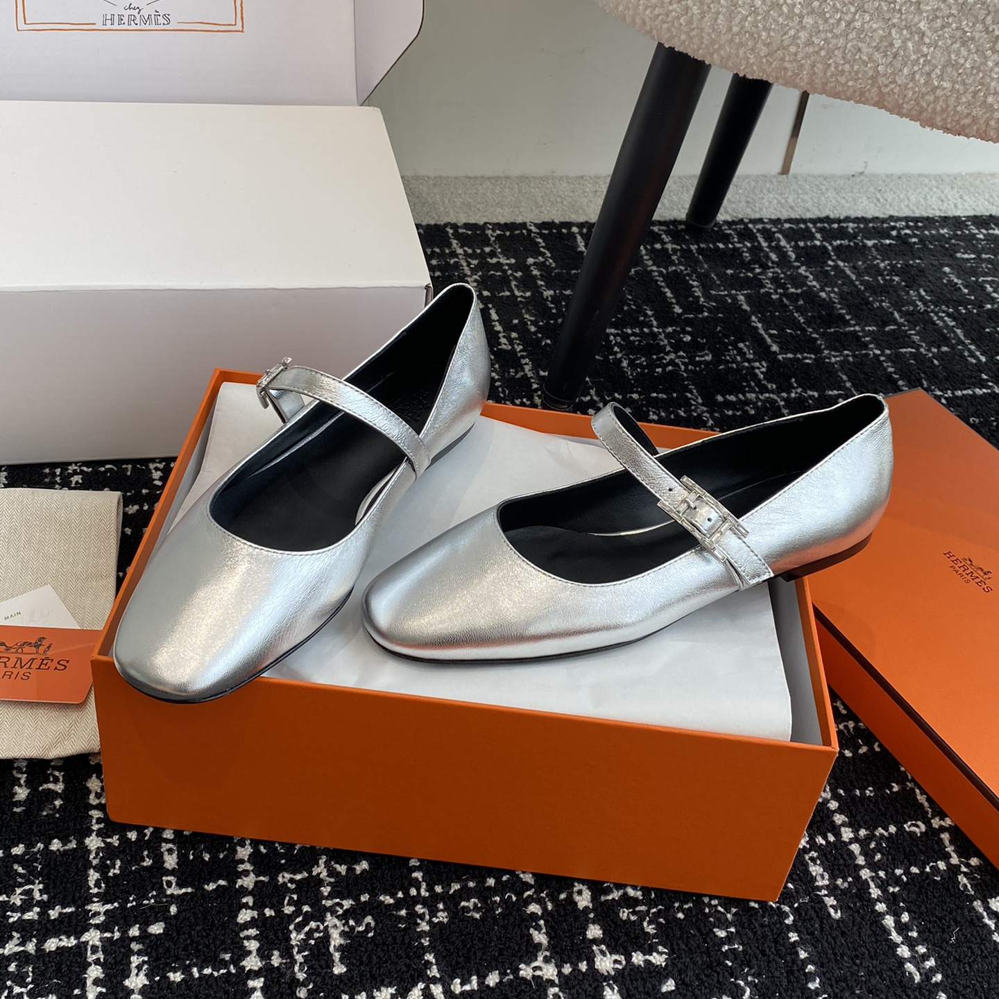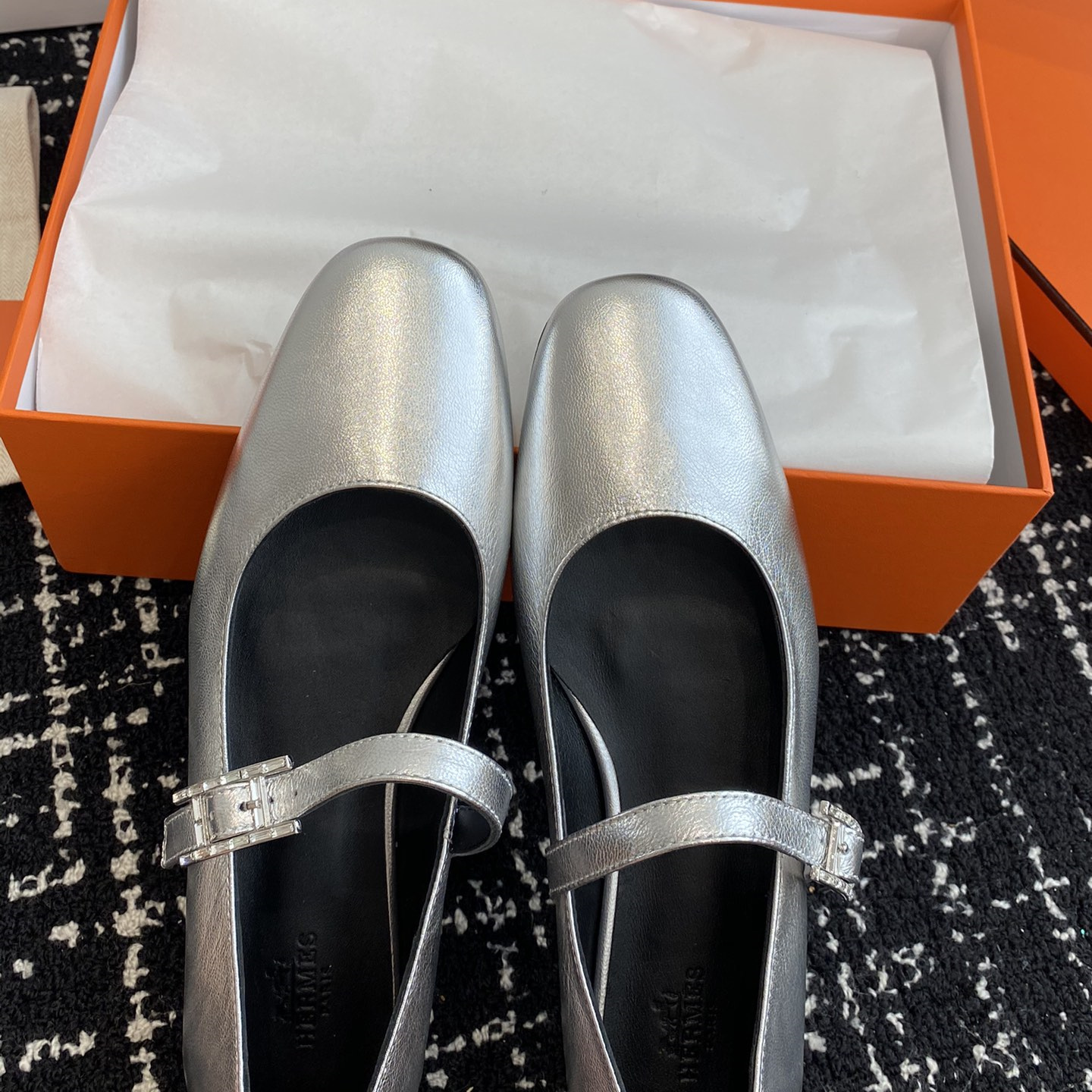 高仿Hermes*H242047ZDQ小牛漆皮瑪麗珍鞋銀色免檢版