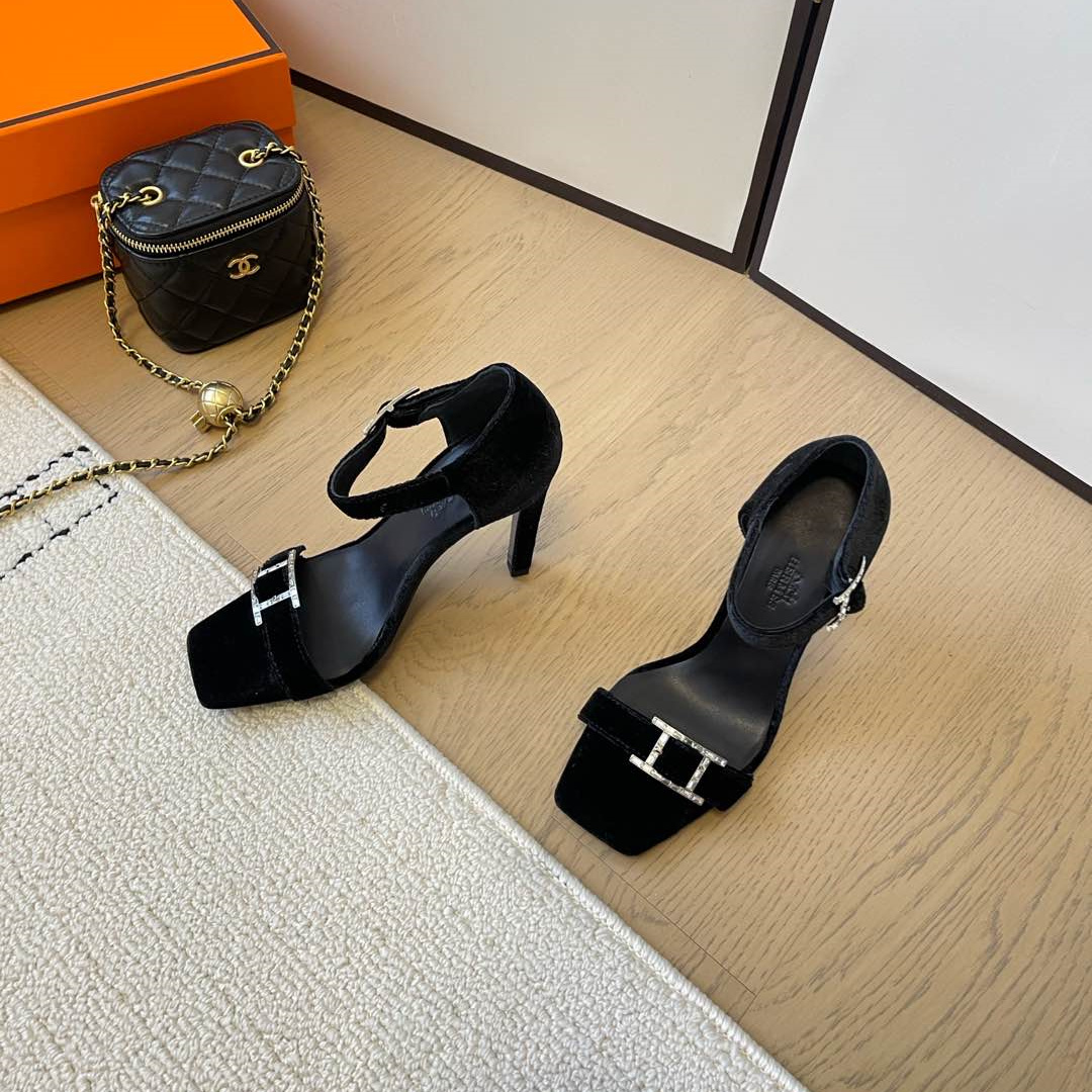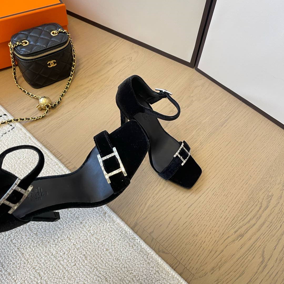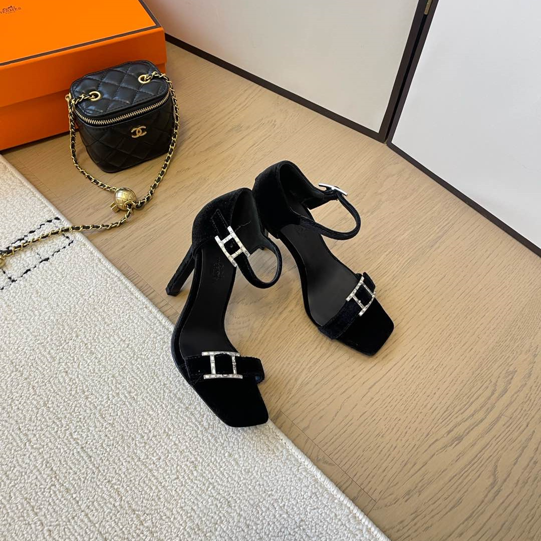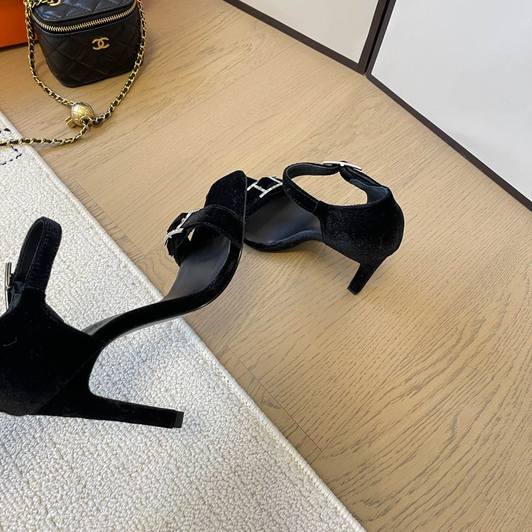 高仿Hermes*Judy系列H242025Z023露趾涼鞋天鵝絨10.5CM黑色免檢版