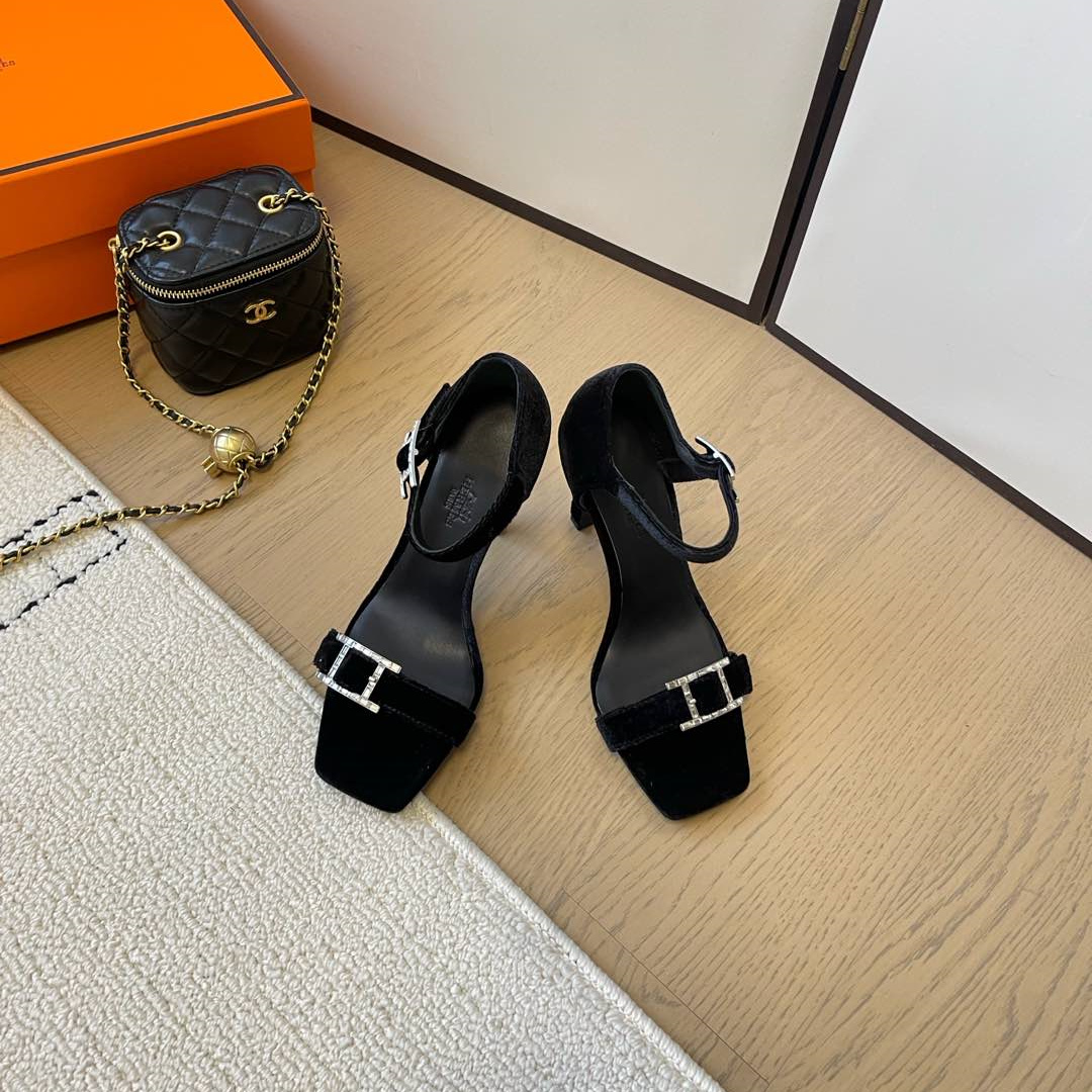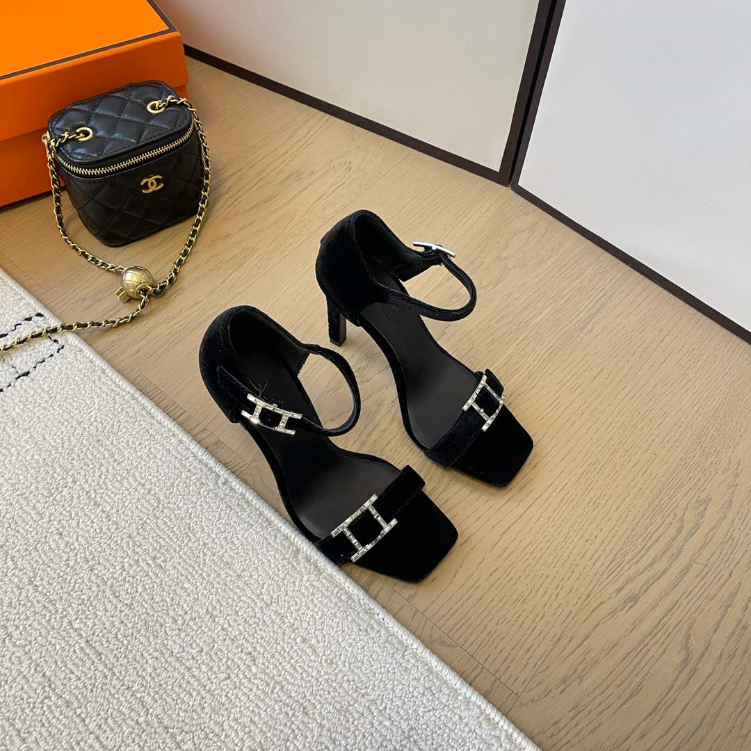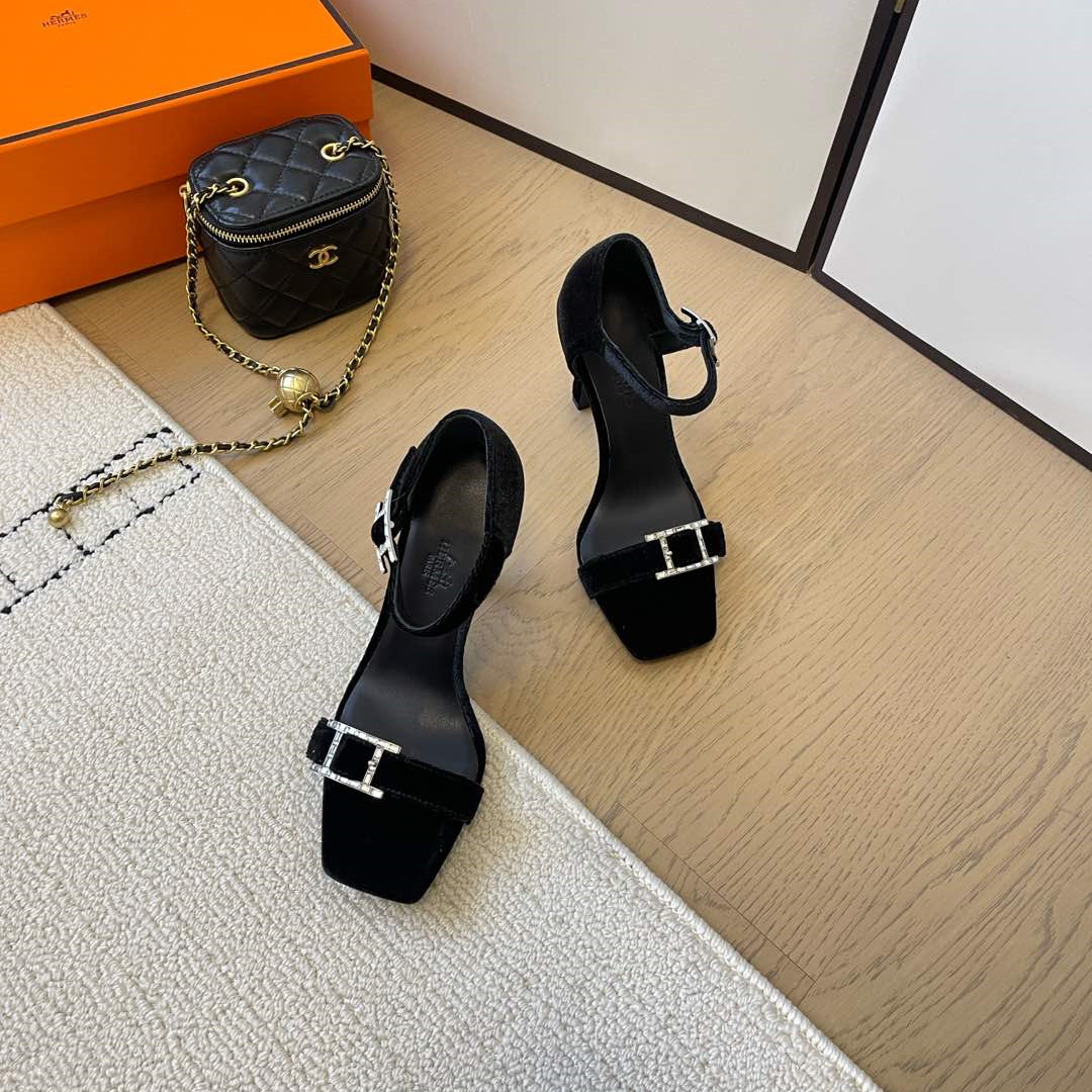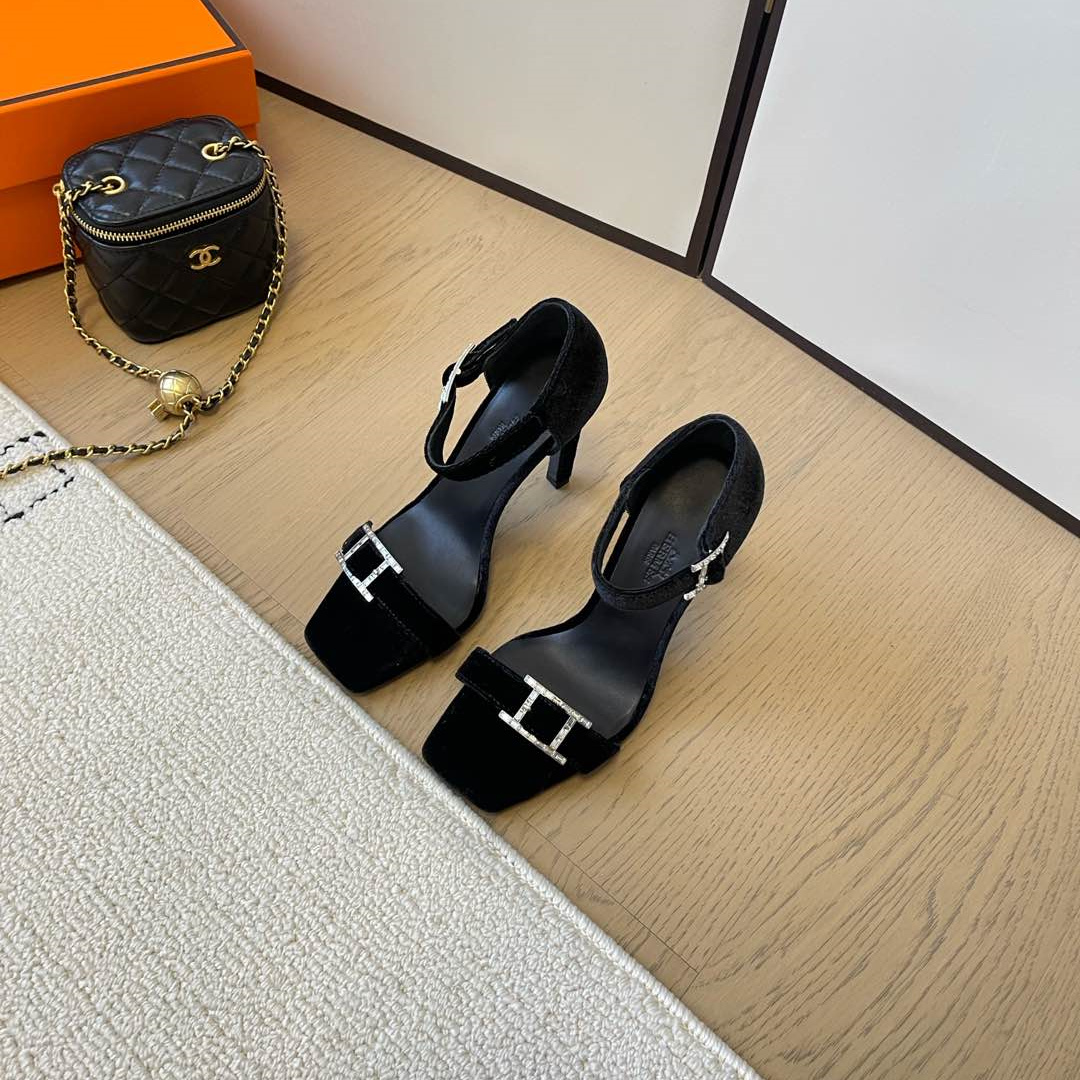 高仿Hermes*Judy系列H242025Z023露趾涼鞋天鵝絨10.5CM黑色免檢版