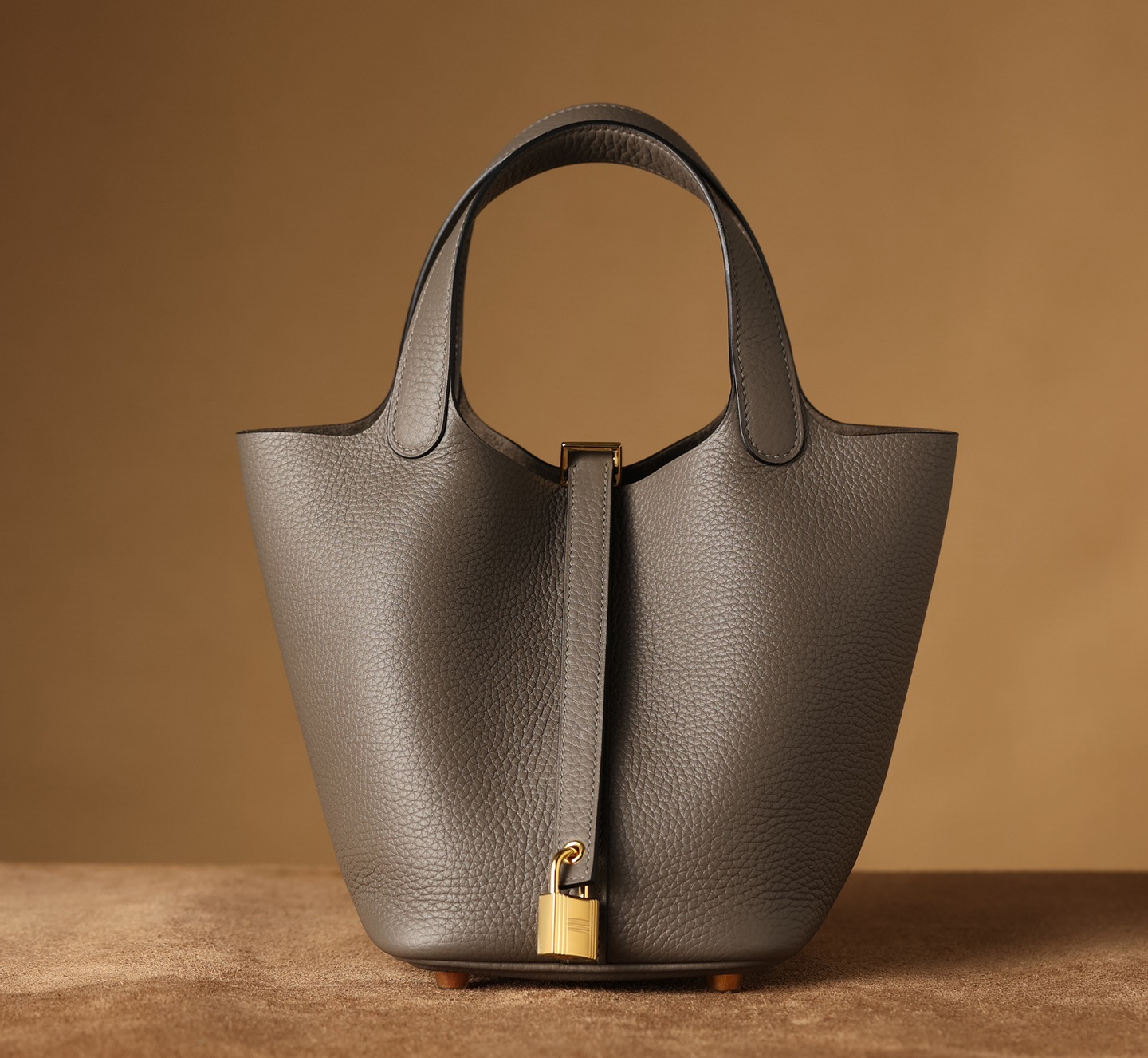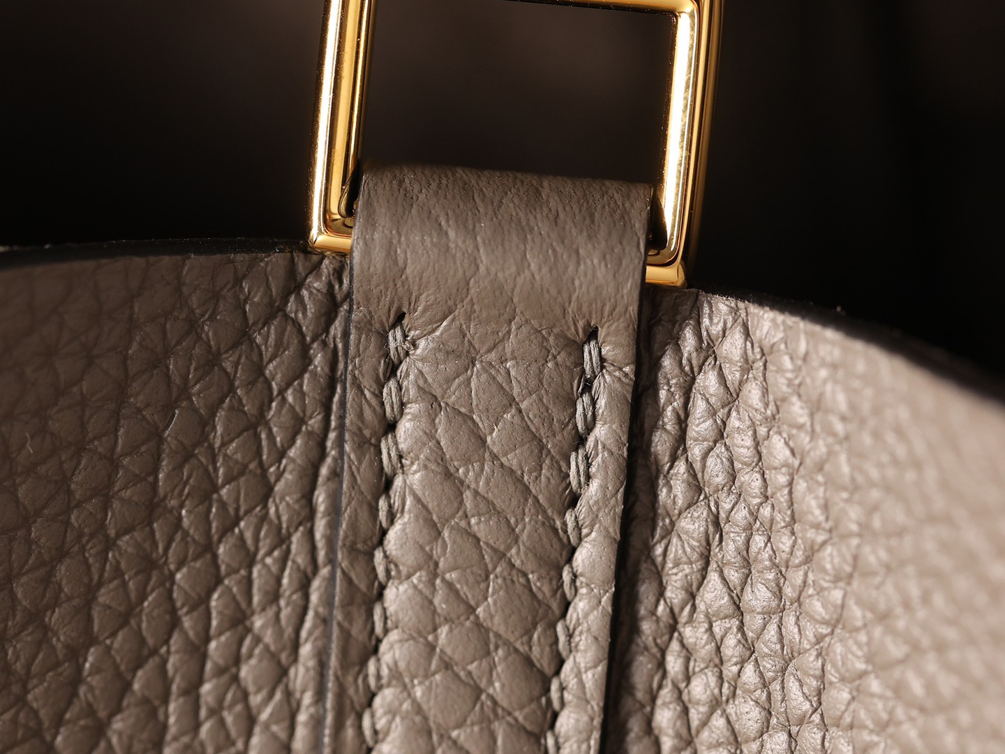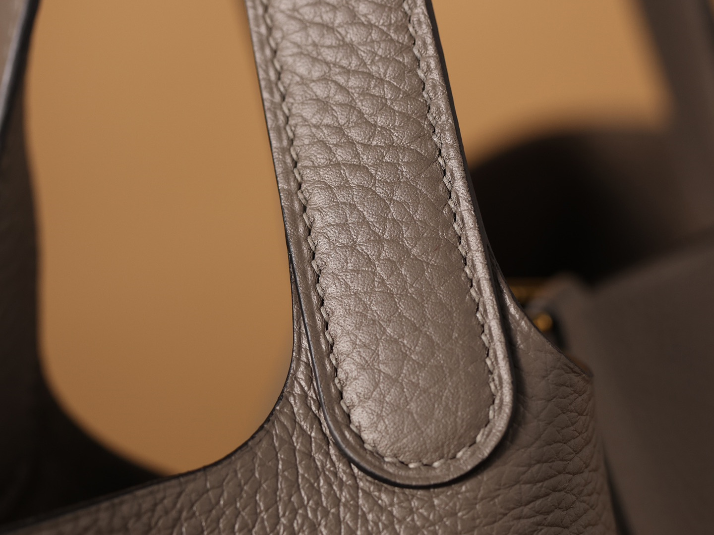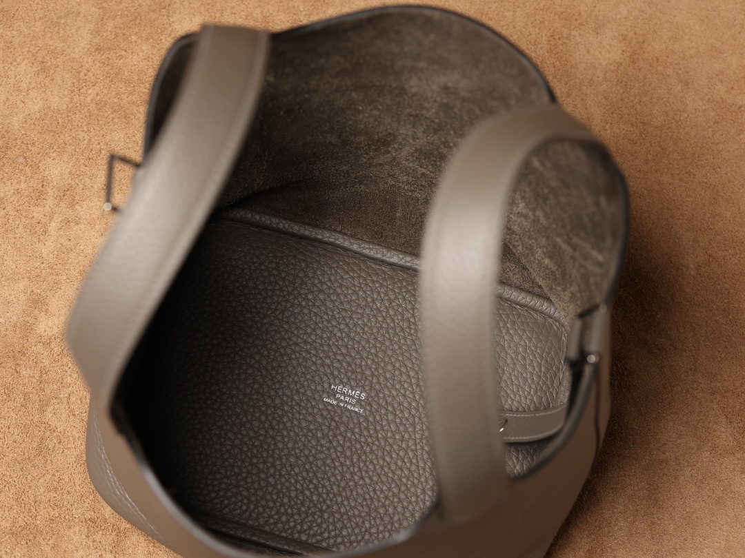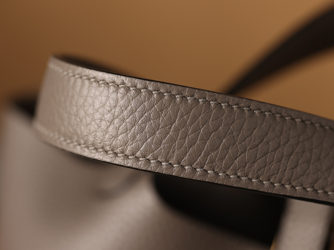 獨家純手工定製高仿包包HermesPicotinLock系列,可根據原裝正品多種款式不同尺寸1:1復刻還原.這一隻高仿Hermes菜籃子錫器灰採用高端進口源產皮革TC皮(TaurillonClemence),專注水桶包原有包體相對應打造立體感,匹配了TC皮原有的皮實垂重感附有明顯的流暢絲滑.從包身的表面呈現飽滿的顆粒紋路,TC皮正是取自公牛皮頸部作為源有材質,紋路粗細中帶有啞光色澤,與原裝正品比對完全達到百分百無任何瑕疵.