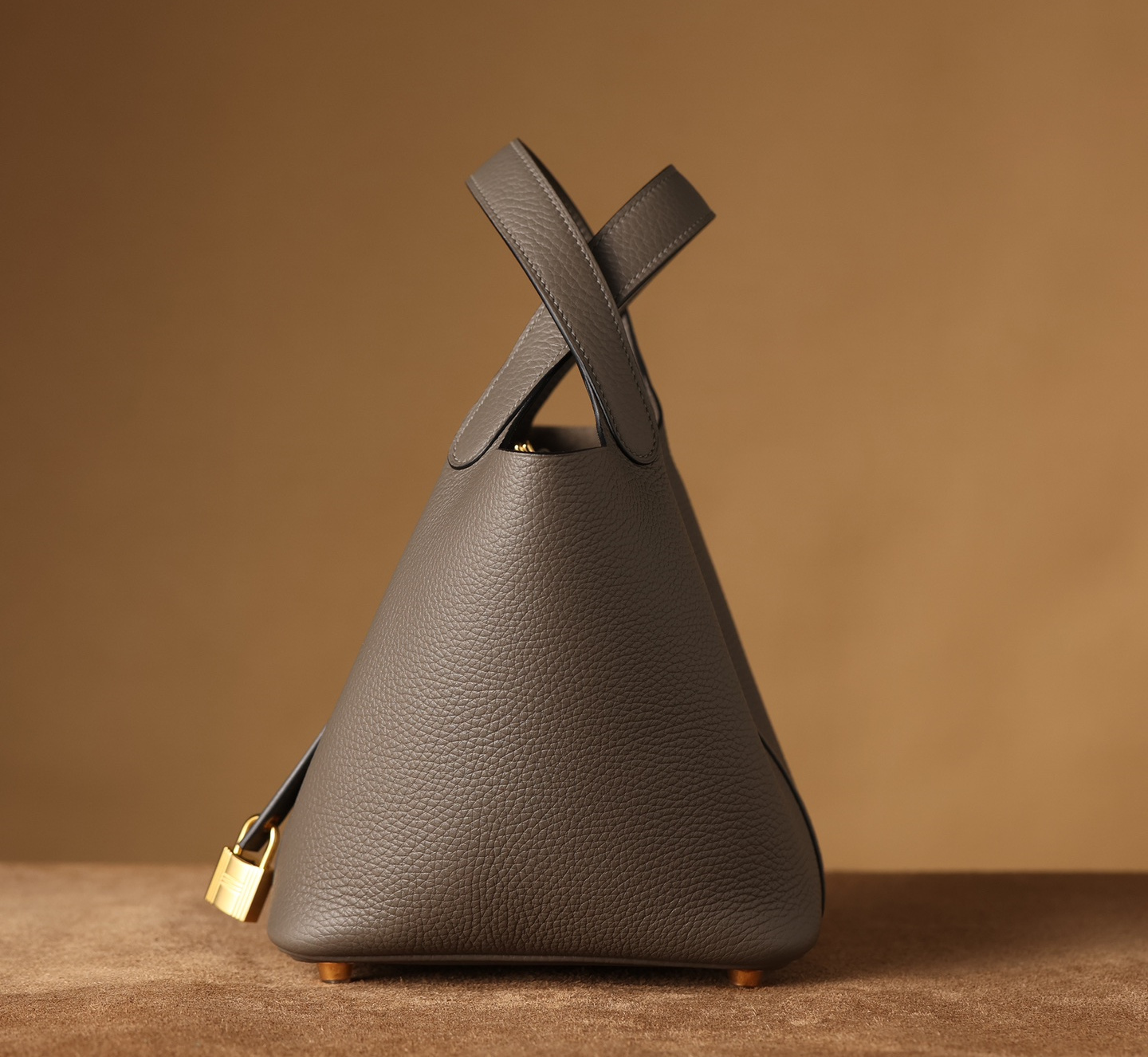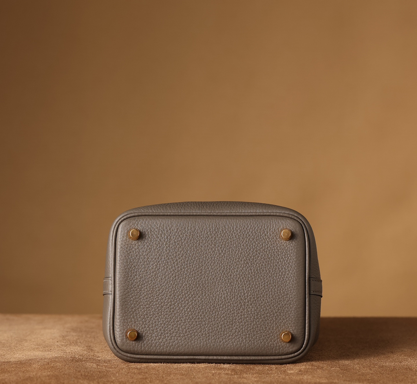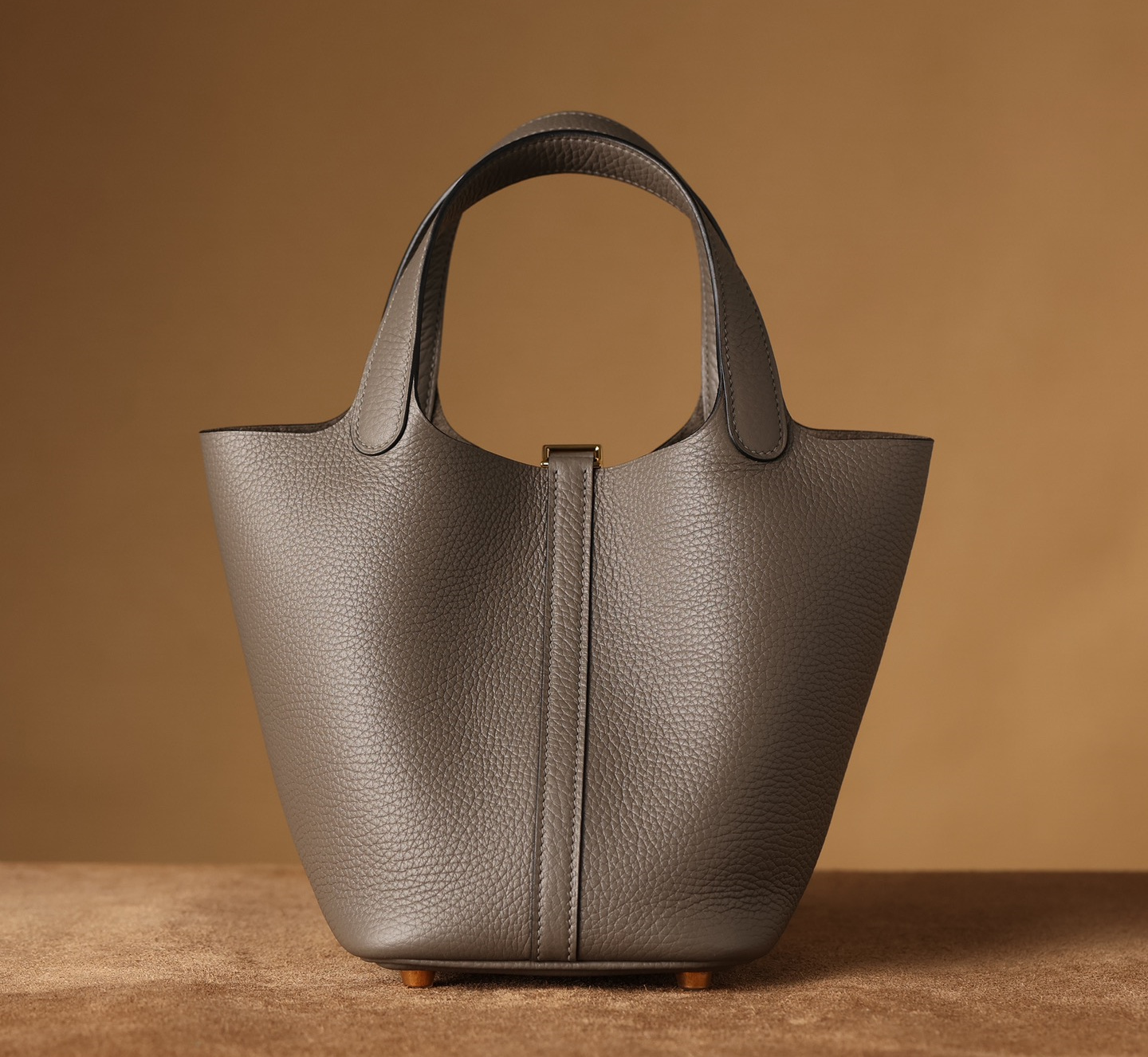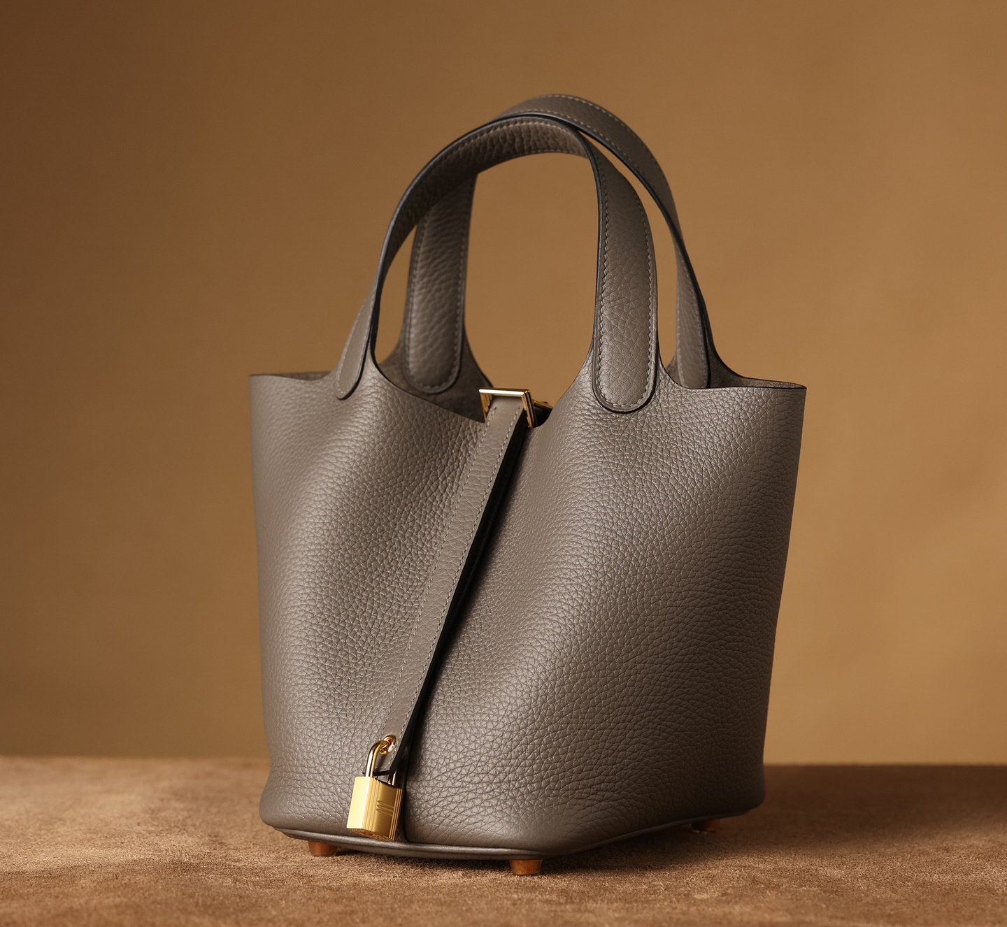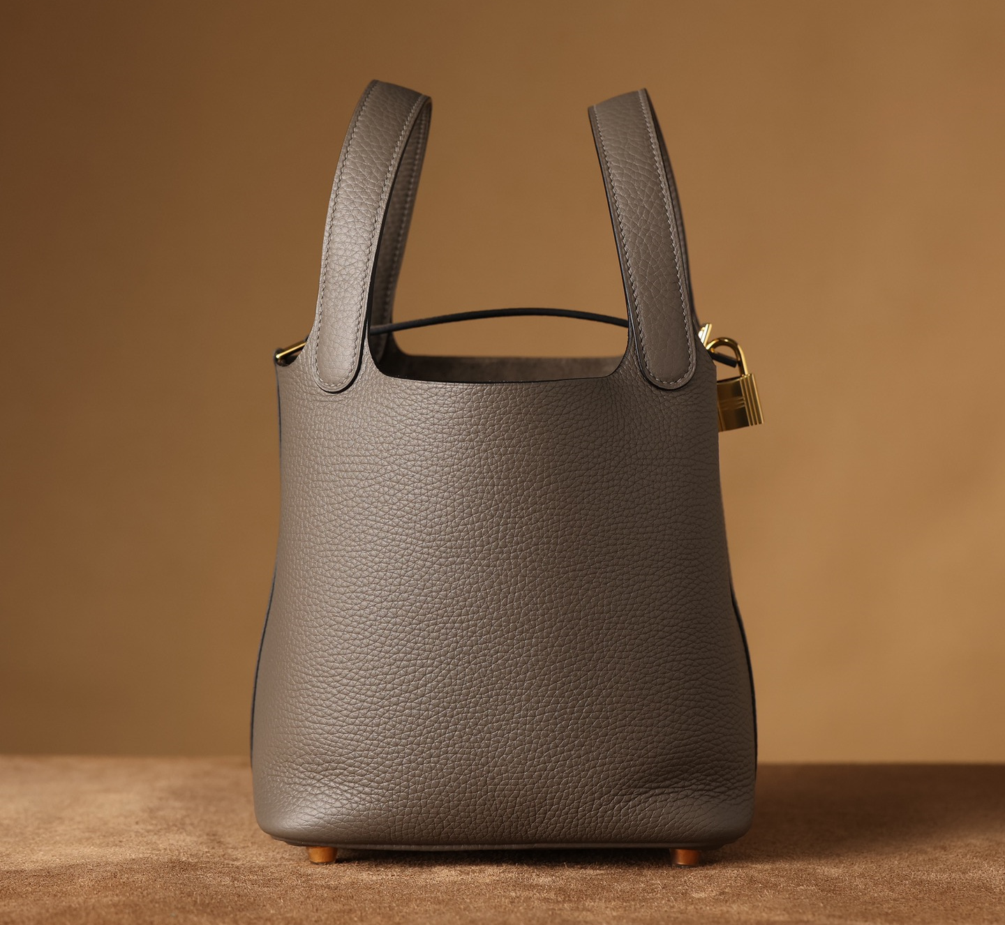獨家純手工定製高仿包包HermesPicotinLock系列,可根據原裝正品多種款式不同尺寸1:1復刻還原.這一隻高仿Hermes菜籃子錫器灰採用高端進口源產皮革TC皮(TaurillonClemence),專注水桶包原有包體相對應打造立體感,匹配了TC皮原有的皮實垂重感附有明顯的流暢絲滑.從包身的表面呈現飽滿的顆粒紋路,TC皮正是取自公牛皮頸部作為源有材質,紋路粗細中帶有啞光色澤,與原裝正品比對完全達到百分百無任何瑕疵.
