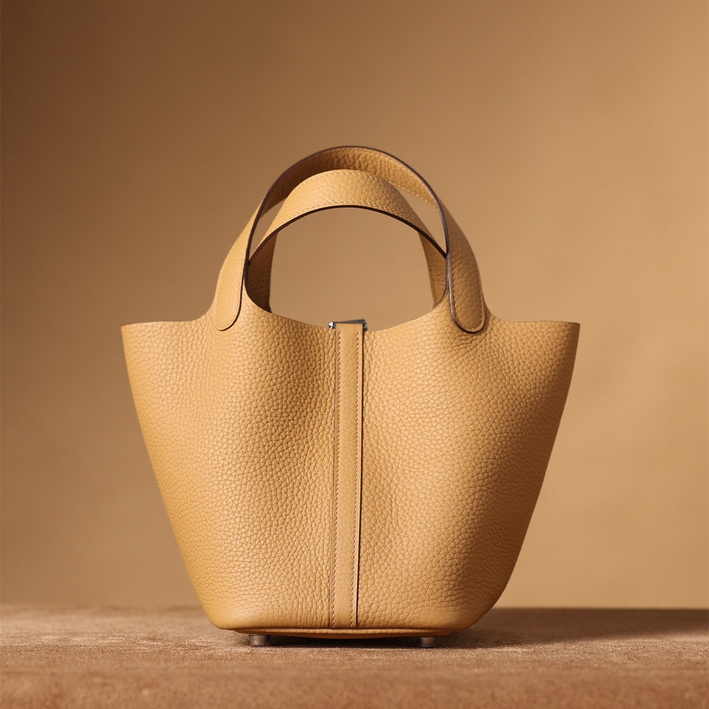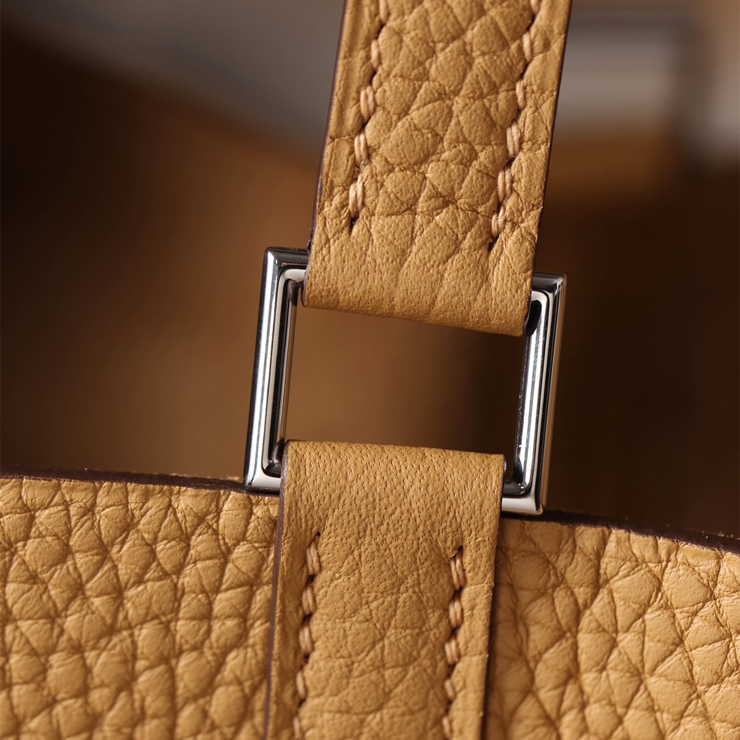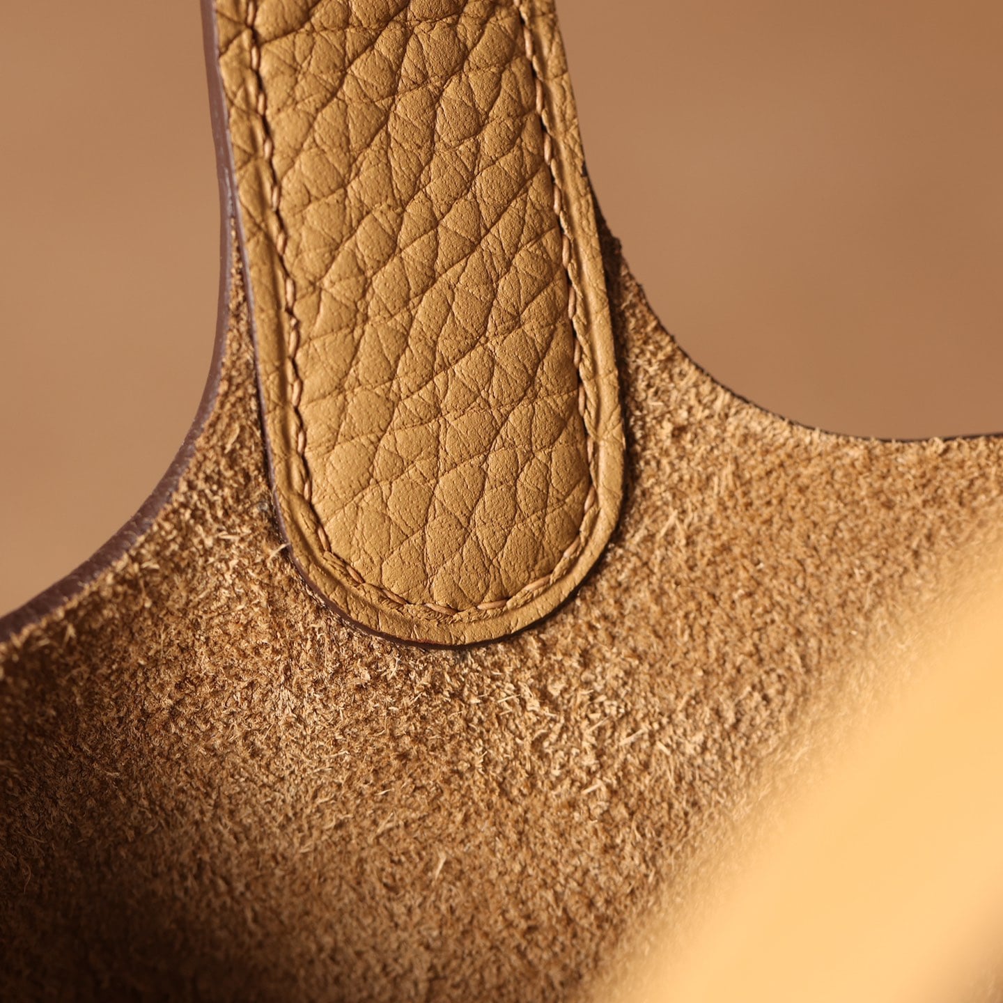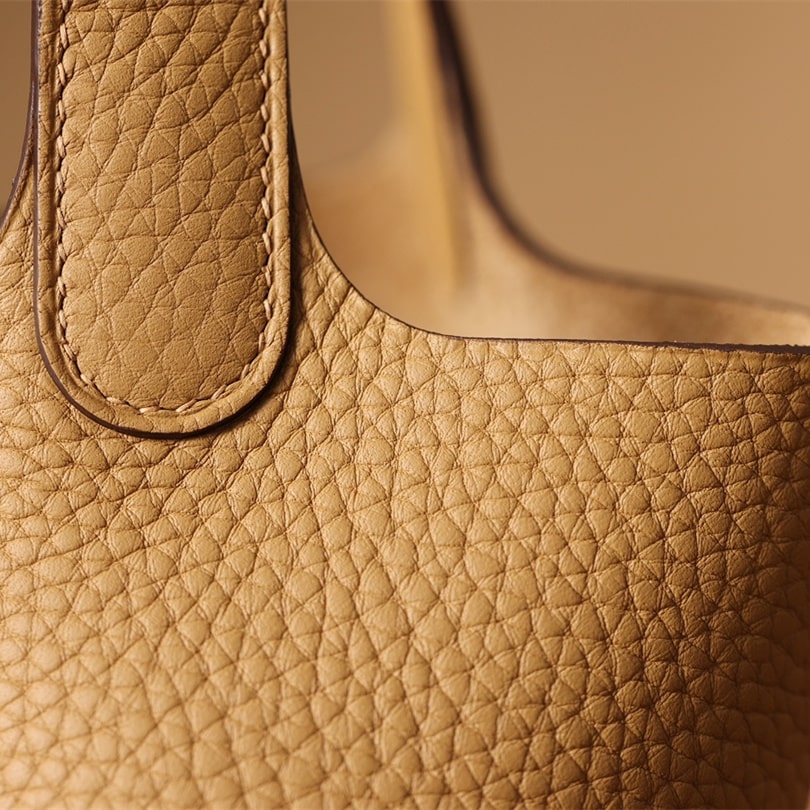 高仿HermesPicotinLock系列手袋展現了手工藝術的非凡魅力,不僅是一件實用的日用品,更是一件精湛工藝的藝術品.工匠們採用了傳統手工技術和現代設計理念的完美結合,每個細節都經過細心雕琢,體現出對品質和美學的極致追求.高仿包包的主材質為優質的TaurillonClemence皮革,俗稱TC皮,這種皮革選自成年公牛的頸部,質地堅韌而光滑,表面的顆粒紋路自然細膩,給人一種豐富的視覺和觸感體驗.這種高級皮革不僅有著出色的耐用性,更因其獨特的質感和光澤,成為高端奢侈品的首選材料.