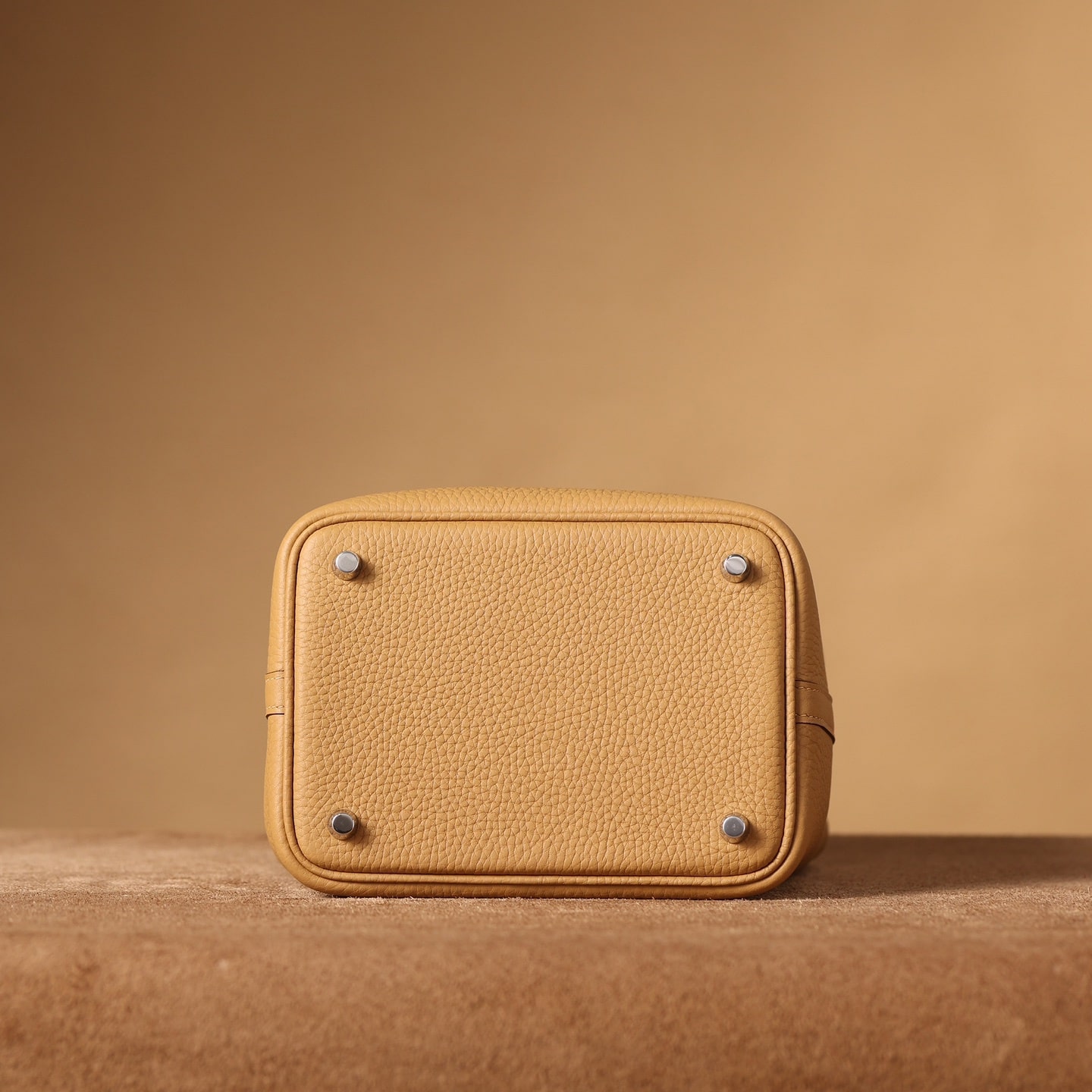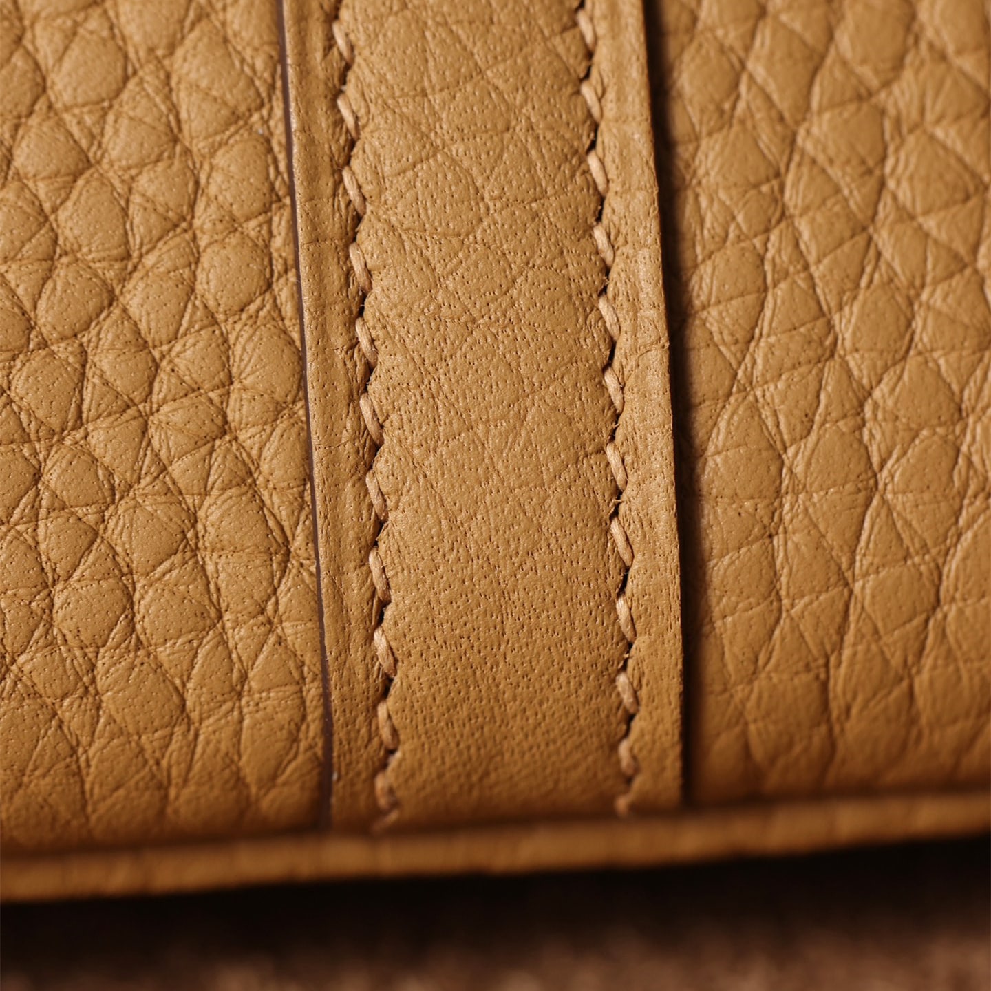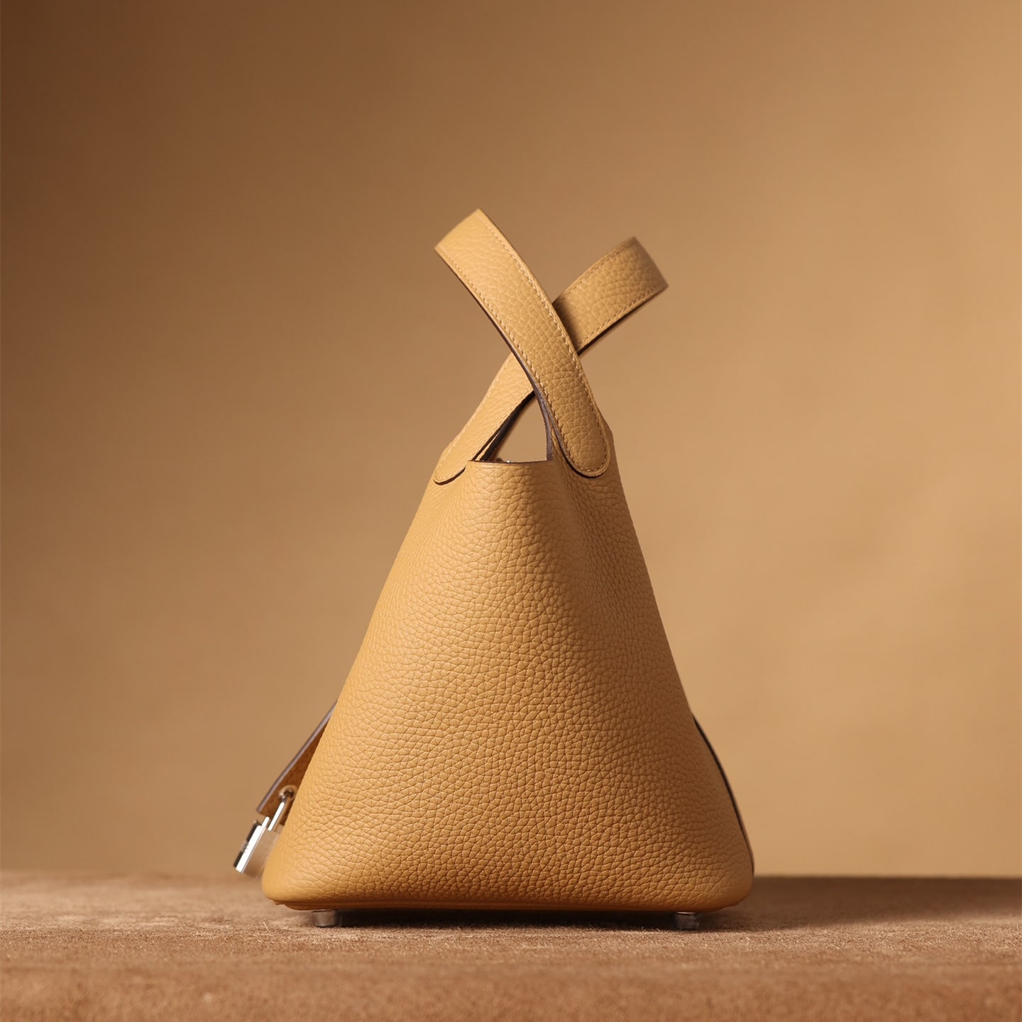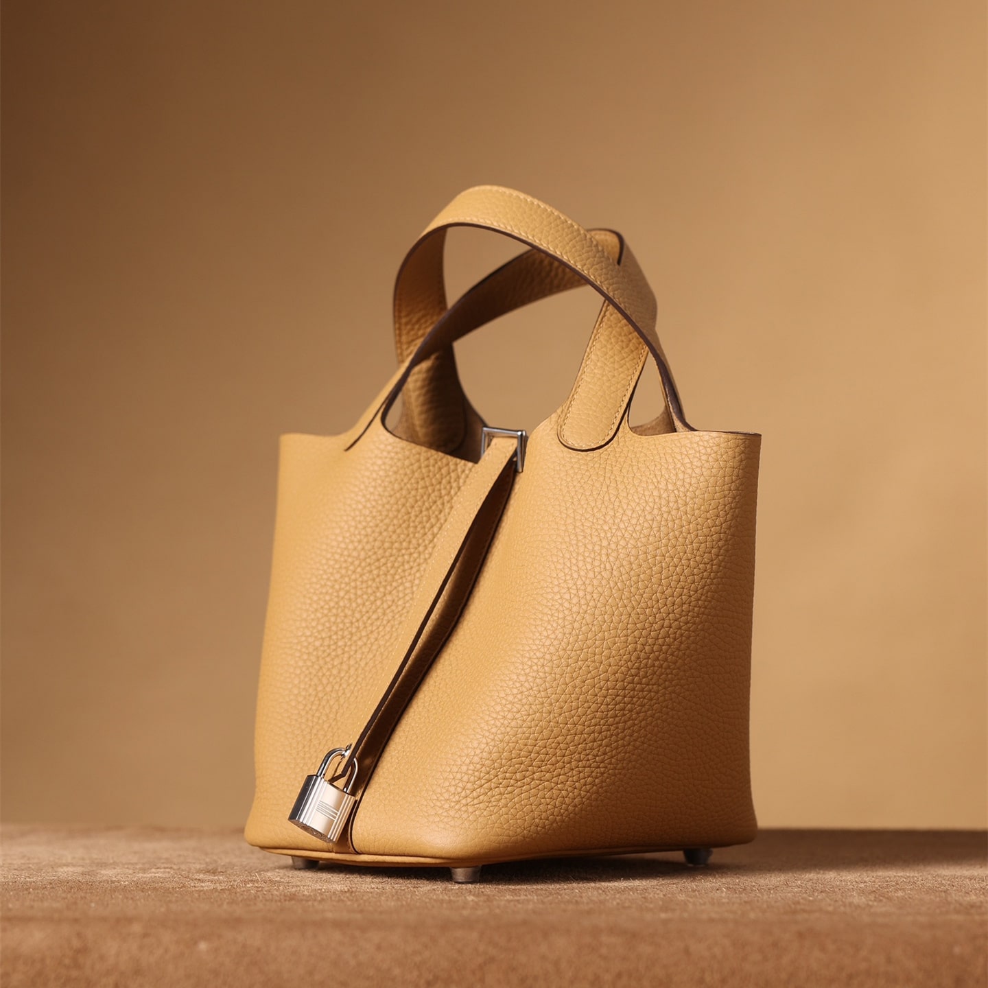 高仿HermesPicotinLock系列手袋展現了手工藝術的非凡魅力,不僅是一件實用的日用品,更是一件精湛工藝的藝術品.工匠們採用了傳統手工技術和現代設計理念的完美結合,每個細節都經過細心雕琢,體現出對品質和美學的極致追求.高仿包包的主材質為優質的TaurillonClemence皮革,俗稱TC皮,這種皮革選自成年公牛的頸部,質地堅韌而光滑,表面的顆粒紋路自然細膩,給人一種豐富的視覺和觸感體驗.這種高級皮革不僅有著出色的耐用性,更因其獨特的質感和光澤,成為高端奢侈品的首選材料.