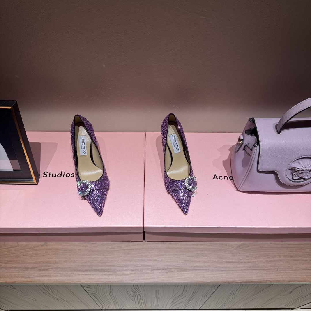 高仿JimmyChoo*MELVA74水晶塔扣尖頭高踭鞋晶片紫色7CM免檢版