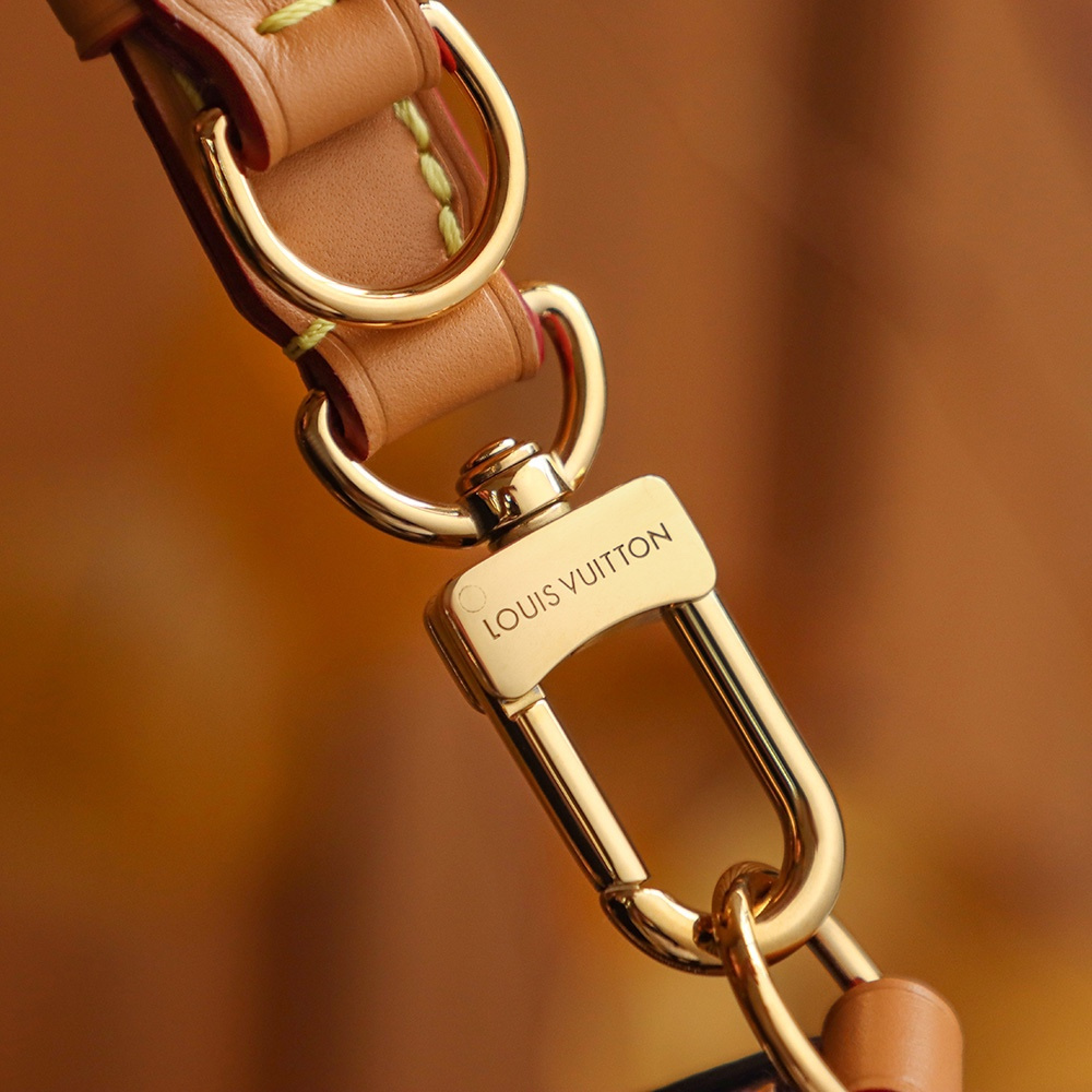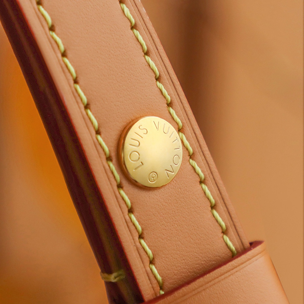 細緻三大工藝完成呈現出應有的包體結構.同時在右邊下角皮革包邊部分高仿包包專屬壓印了LV英文LOGO,深度和燙印基礎都是符合原版製作.法國進口羊毛棉線純手工縫製,針對穿孔縫線專門設計外縫線與內縫線完成融合.