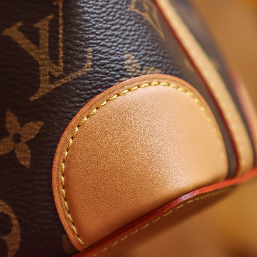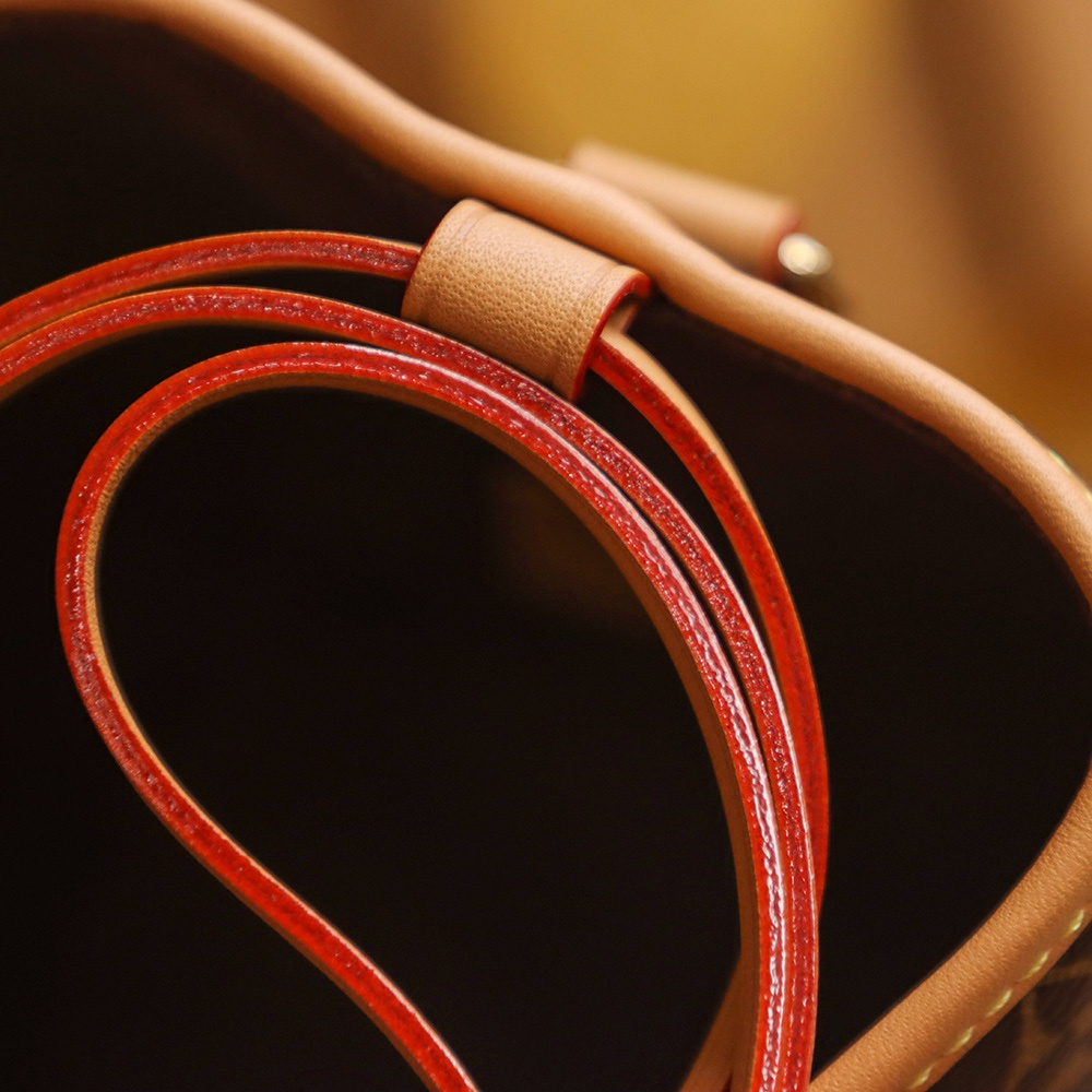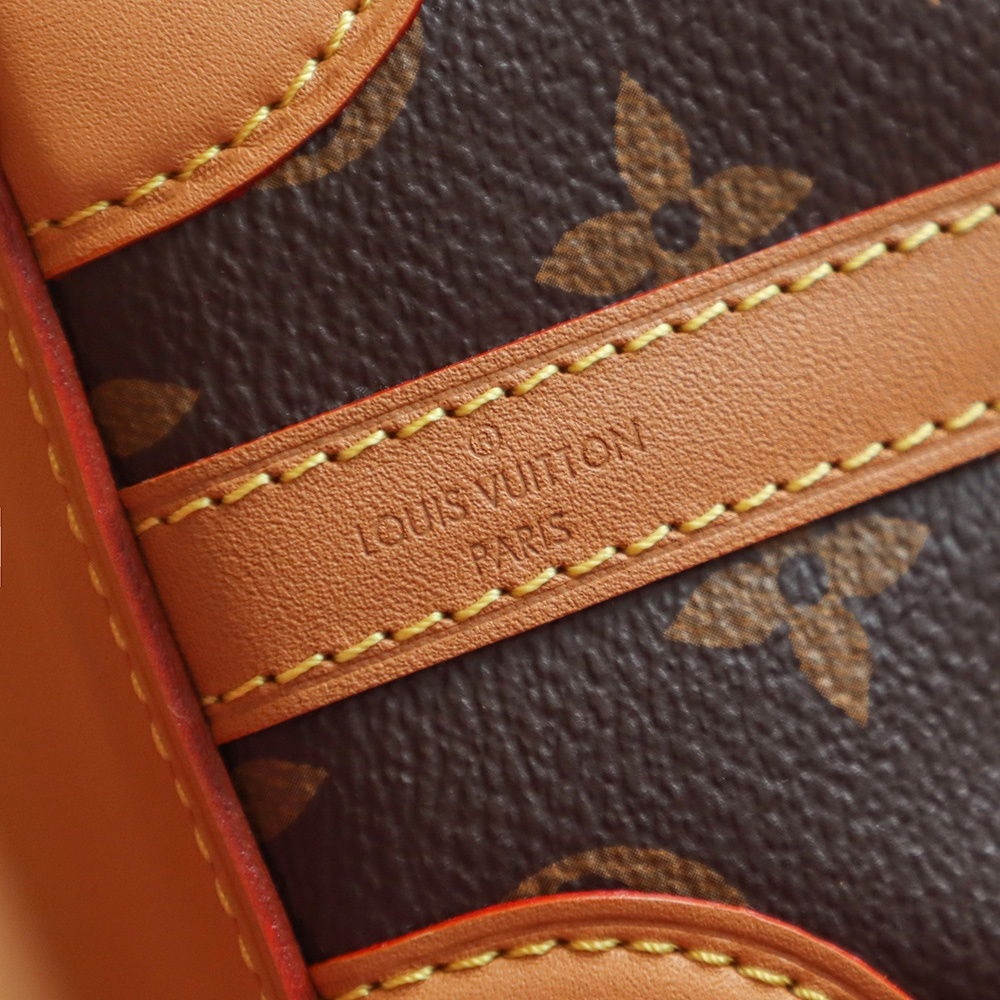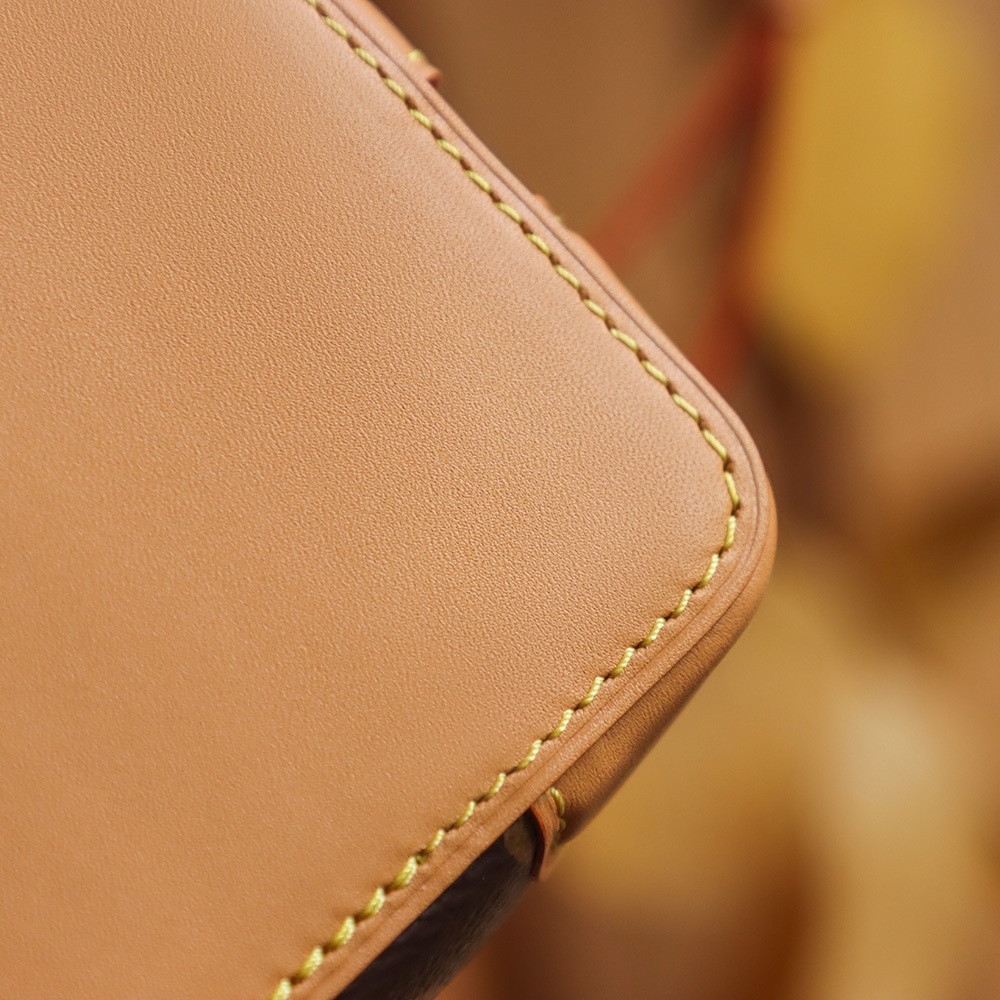 經典老花的款式,配備了真皮革底部的包裹.原單LV水桶包純手工縫製的線路清晰工整,穿孔位置和百分百與原版一致.而黃色的縫線採用的是法國進口羊毛棉線.這種材質不僅是原產材料,而且附有啞光色澤搭配印花帆布皮革呈現一種高級感.緊實的棉線牢固包體包身,完全沒有任何瑕疵.