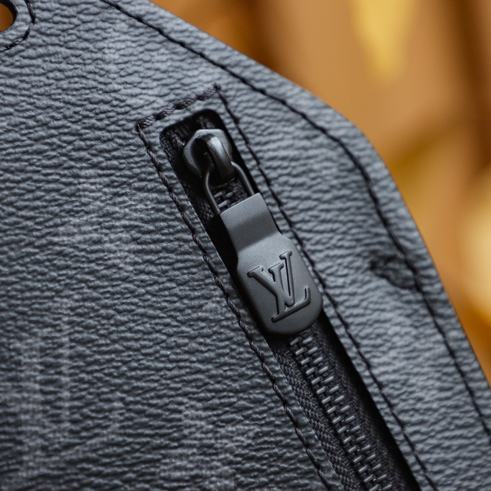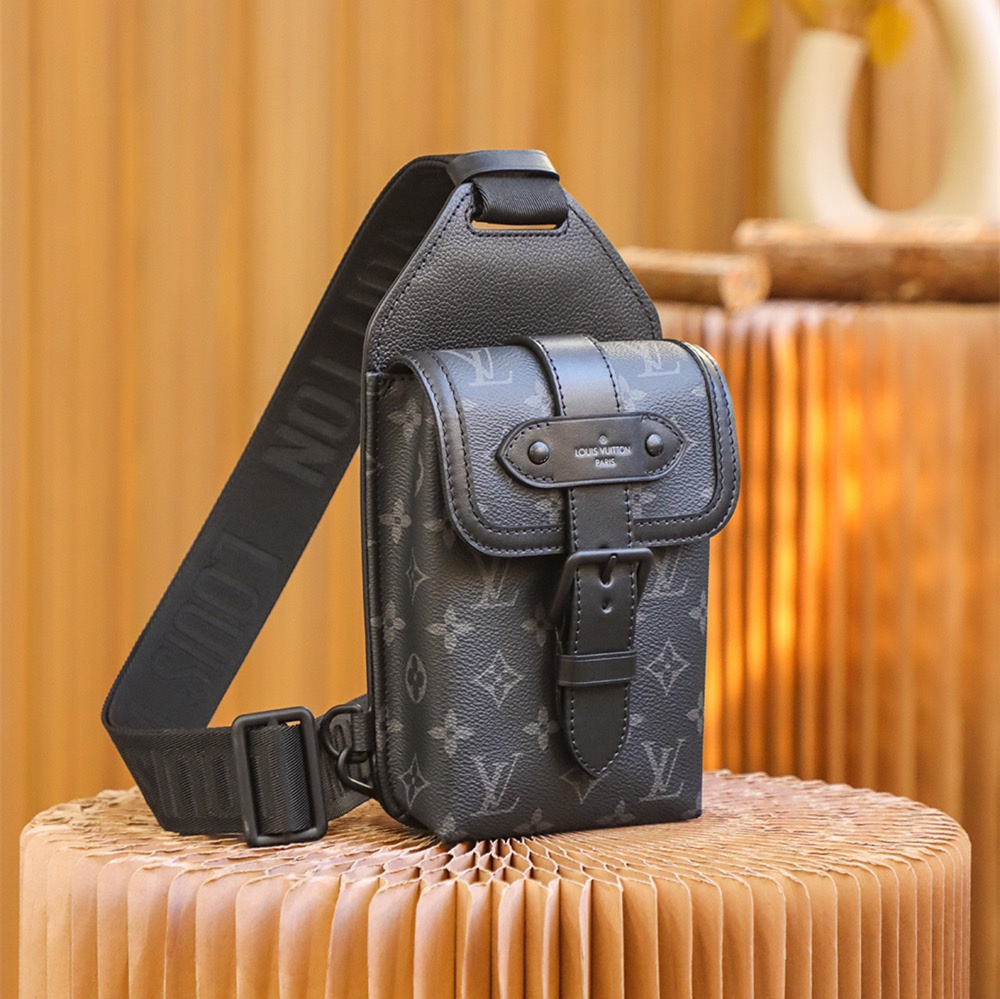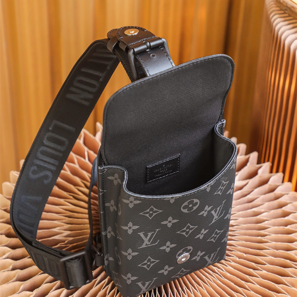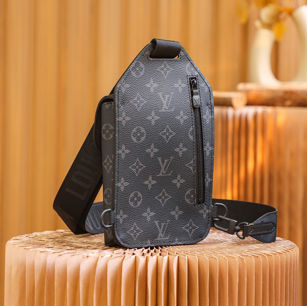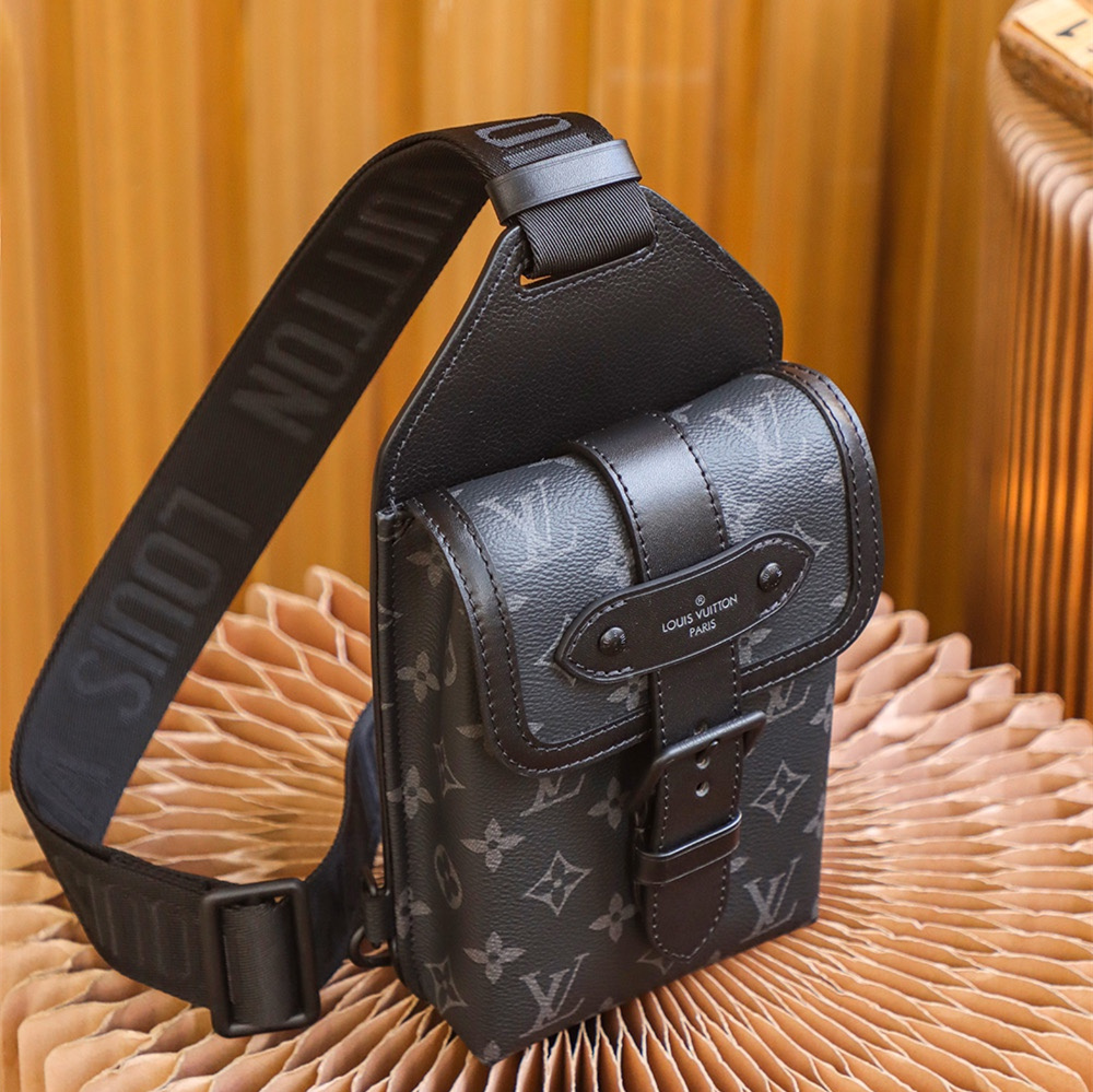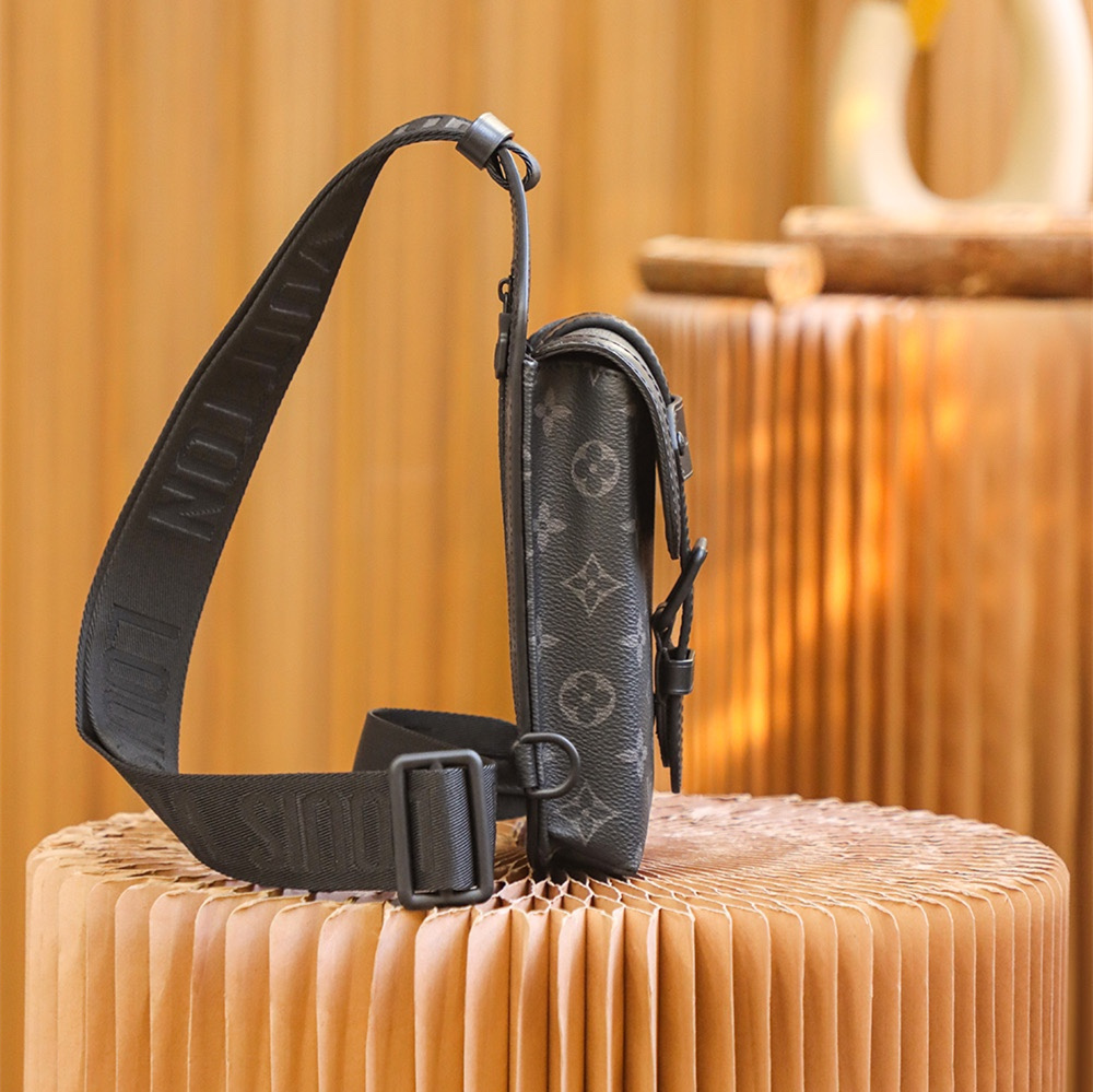 高仿LV男款單肩胸包黑花帆布免檢版
