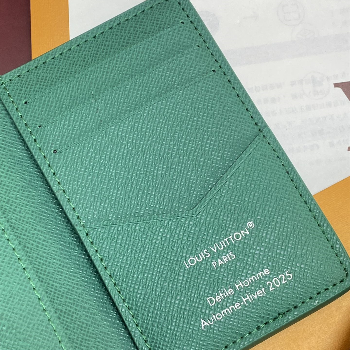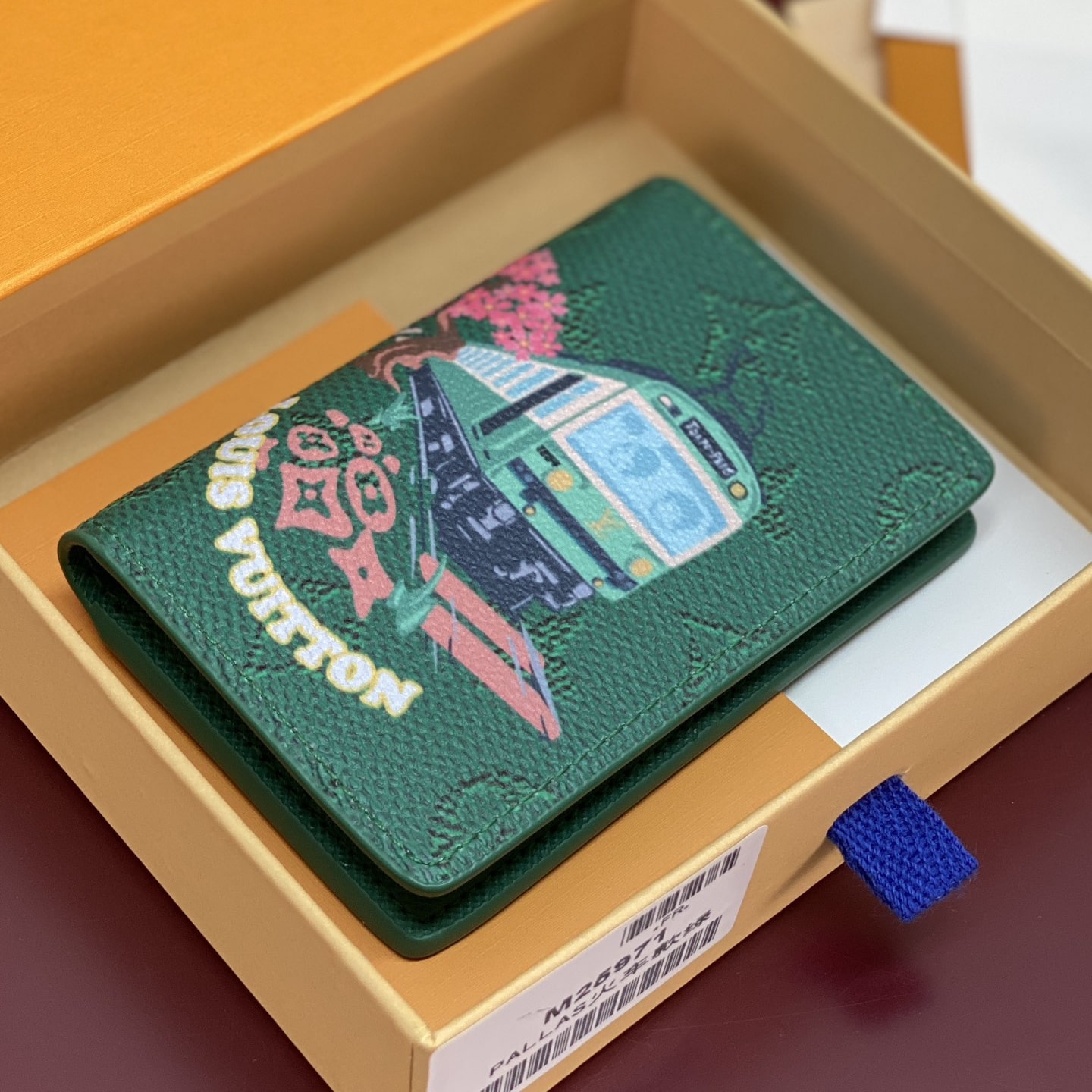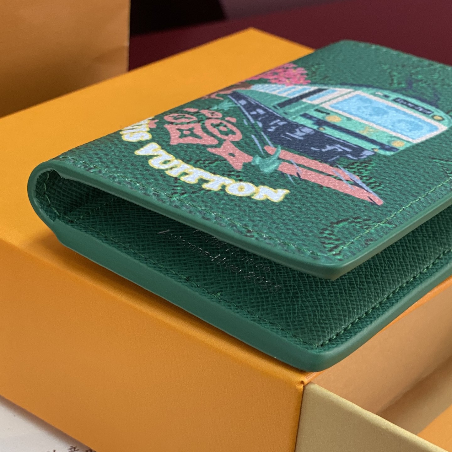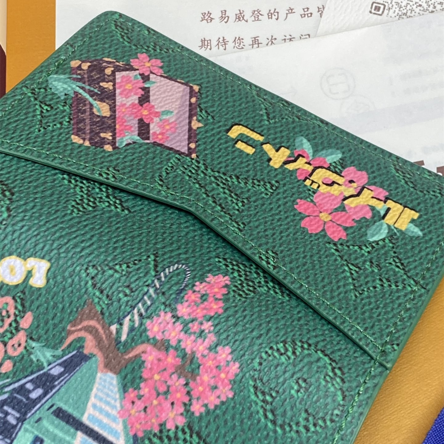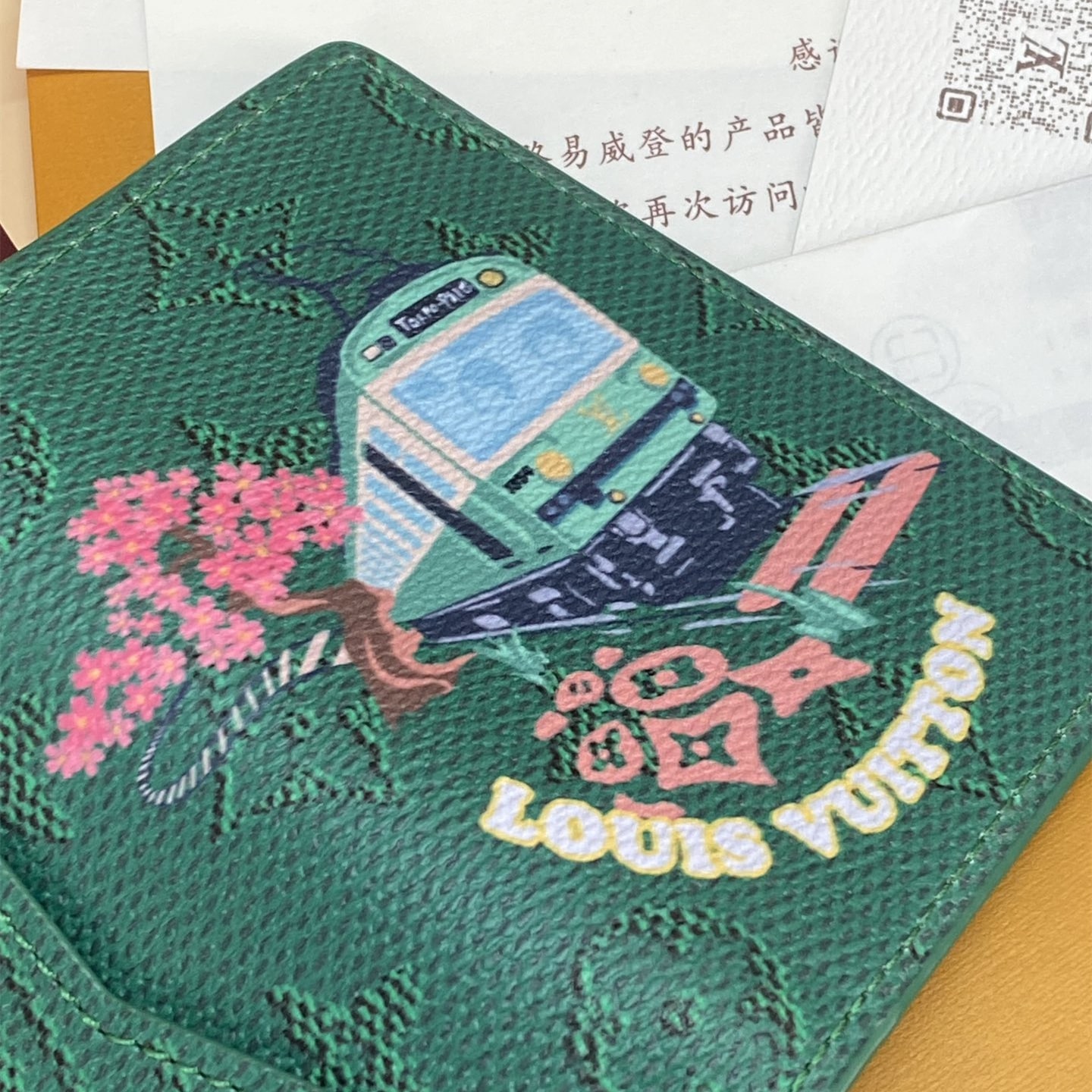 高仿LV與Nigo聯名出品的M25971火車綠護照封套,這款卡夾以彩色Monogram帆佈製造,綴以活潑的印花圖案,可放置多種信用卡,八達通,銀行卡以及相關錢幣.