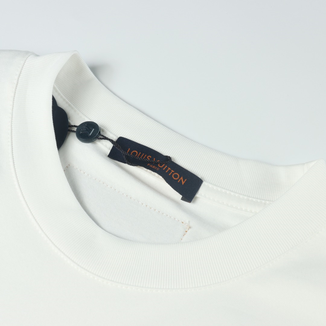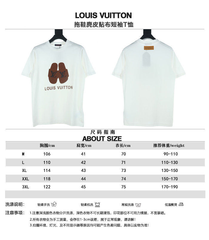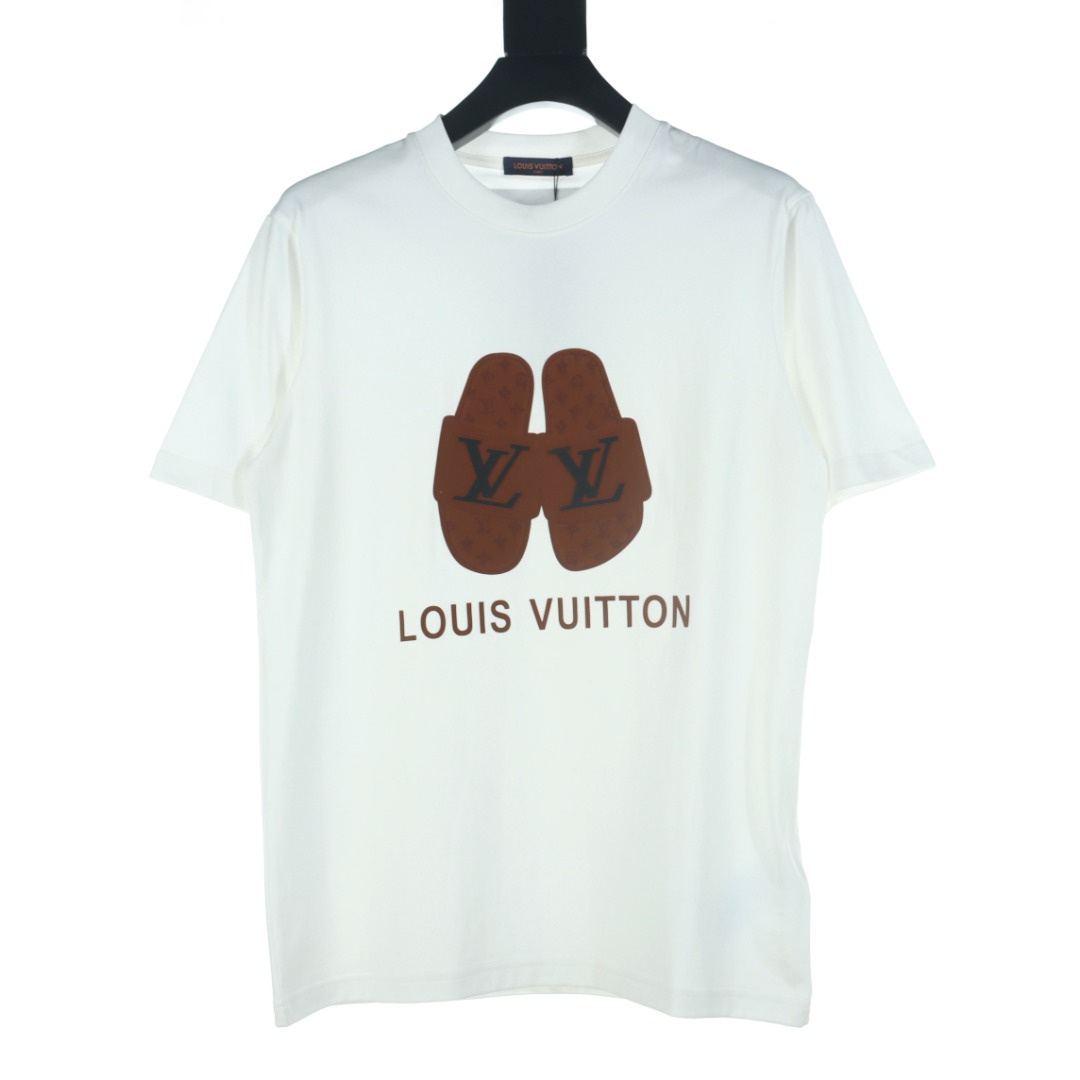 VUITTON/路易威登拖鞋麂皮貼佈短袖T恤.胸前印花短袖採用60支雙股,270g全棉面料.上身透氣,絕不起球,手感柔軟舒適,全衣平車走線立體剪裁.胸前logo為刻字,非印花工藝.領口,下擺雙窄針平車.定制側標,輔料齊全,質感十足,全套定制還原最真實的百分百質感,訂制官網原版四標.