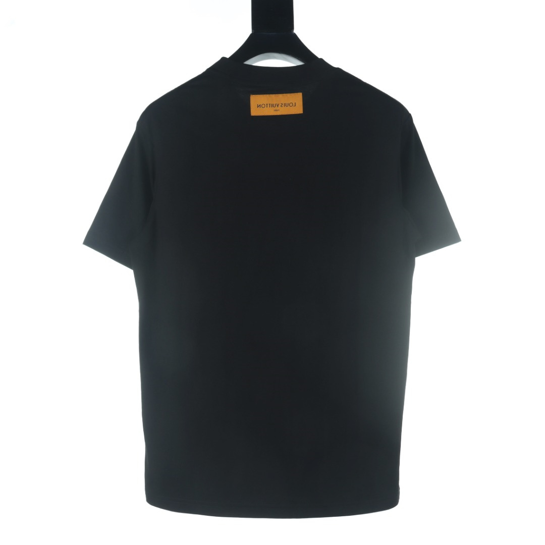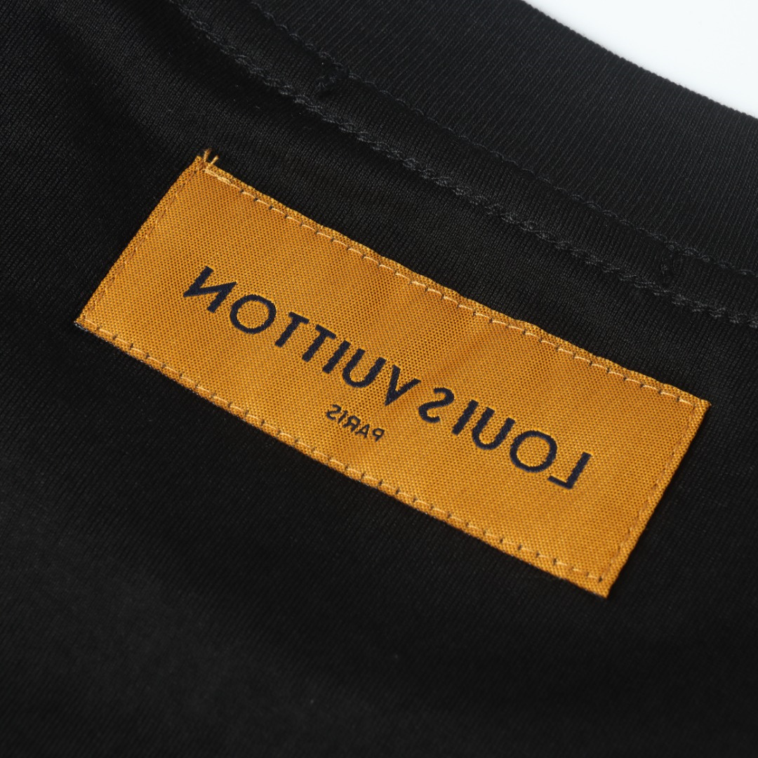 VUITTON/路易威登拖鞋麂皮貼佈短袖T恤.胸前印花短袖採用60支雙股,270g全棉面料.上身透氣,絕不起球,手感柔軟舒適,全衣平車走線立體剪裁.胸前logo為刻字,非印花工藝.領口,下擺雙窄針平車.定制側標,輔料齊全,質感十足,全套定制還原最真實的百分百質感,訂制官網原版四標.