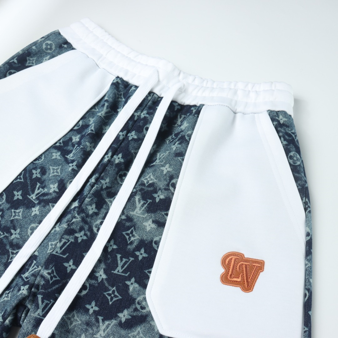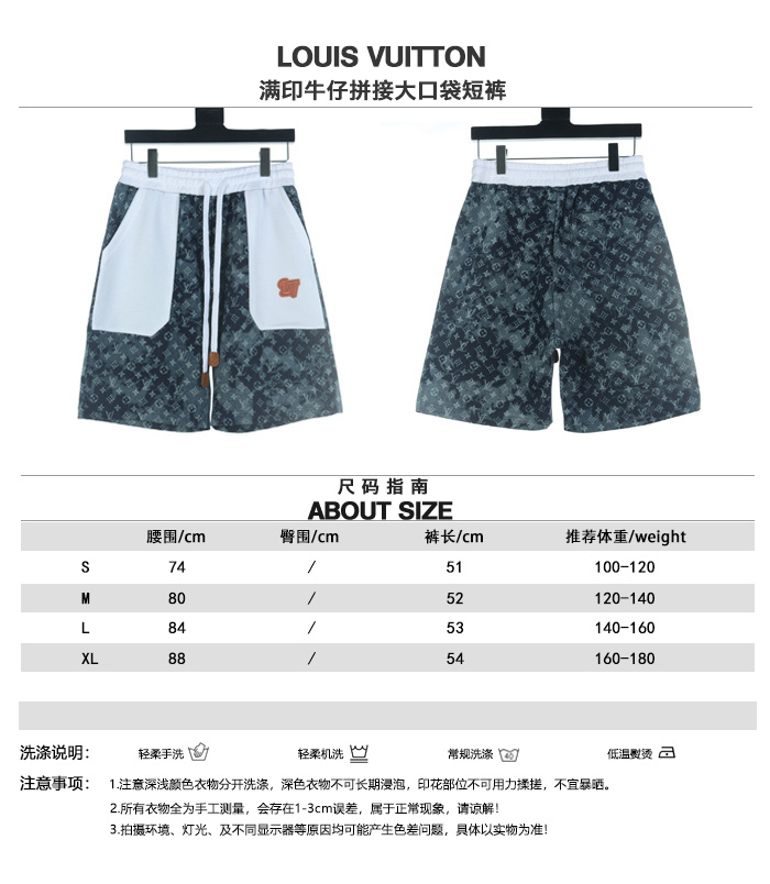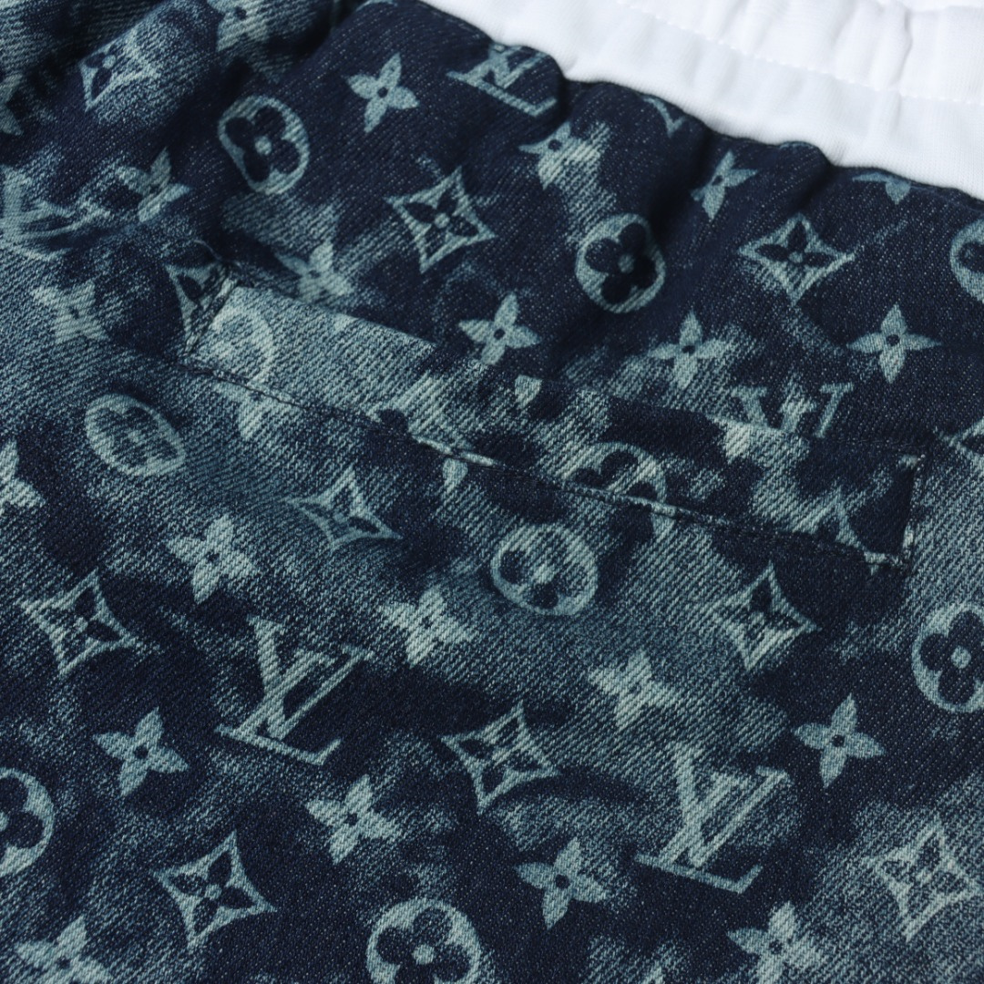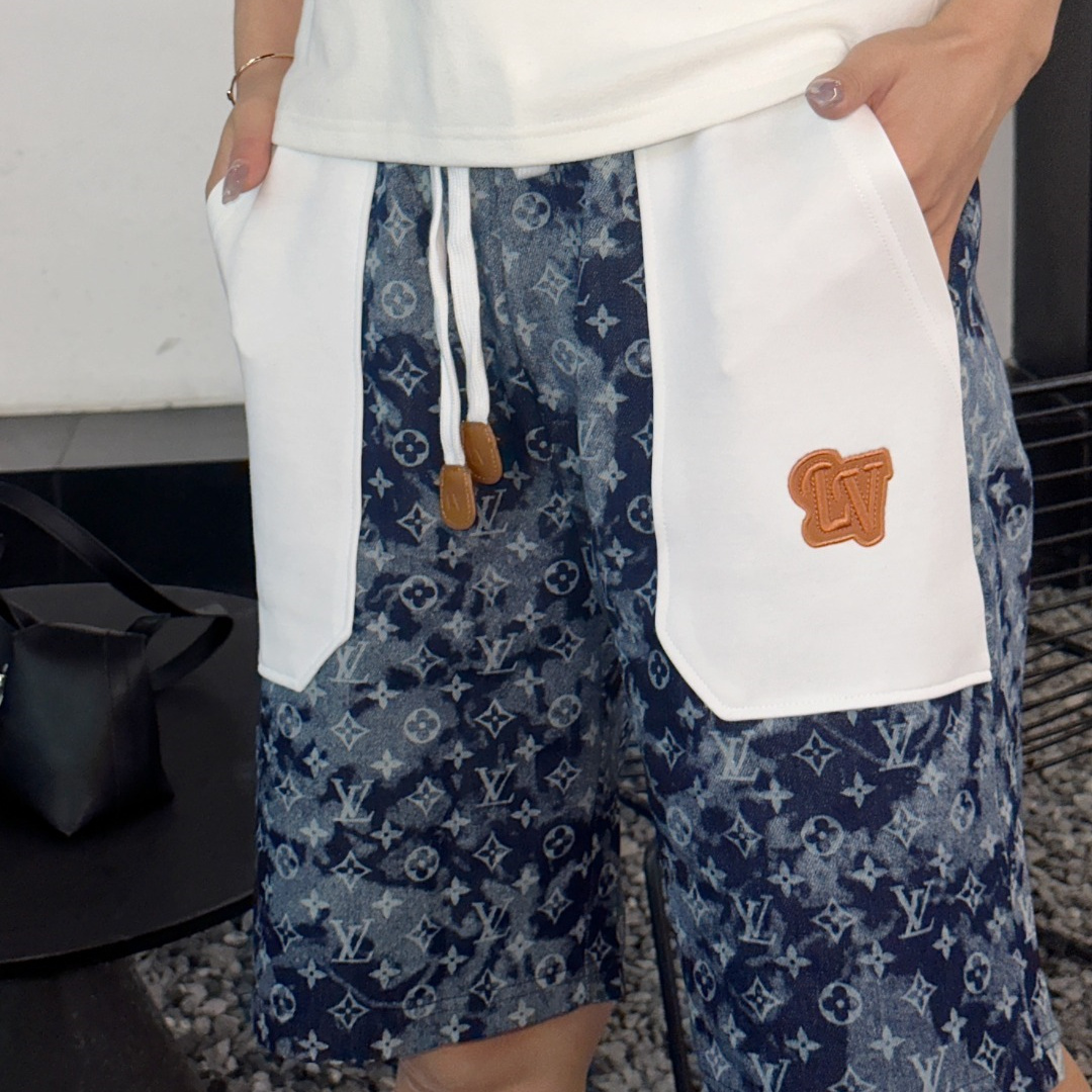 VUITTON路易威登滿印牛仔拼接大口袋短褲.男女同款全新美學靈感趣味設計,渠道性質精品.讓整體造型設計更加優雅時尚,今夏最火繫列,無數明星潮人追捧.裁剪工藝細節處理工整為玩味時尚增添色彩!工整細致,合身的版型構造更是獨具匠心,上身不僅有著出彩的辨識度更是減齡青春.