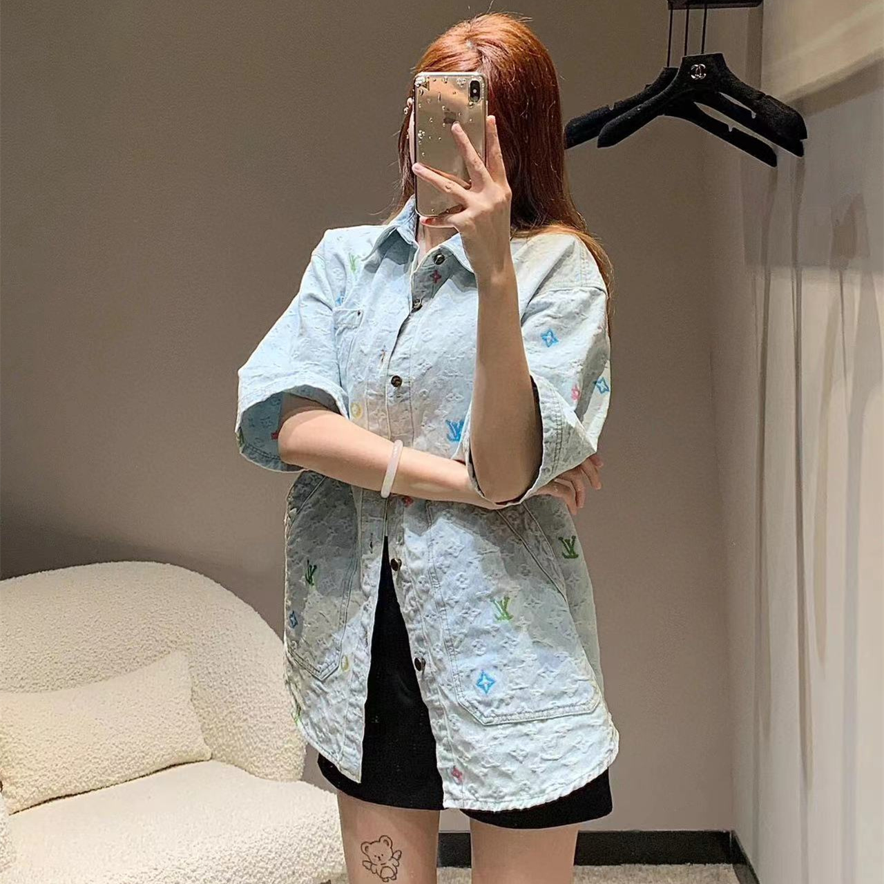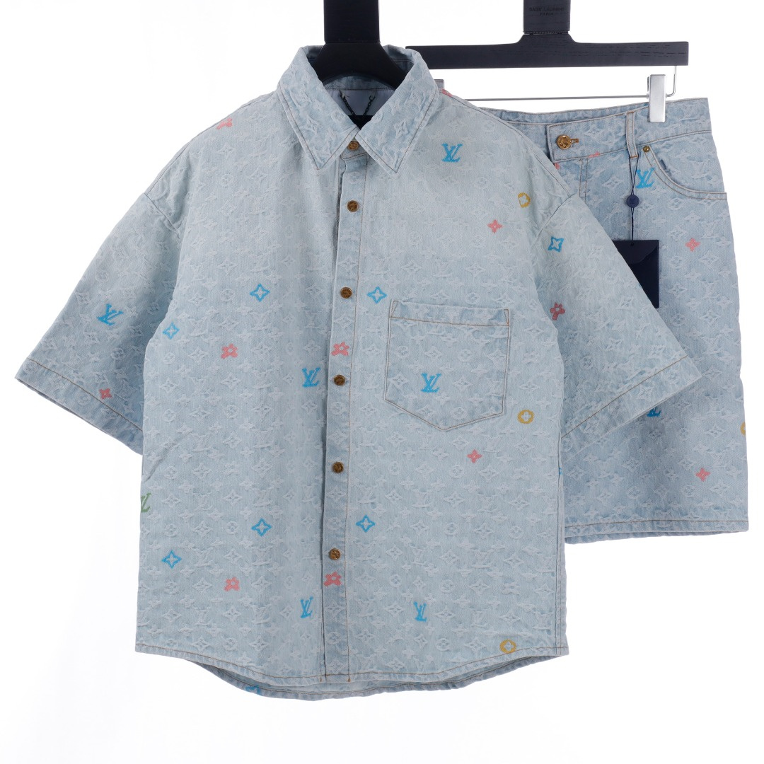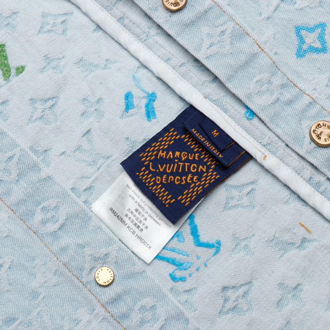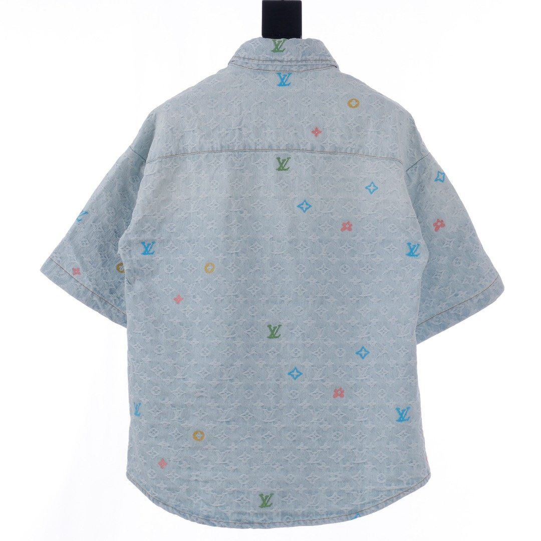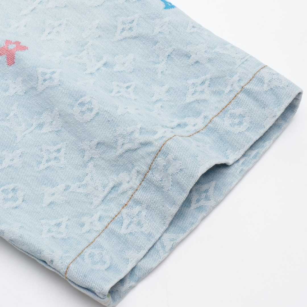LOUIS VUITTON/路易威登淺藍色滿印糖果繡花洗水牛仔短袖外套.全幅 Monogram Craggy提花,點綴剪花細節,做舊金屬刻字紐扣開合門襟,下擺圓弧剪裁細節.