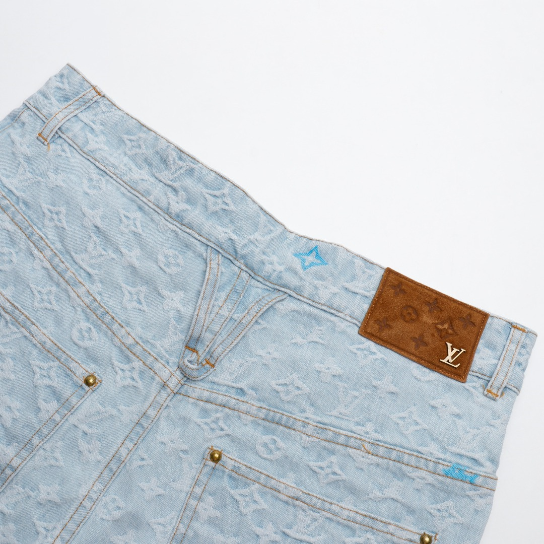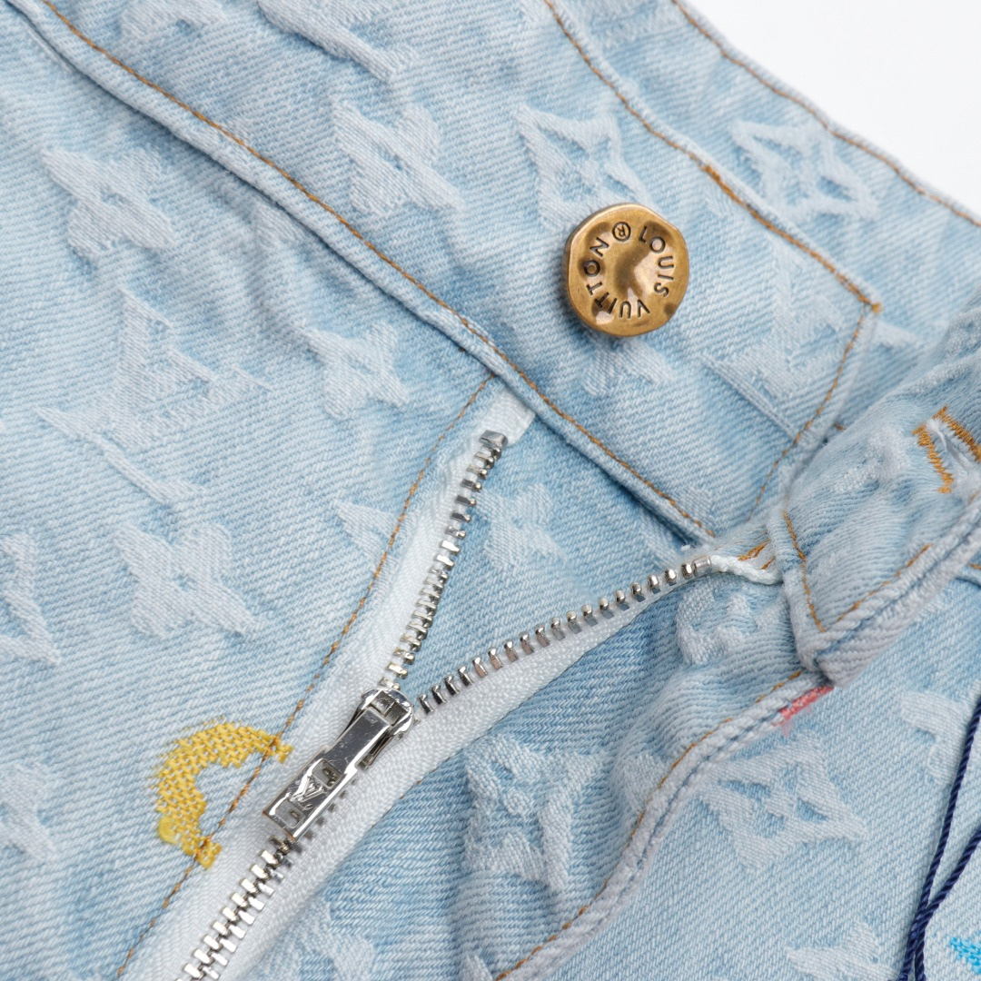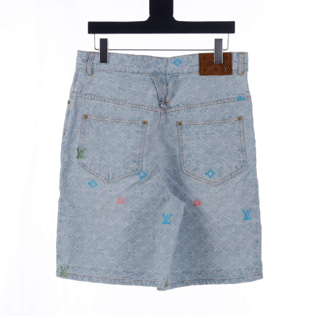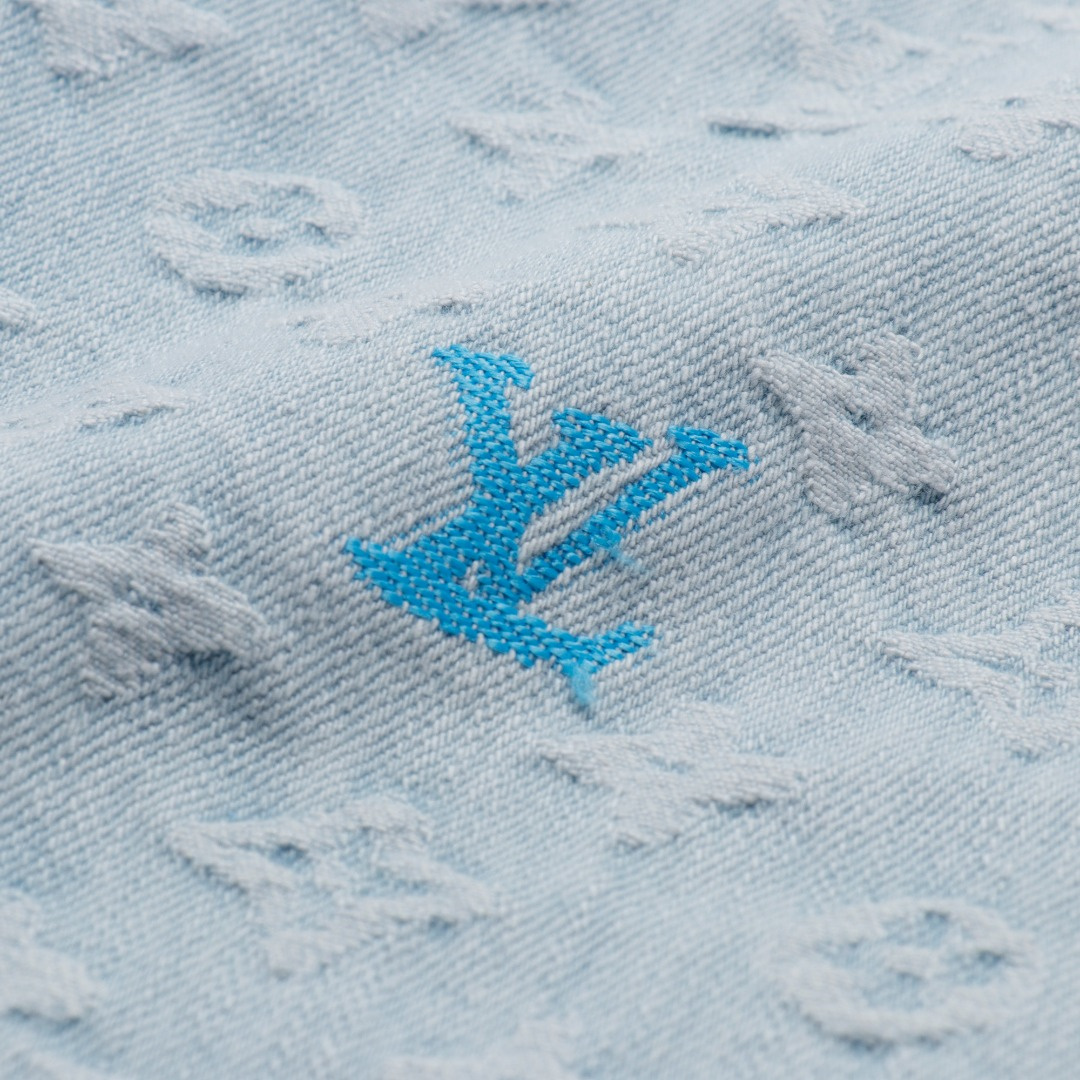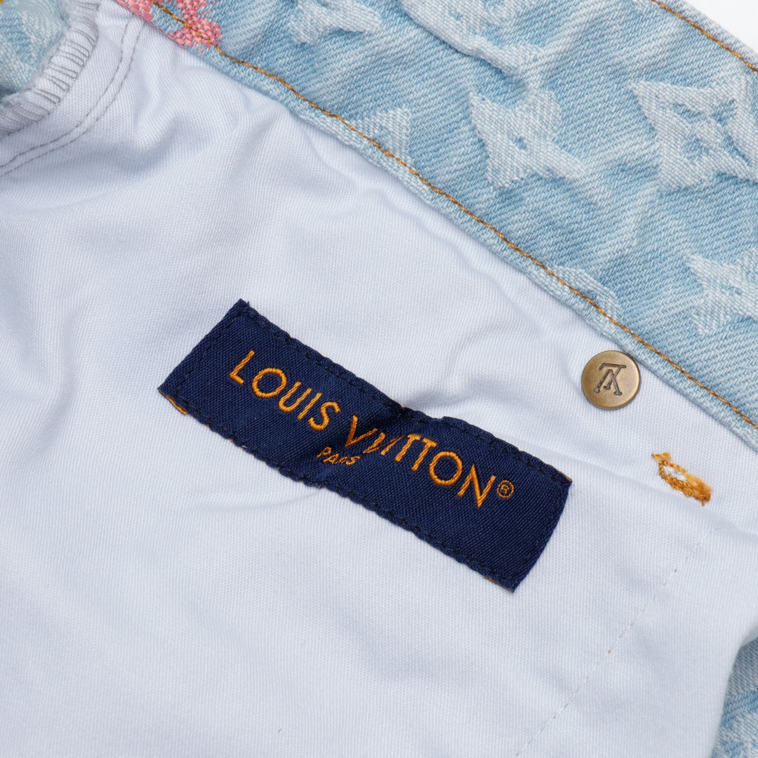 LOUIS VUITTON/路易威登淺藍色滿印糖果繡花洗水牛仔短褲.全幅 Monogram Craggy提花,點綴剪花細節,做舊金屬刻字紐扣開合門襟,下擺圓弧剪裁細節.