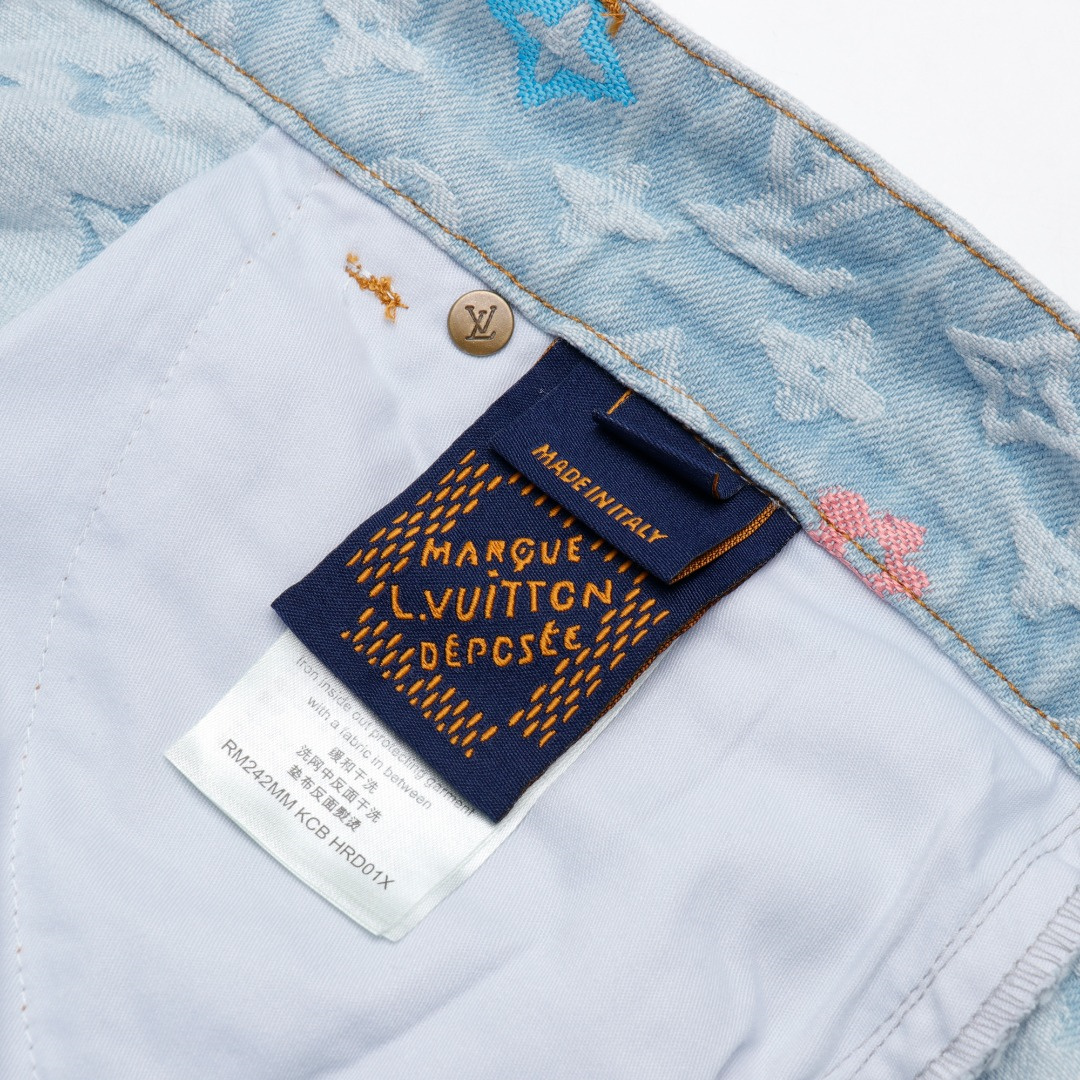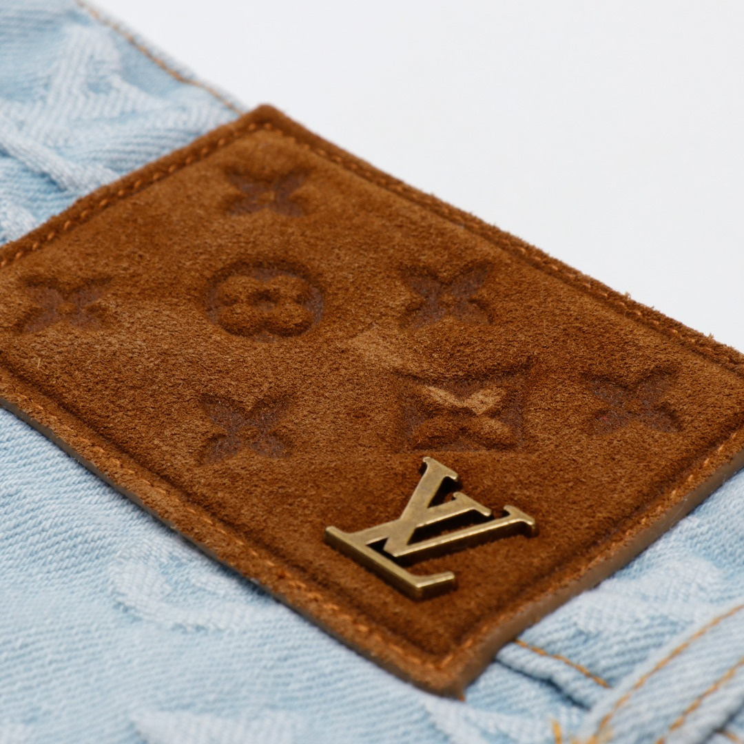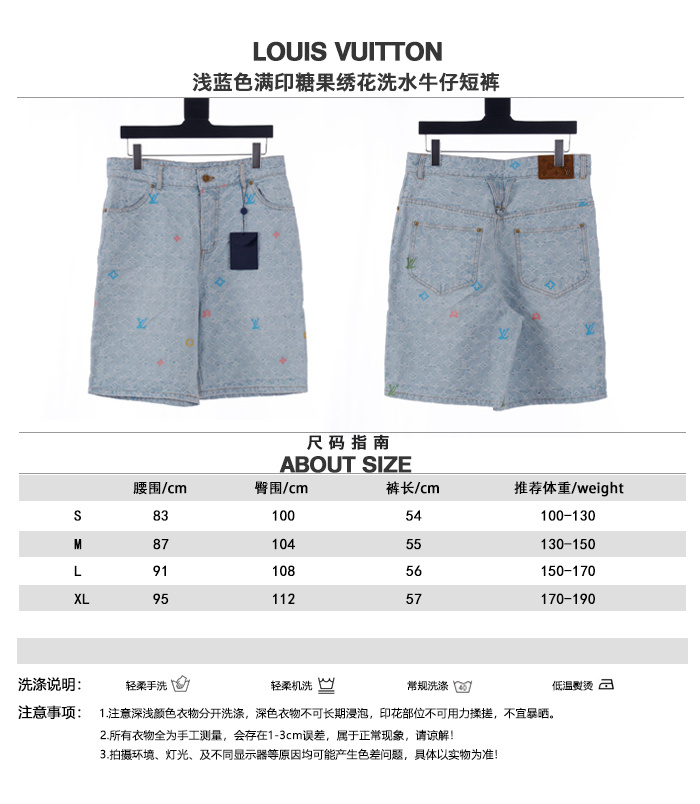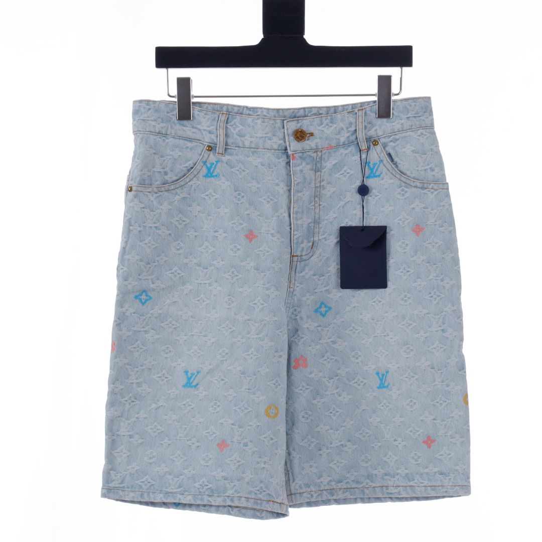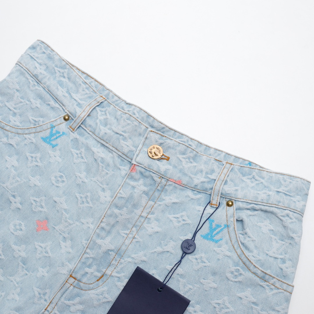 LOUIS VUITTON/路易威登淺藍色滿印糖果繡花洗水牛仔短褲.全幅 Monogram Craggy提花,點綴剪花細節,做舊金屬刻字紐扣開合門襟,下擺圓弧剪裁細節.