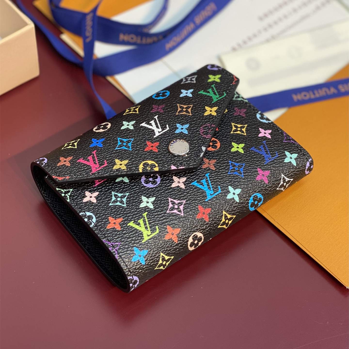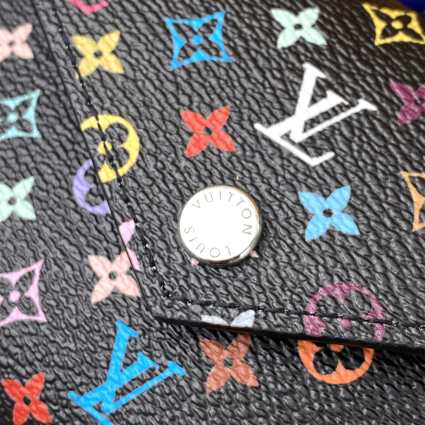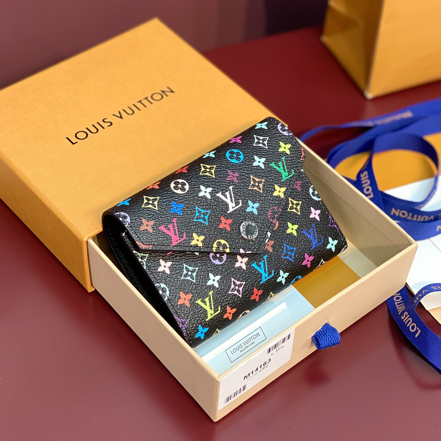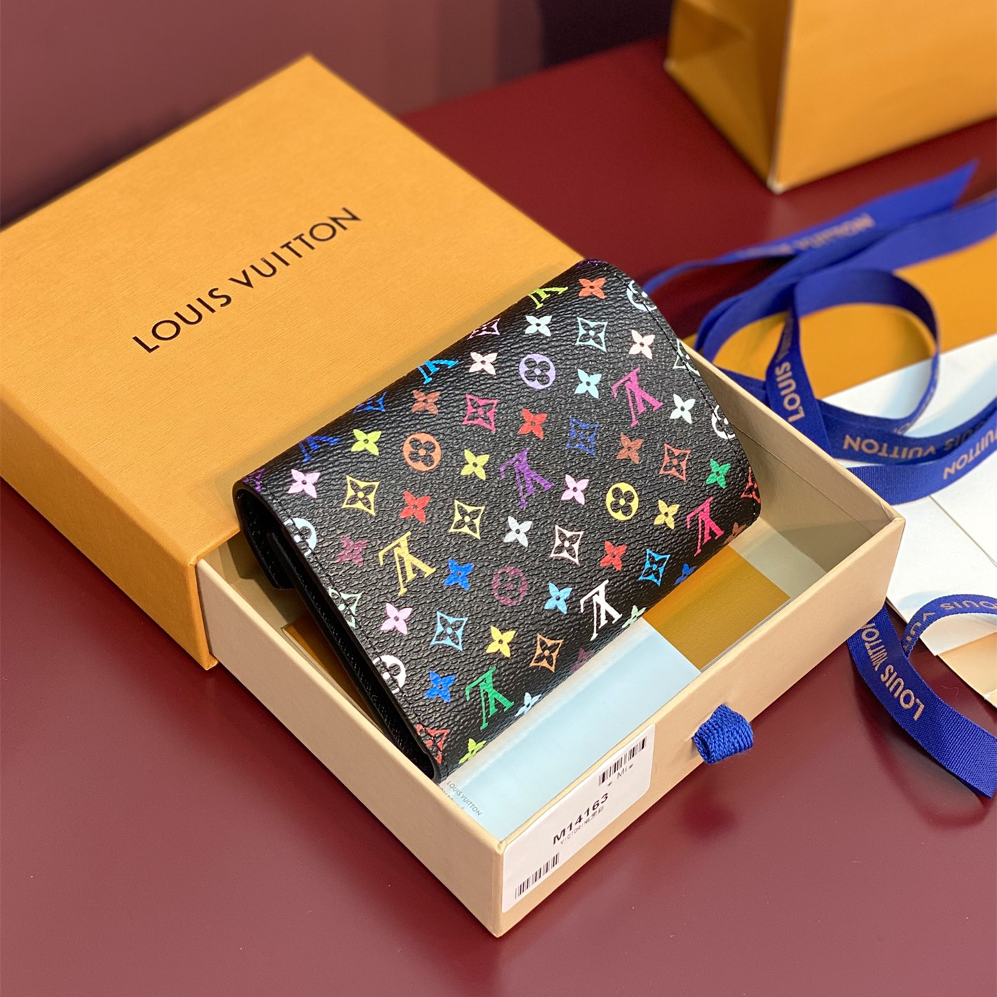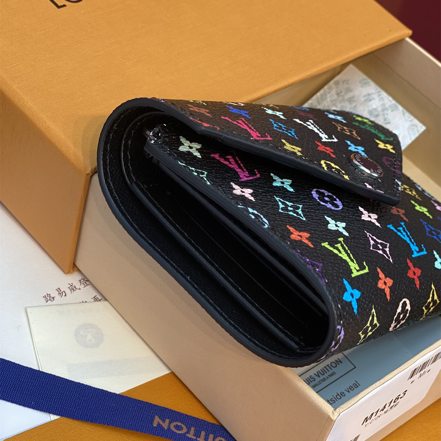 Murakami系列的Victorine錢包M14163黑三彩,小巧精緻繽紛多彩的Monogram圖案以日本藝術家村上隆著名的彩虹色調重新演繹路易威登的經典標誌.錢包採用塗層帆布製成,配有精緻的牛皮襯裡及銀色金屬件,並設有拉鏈零錢格,內部則設有多個隔層,便於收納紙幣及名片.