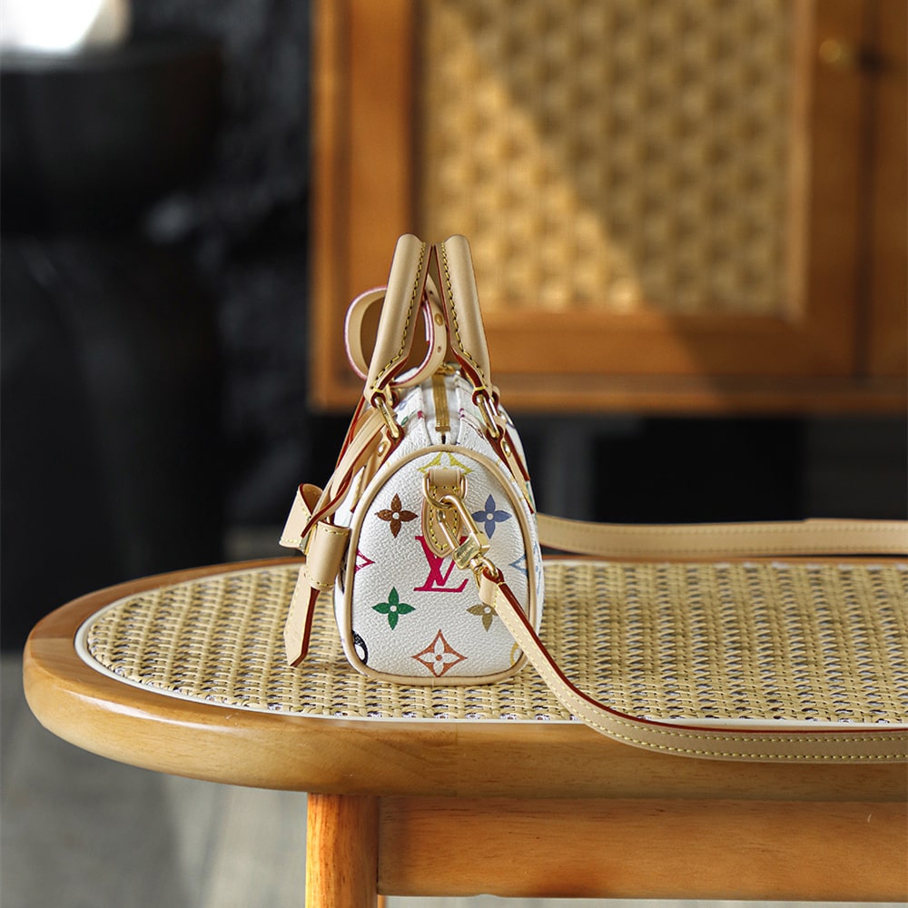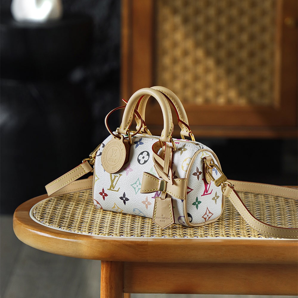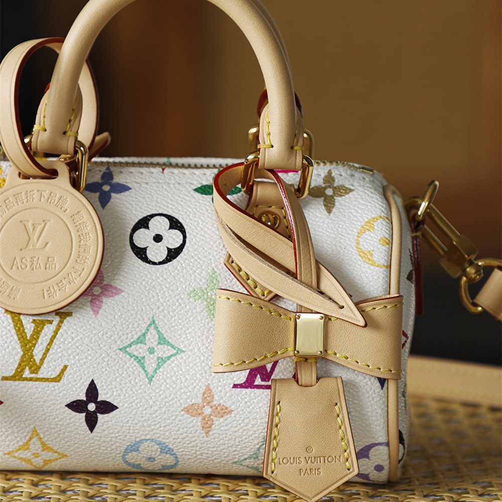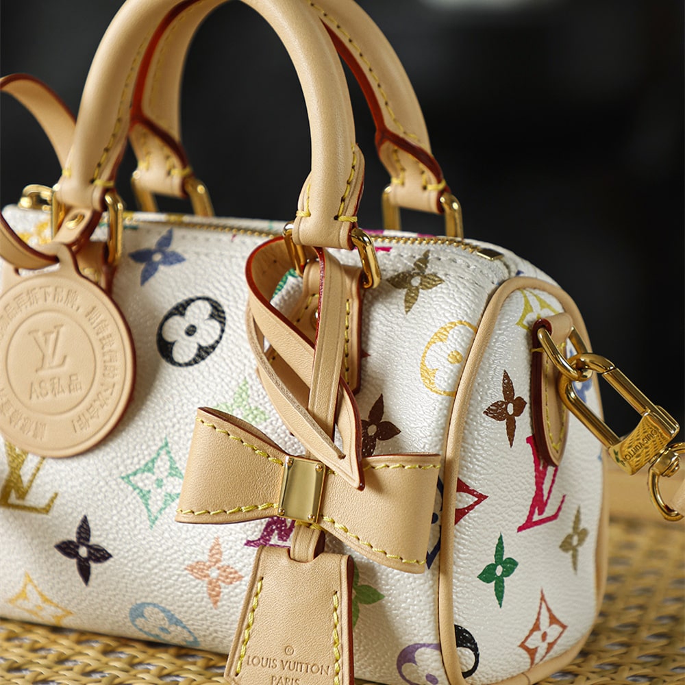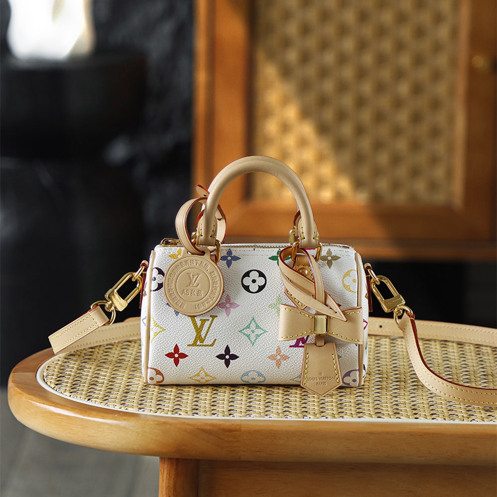 高仿LV nano speedy系列聯名Murakami Takashi單肩包M13391白三彩款式,純原版本自帶防偽晶片碼可査詢.王者歸來nano speedy白三彩真是太可愛了,這回搭配上蝴蝶結,簡直是人見人誇的顏值.