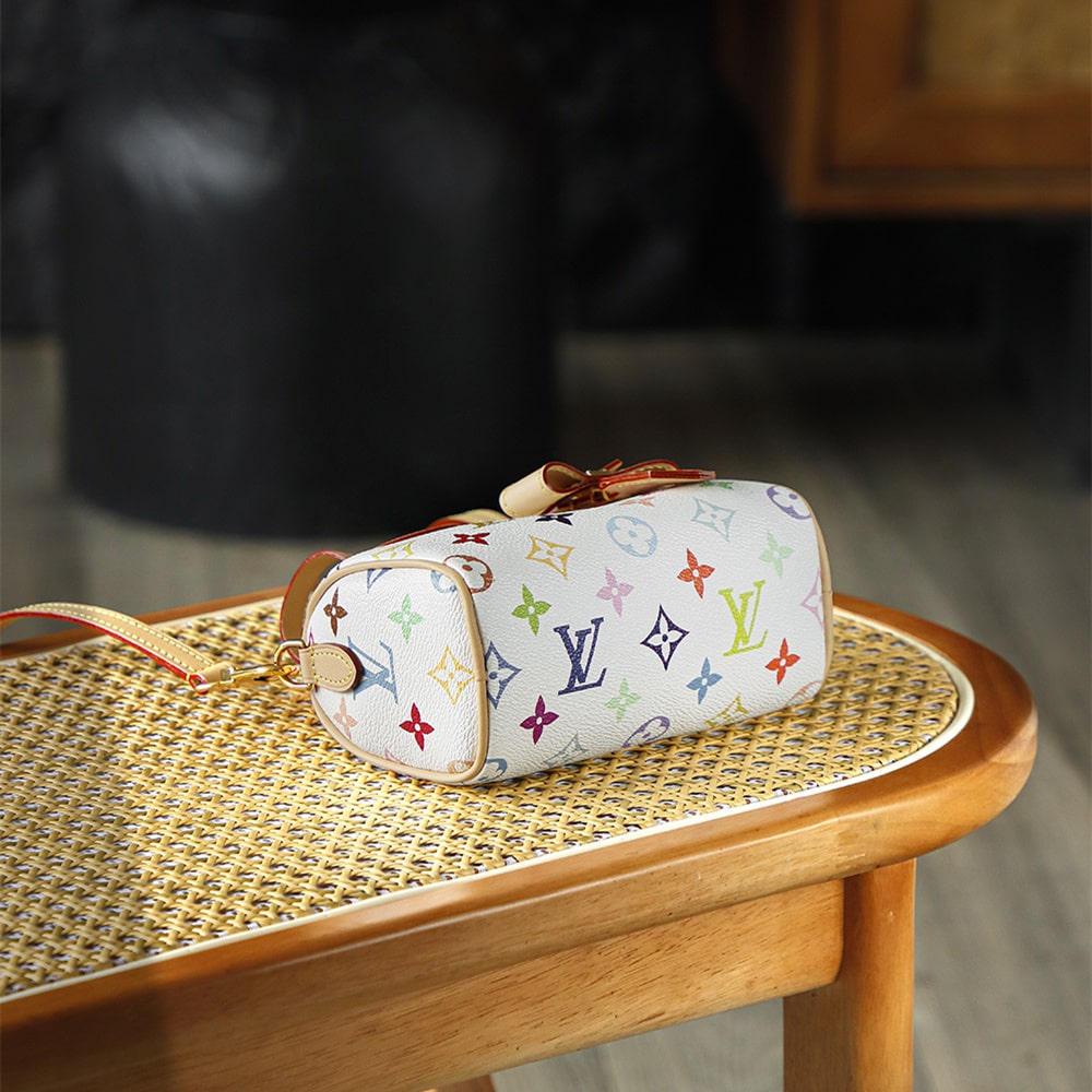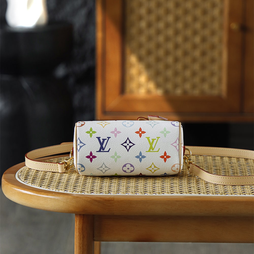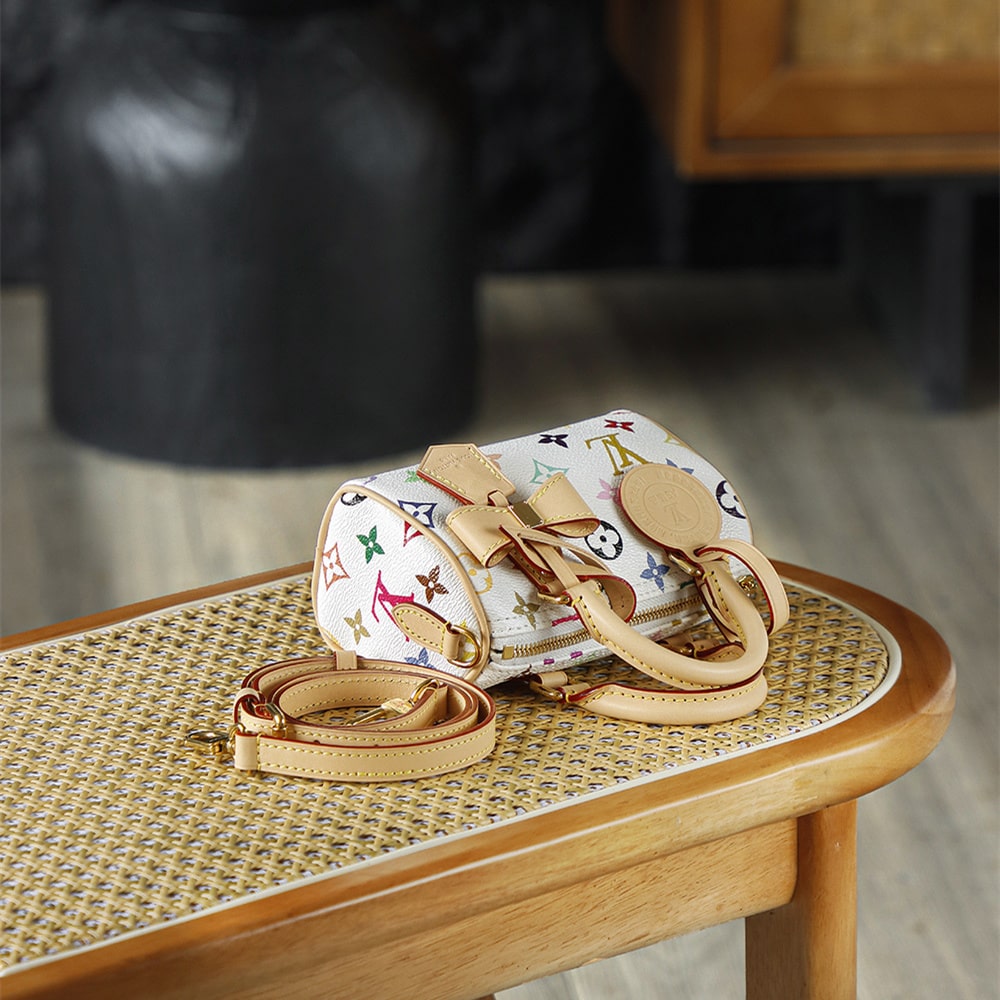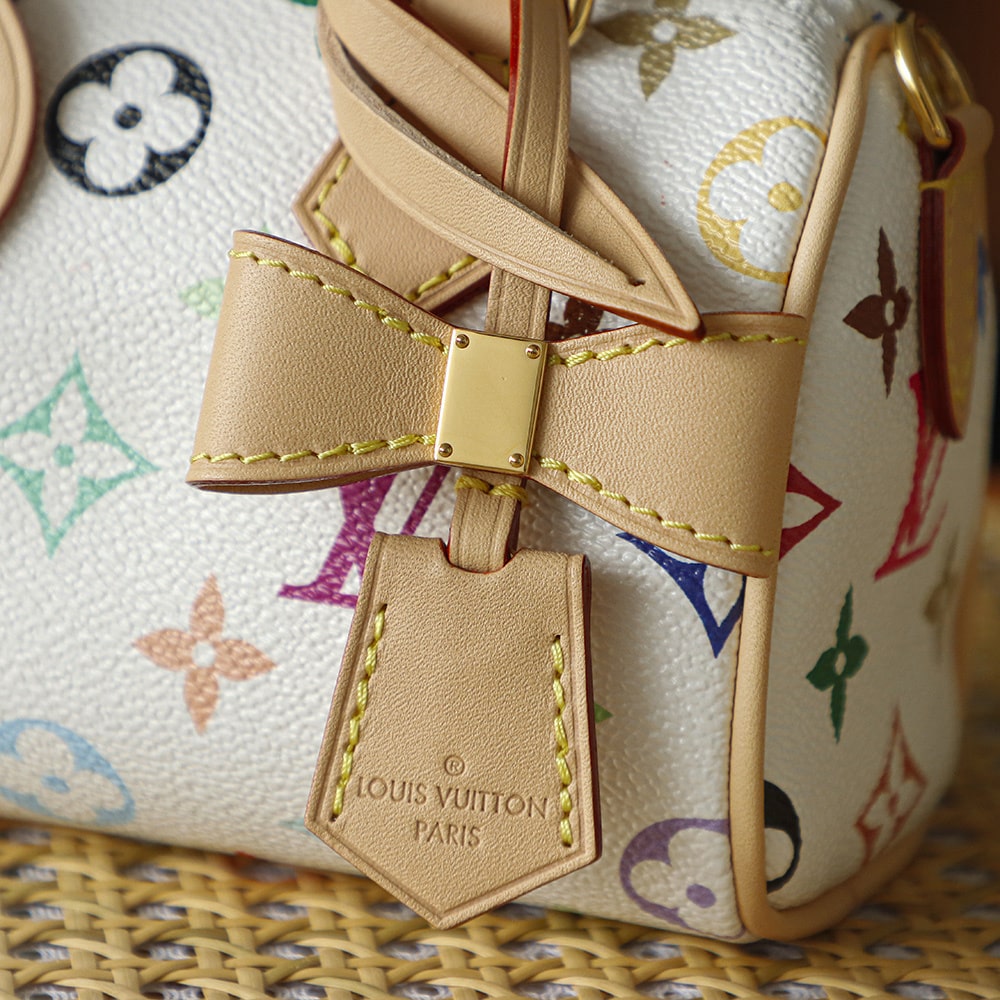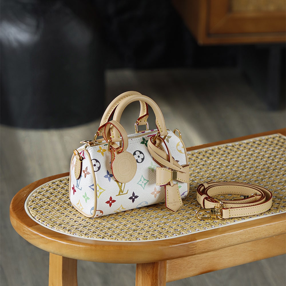 高仿LV nano speedy系列聯名Murakami Takashi單肩包M13391白三彩款式,純原版本自帶防偽晶片碼可査詢.王者歸來nano speedy白三彩真是太可愛了,這回搭配上蝴蝶結,簡直是人見人誇的顏值.
