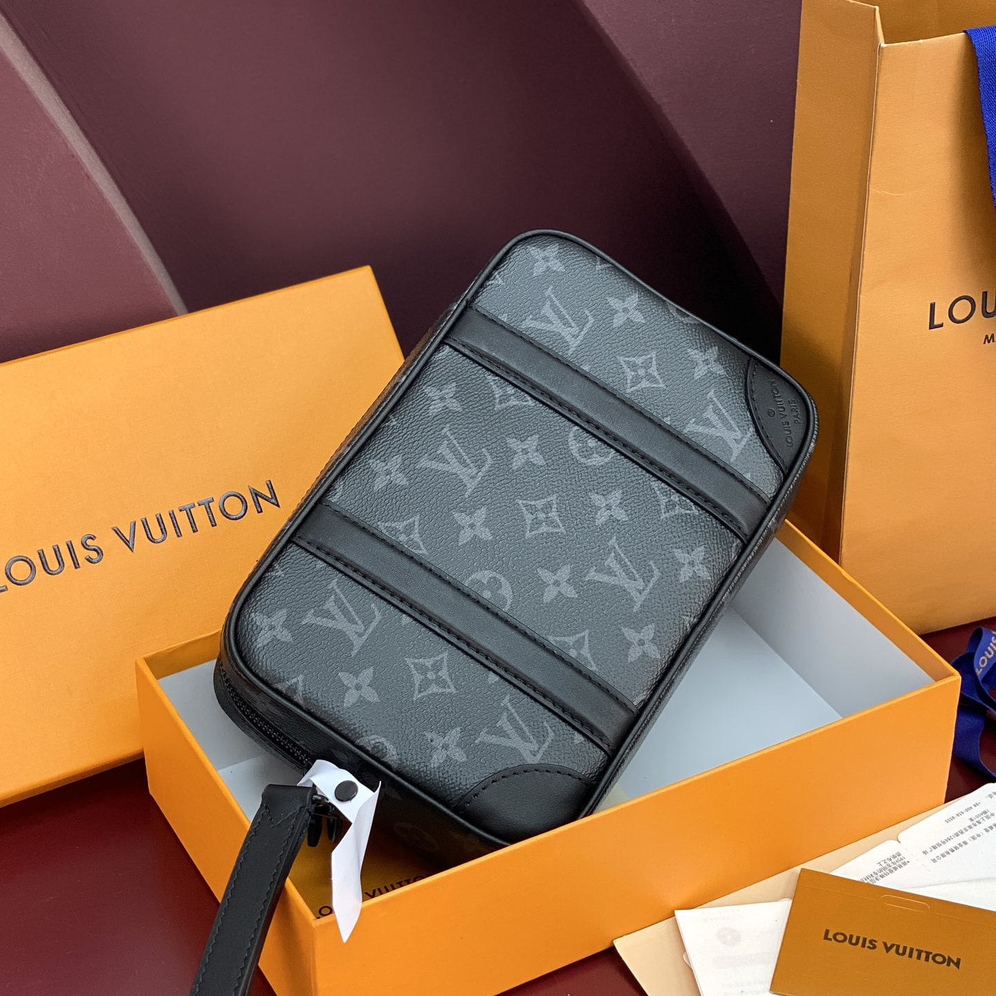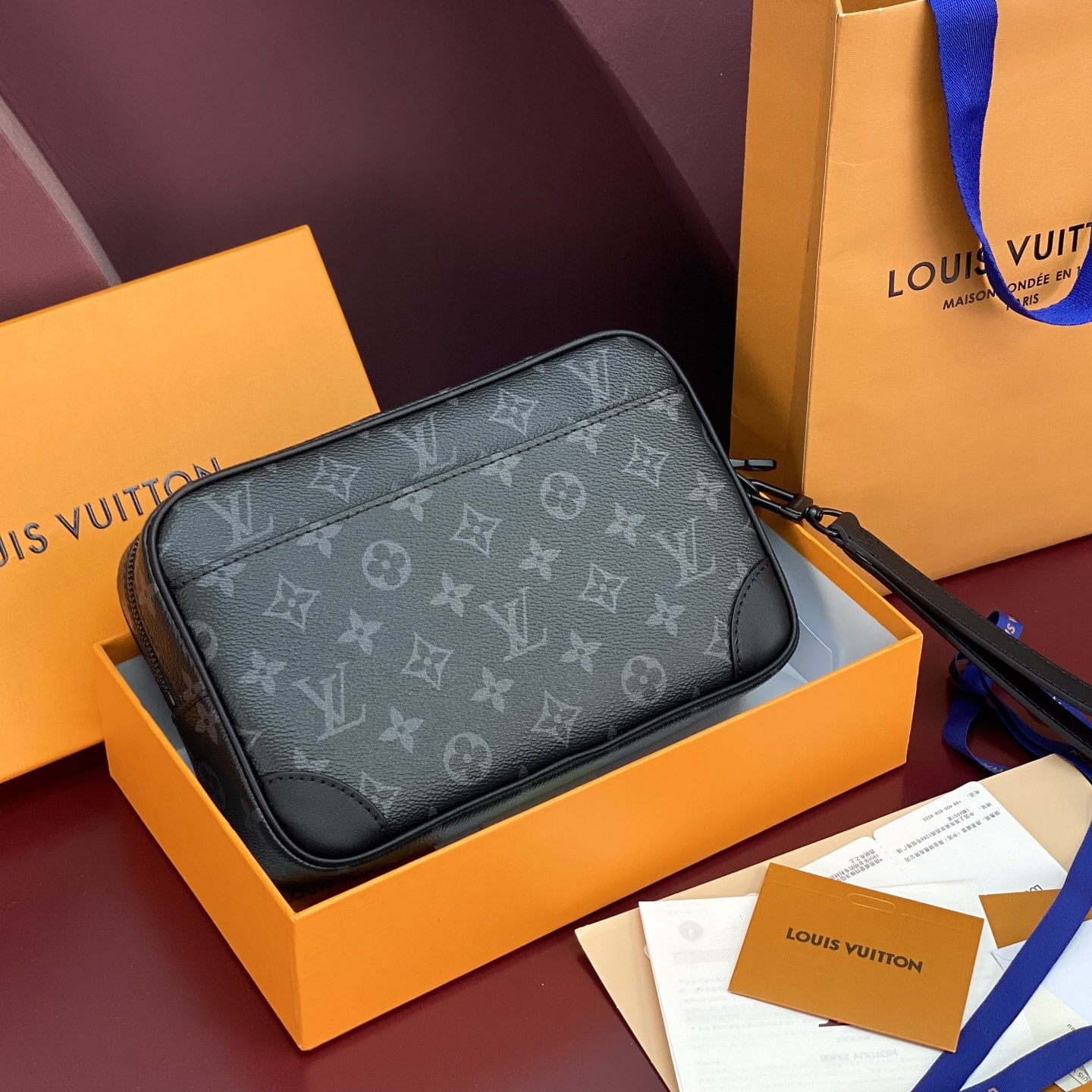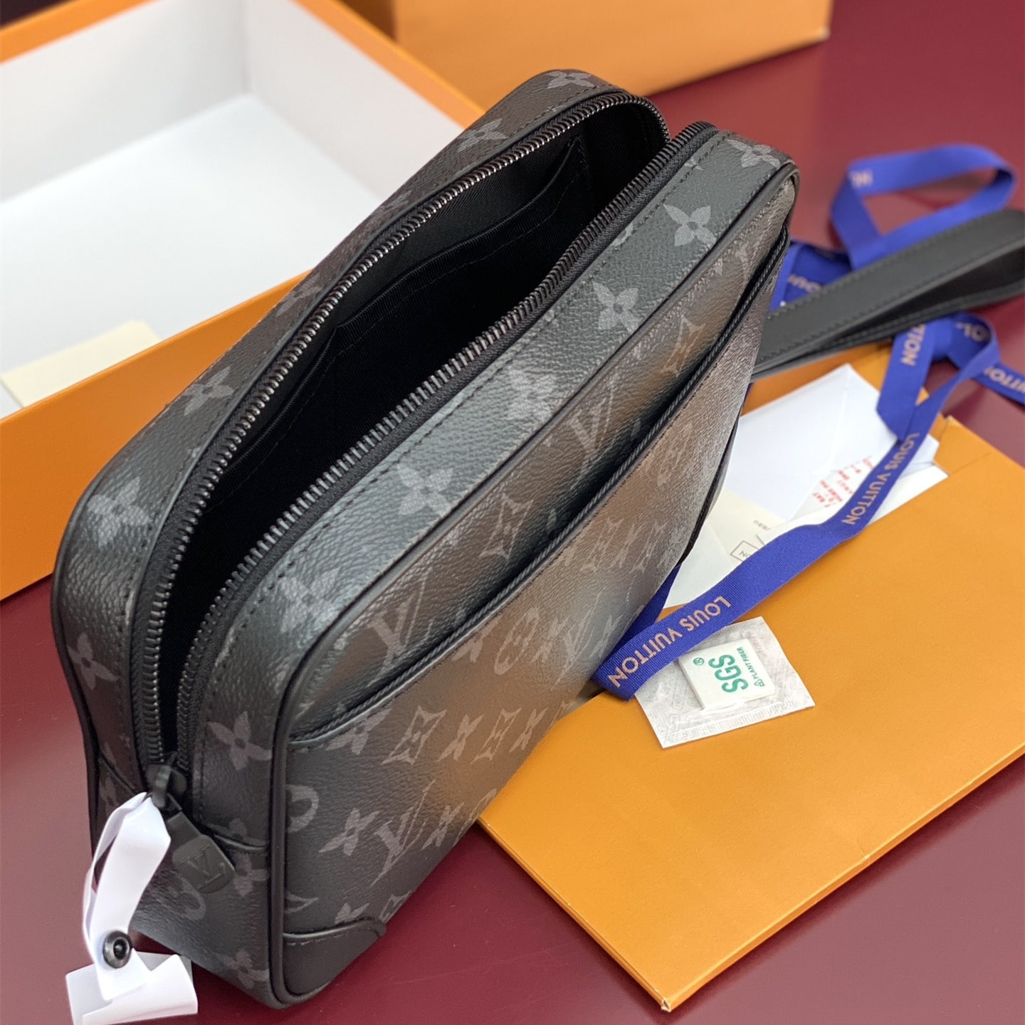 KASAI純原M82076黑花,芯片版手拿包.這款Kasaï郵袋由Damier石墨帆佈制成,正面有加固的角落和黑色皮革帶,以及拉鏈後袋.其寬大的拉鏈開口可以進入三個扁平口袋和十個卡槽,這件作品可以作為袋子佩戴,也可以通過其可拆卸的腕帶戴在手腕上.