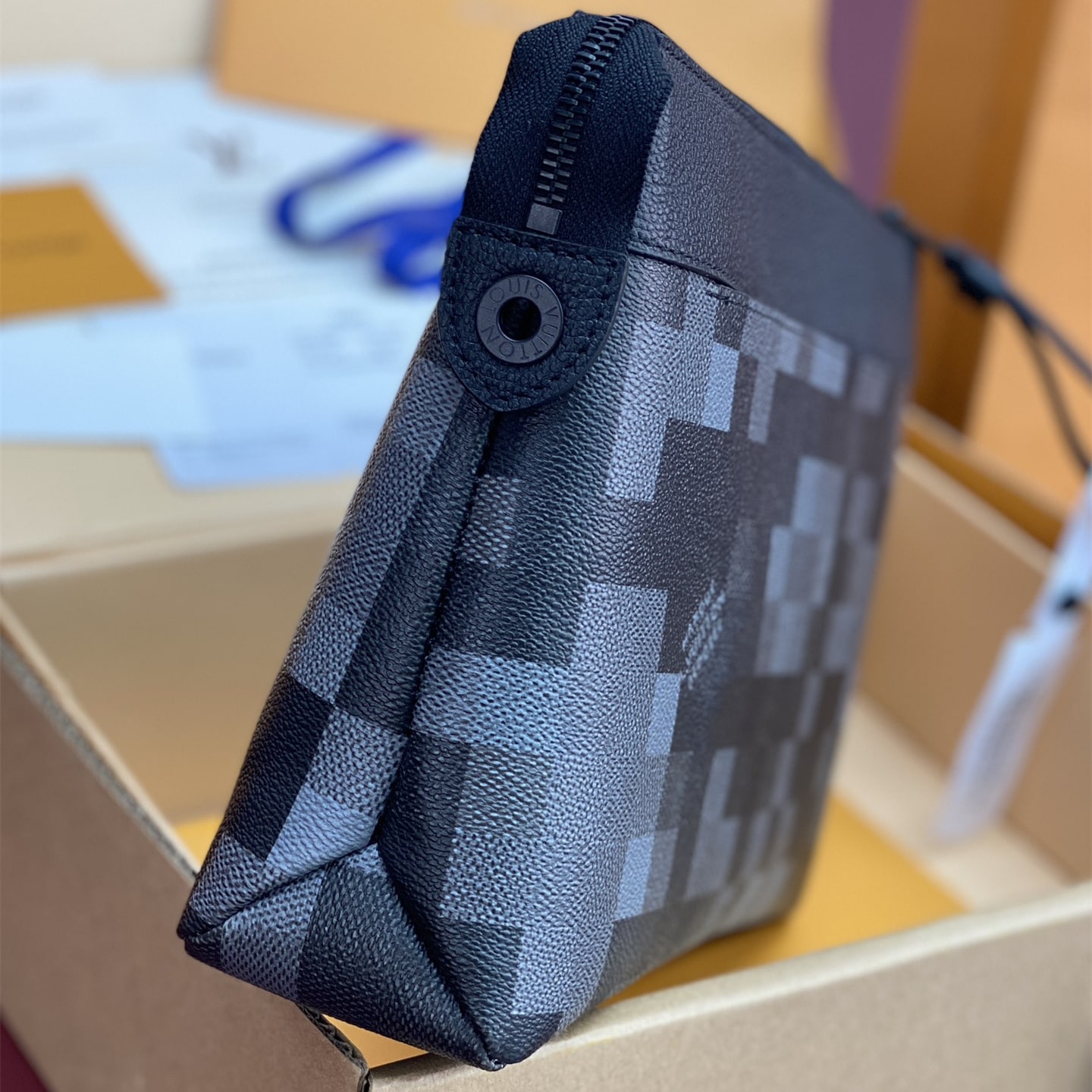 Black塗層帆佈塑造柔和廓形,併為其上鋪陳新穎像素化Damier格紋圖案,如同馬賽克一樣營造矚目觀感,拉鏈主隔層與磁扣後袋方便快速取放出行所需.