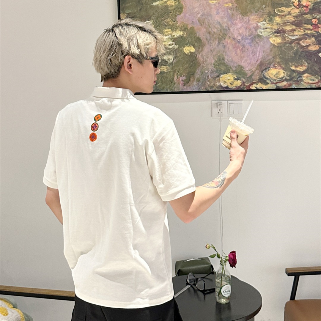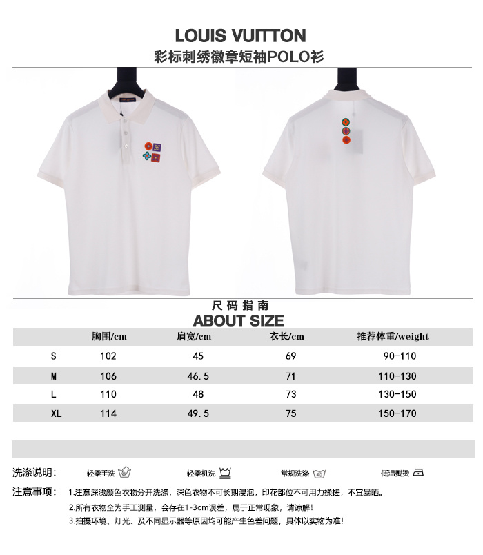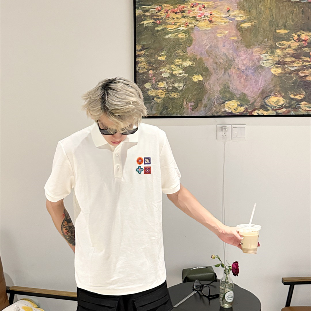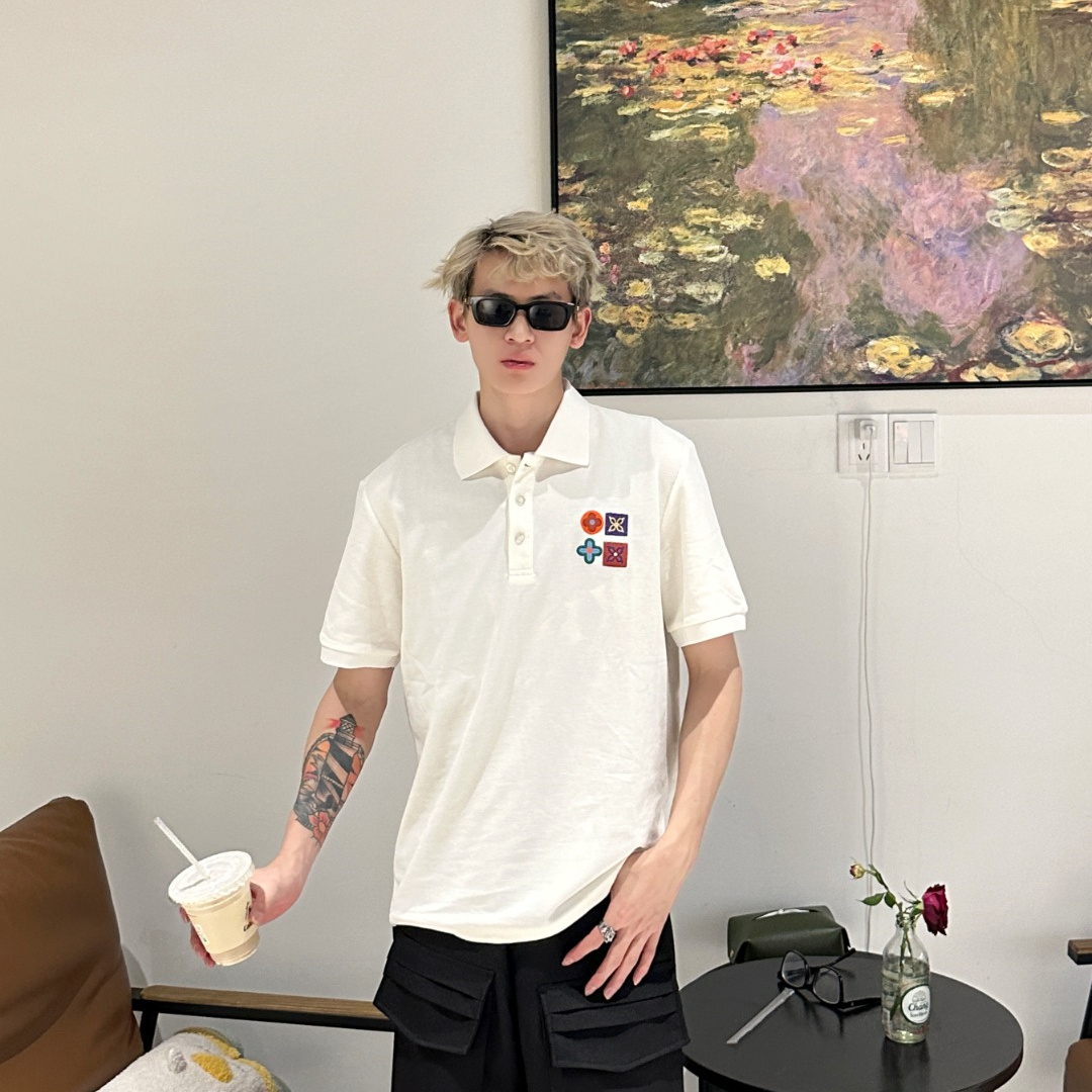 Vuitton路易威登23SS系列彩標刺繡徽章短袖POLO衫,專用面料220g蜂窩珠地棉,前後立體高密榻榻米繡花,無毛邊.定制天然貝殼紐扣,衣服設計前短後長,下腳打棗,全部原生佈捆邊,前胸雙層面筒,無明線,無散口.袖口前胸筒底,肩縫包骨,全部還原原版.