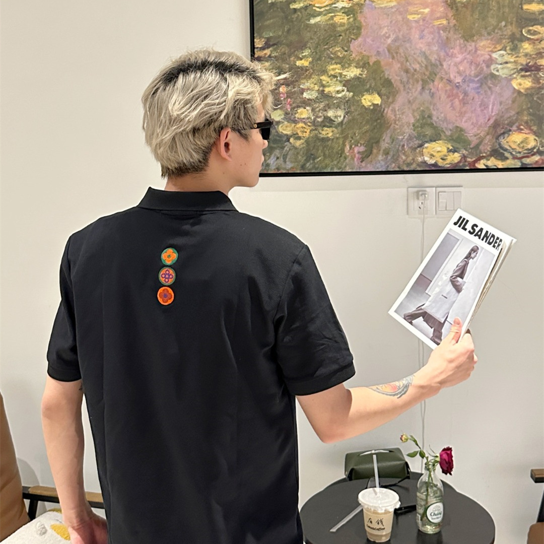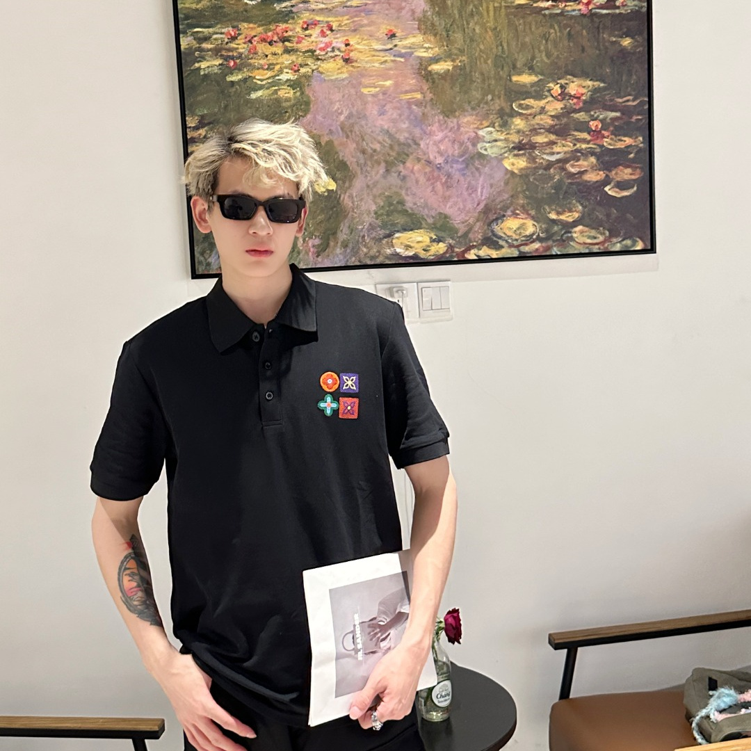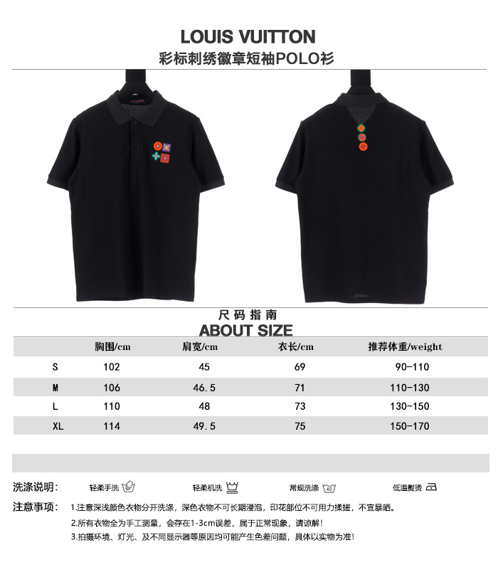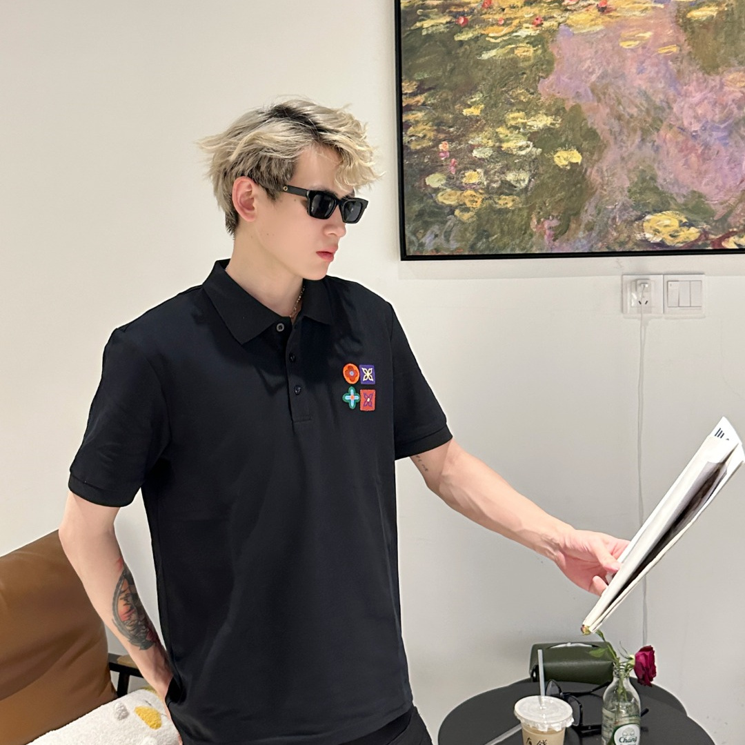 Vuitton路易威登23SS系列彩標刺繡徽章短袖POLO衫,專用面料220g蜂窩珠地棉,前後立體高密榻榻米繡花,無毛邊.定制天然貝殼紐扣,衣服設計前短後長,下腳打棗,全部原生佈捆邊,前胸雙層面筒,無明線,無散口.袖口前胸筒底,肩縫包骨,全部還原原版.