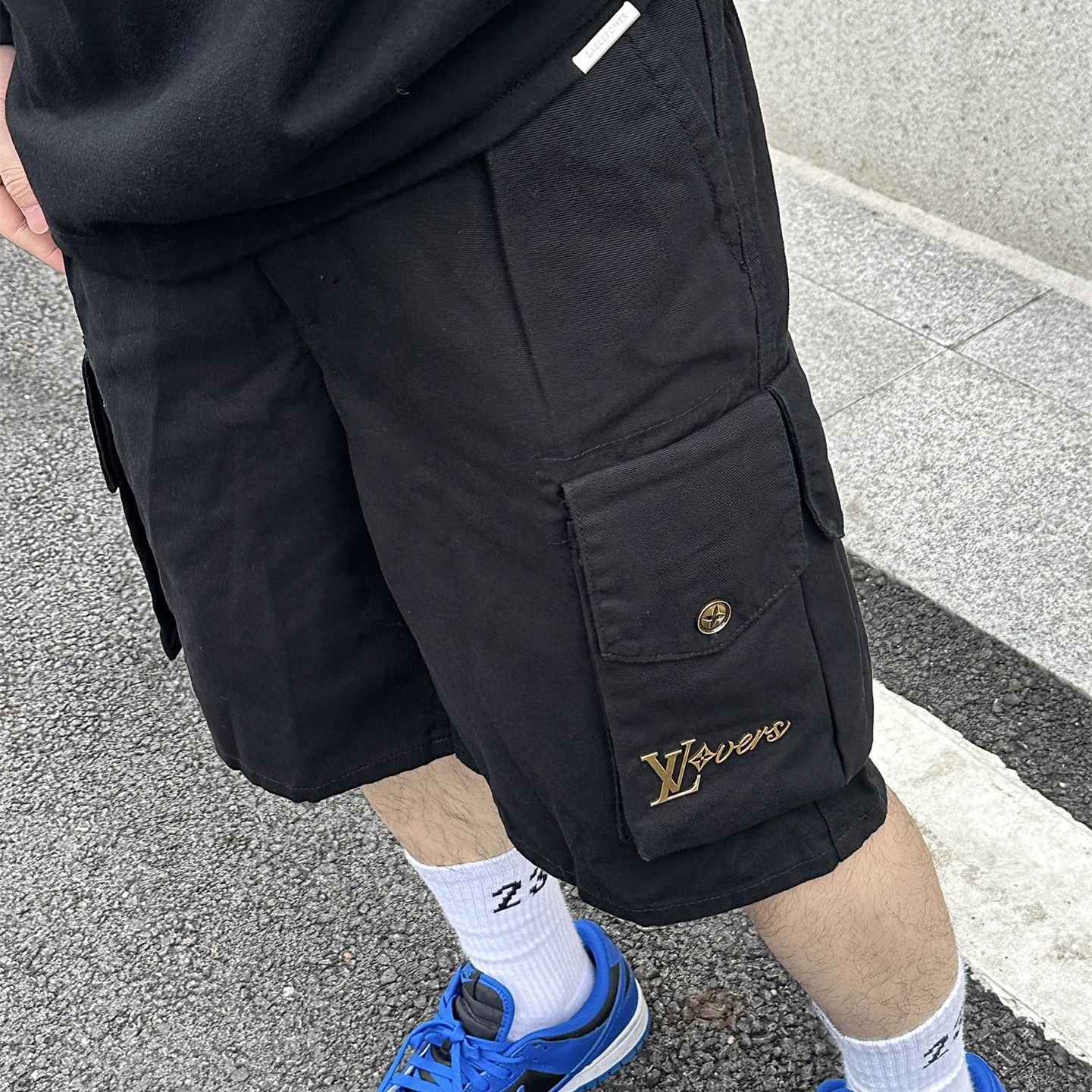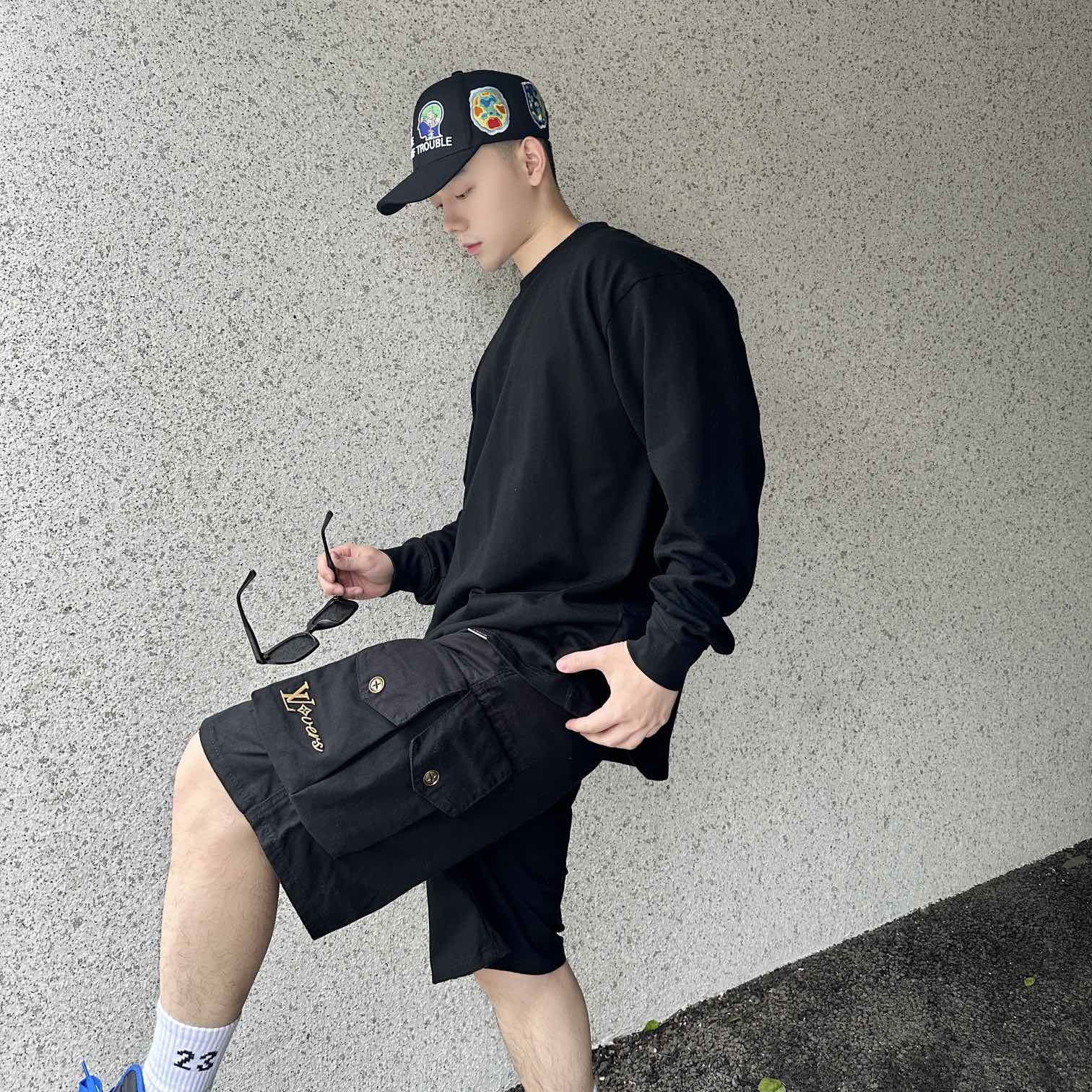 LV新款金標識雙口袋工裝短褲.定制高密平紋加厚碳磨珠地棉315克,特殊洗水工藝防掉色防發紅,採用模闆機激光開袋技術,激光束能夠精確地按照預設的模闆路徑進行切割,倆邊風琴袋採用中燙定位畫位技術,模版機進行定位後中燙機進行定位畫位的燙印,內縫採用拉捆技術,在縫線的倆側使用拉繩進行捆綁,內縫更為牢固,面料都經過普洗加軟.