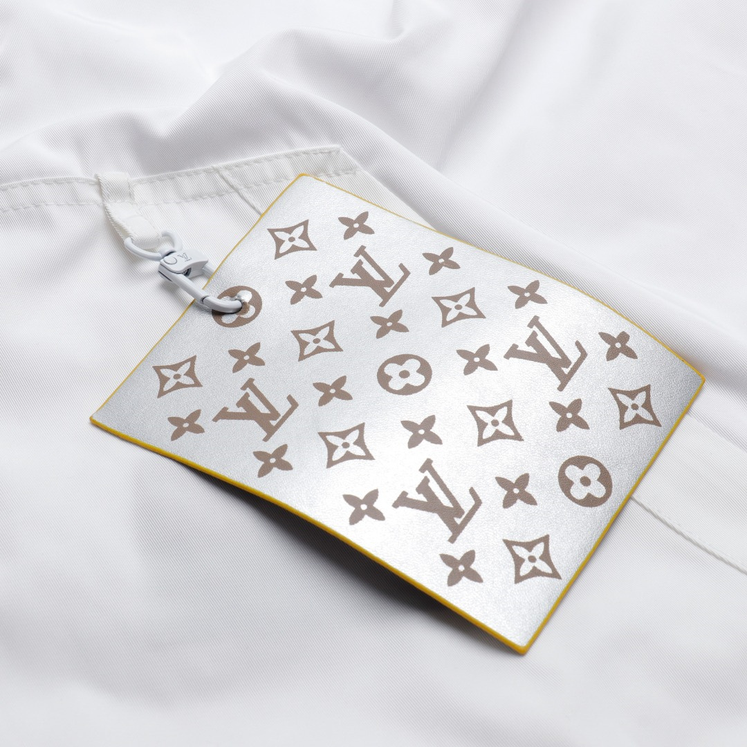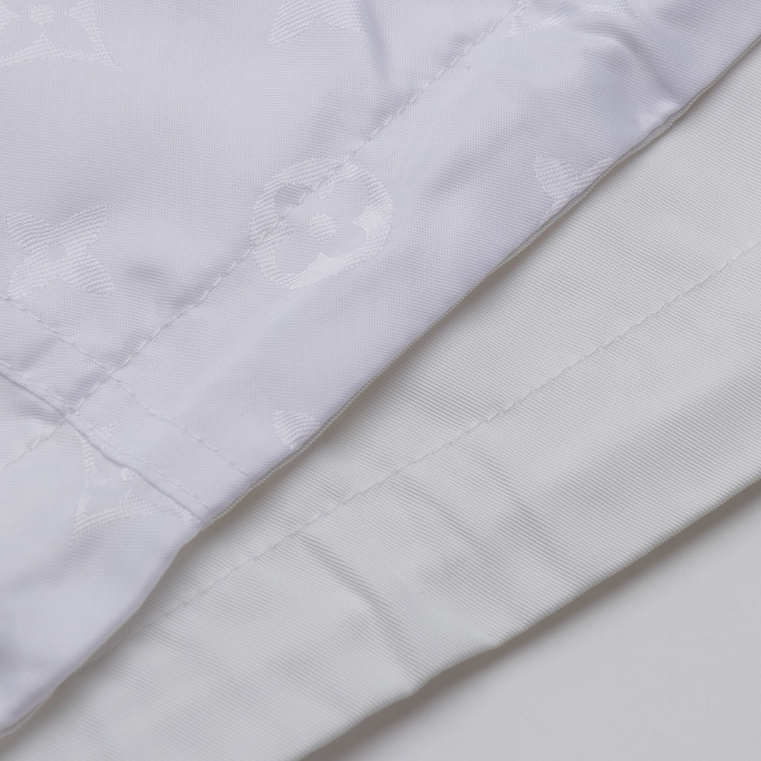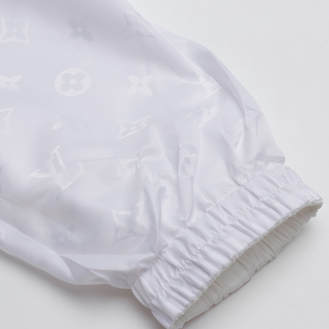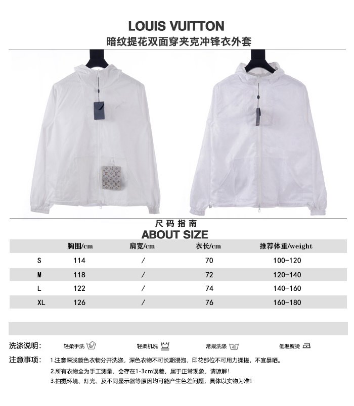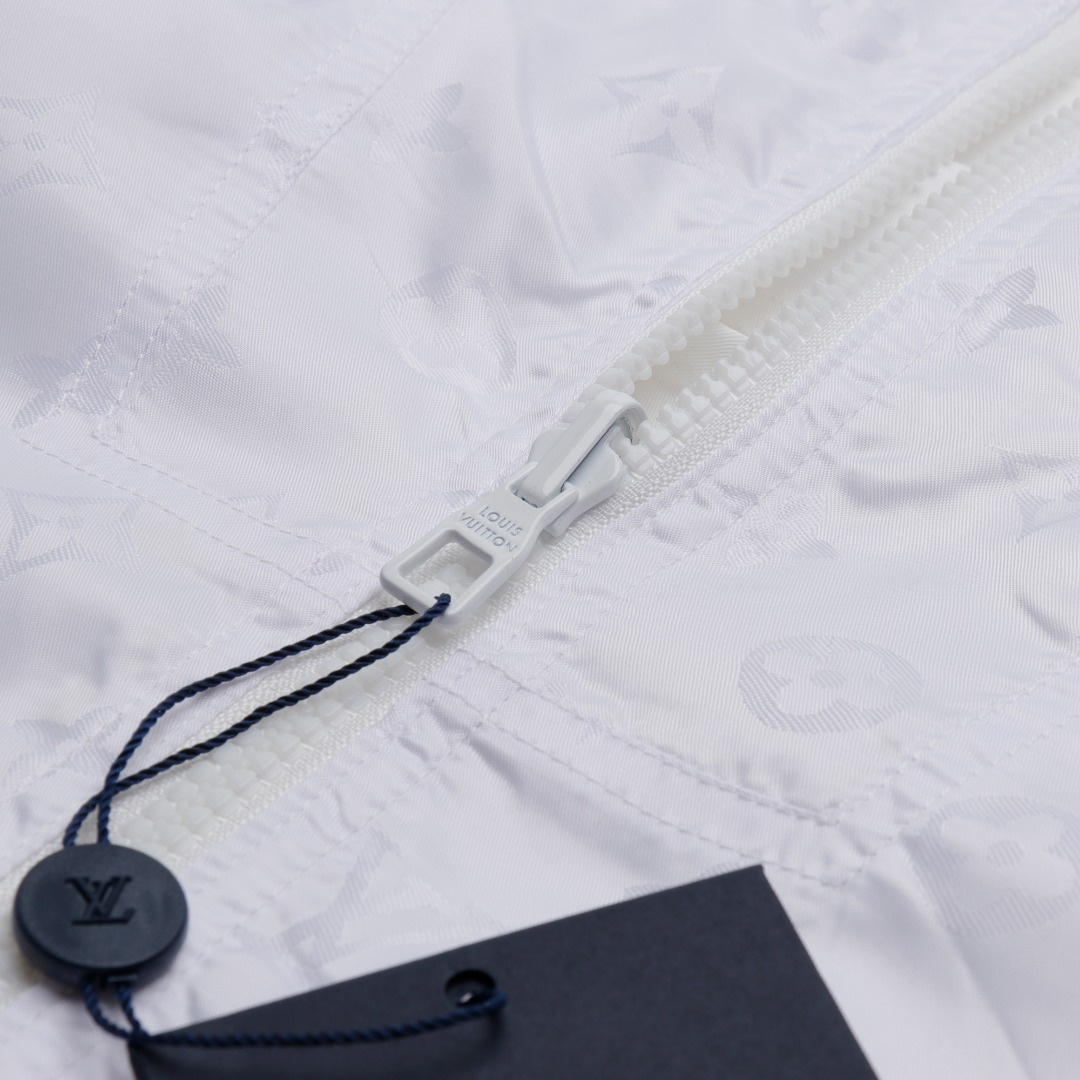 LouisVuitton/路易威登LV暗紋提花雙面穿夾克沖鋒衣外套雙面穿夾克,分為純色面和滿logo提花面,兩種風格隨意切換,款式不需多說,低調奢華,雙面都帶走LV經典元素,寬松版型,上身休閒舒適.僅胸口五金裝飾,五金可拆卸,里外五金全部雙面刻字,原版一致去定制定染.衣身同色無色差,工費昂貴.里布為真絲提花面布,經典滿幅logo提花工藝,全部需要織上去,工藝成本極高.