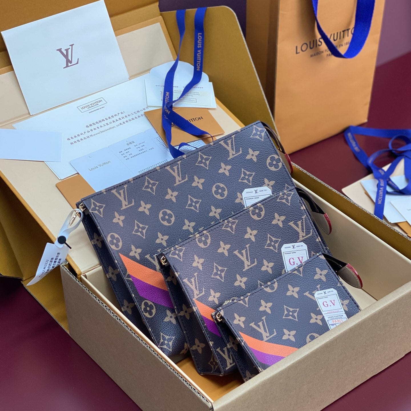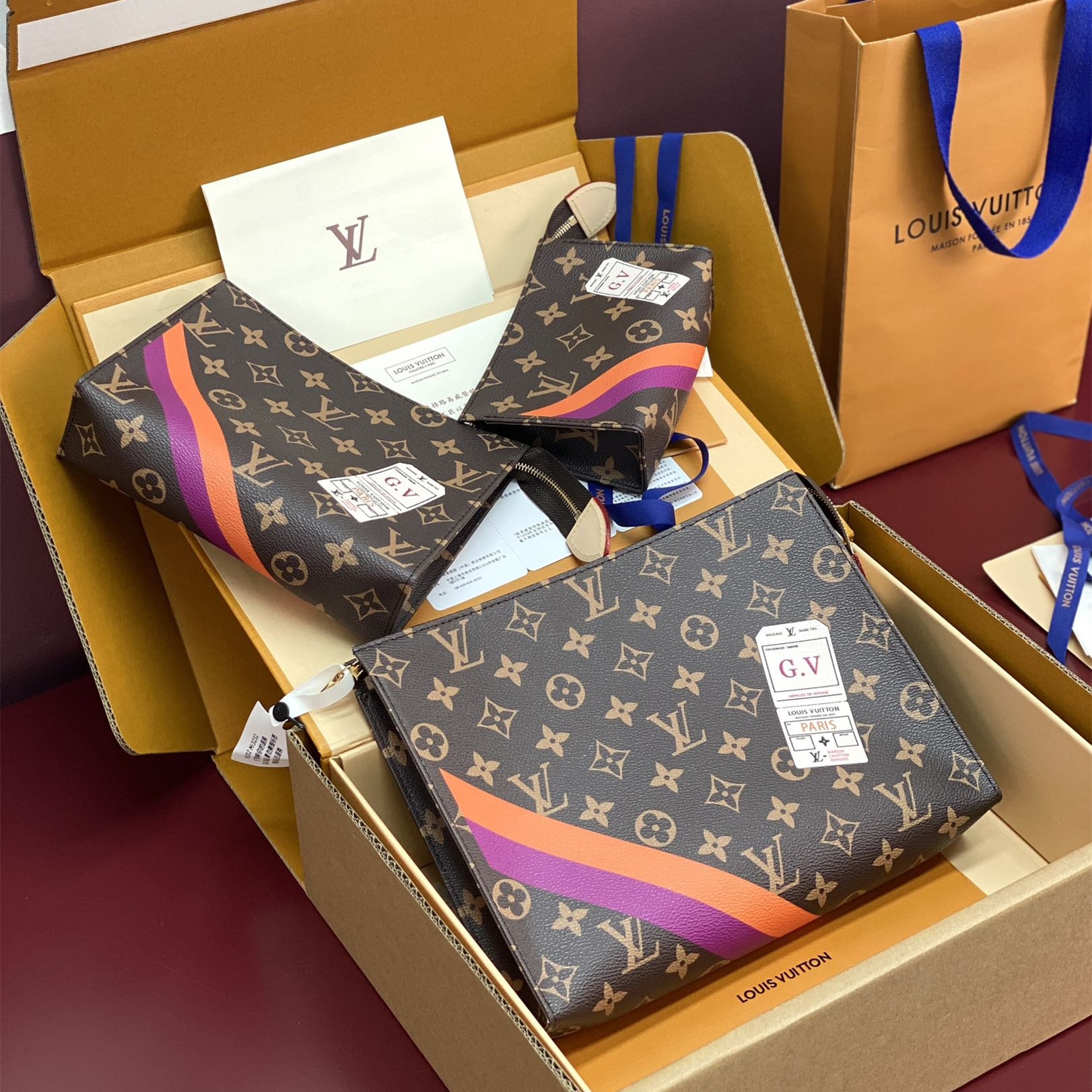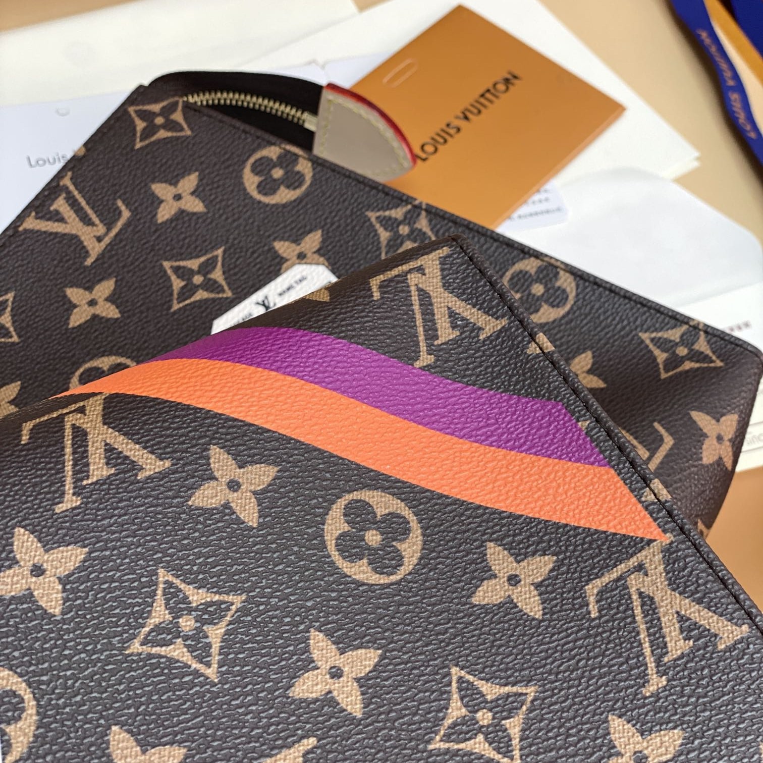 Monogram繫列借尺寸各異的手拿包實現有序收納,再以可洗滌內襯與廣口式開合道出功能考量.可為Monogram帆佈隨心添綴繽紛條紋,專屬字母及典藏風格品牌印花,打造個性風範.