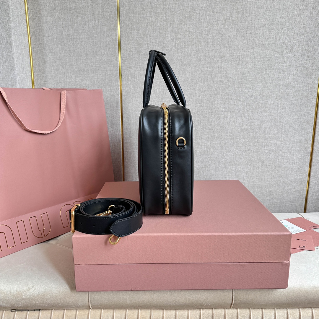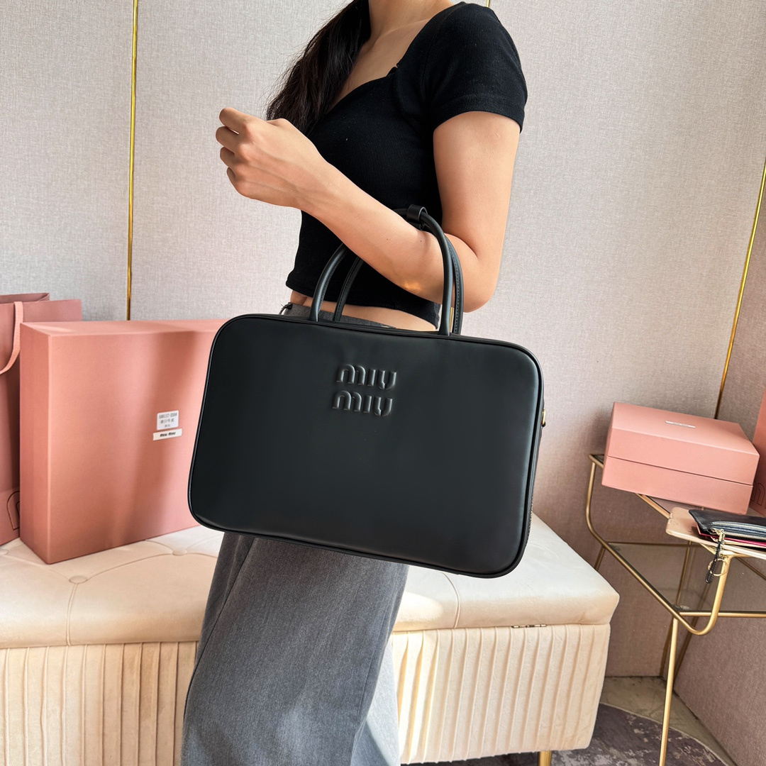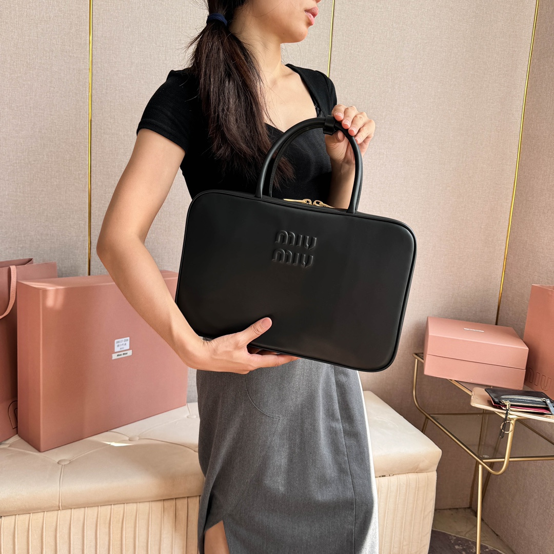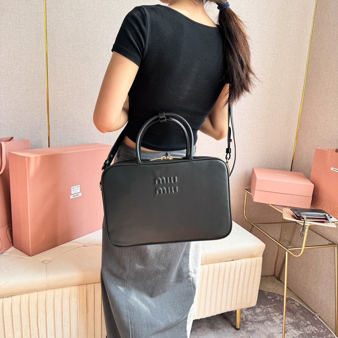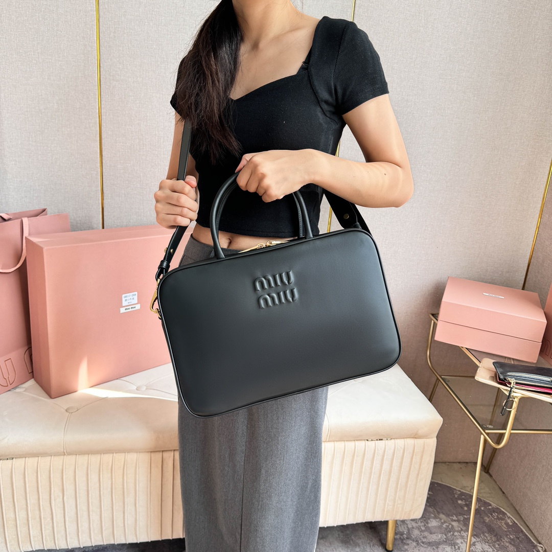 高仿MIUMIU長肩帶公文包:MiuMiu新品公文包,採用頂級進口小牛皮,皮質光滑細膩柔軟,棉質緞面襯裏,這款包包很酷,定格精致的多功能設計,融合男裝和女裝元素,增加了皮革長肩帶,實用性更高,造型更多樣化,隨性慵懶,自然灑脫,充滿個性,超大容量還很輕便,簡約卻不簡單,