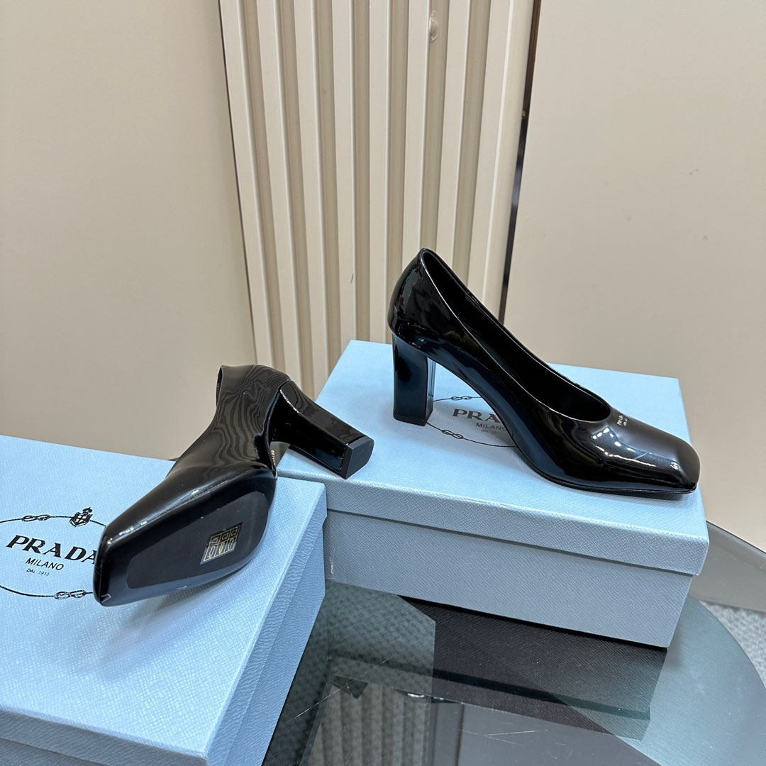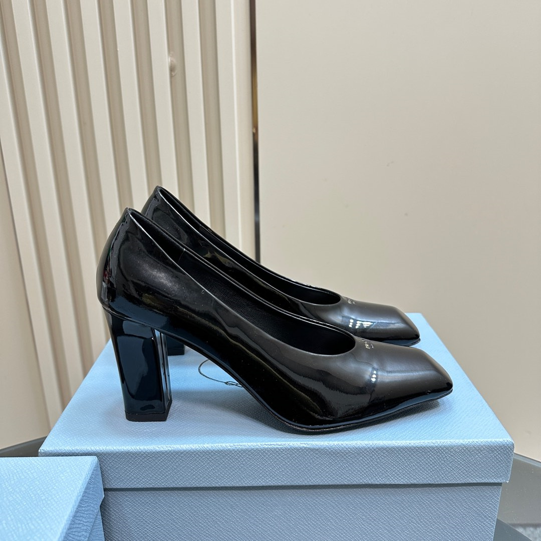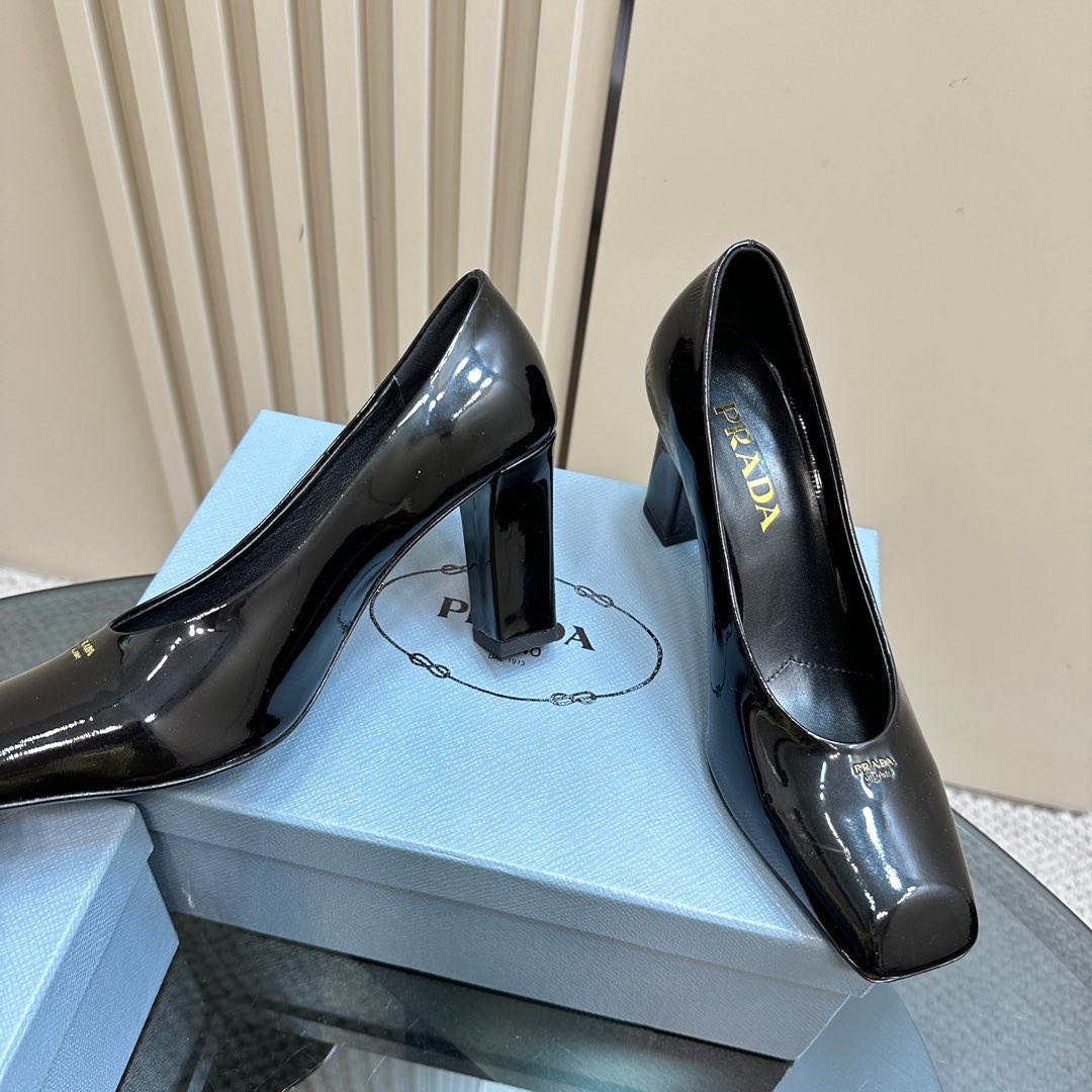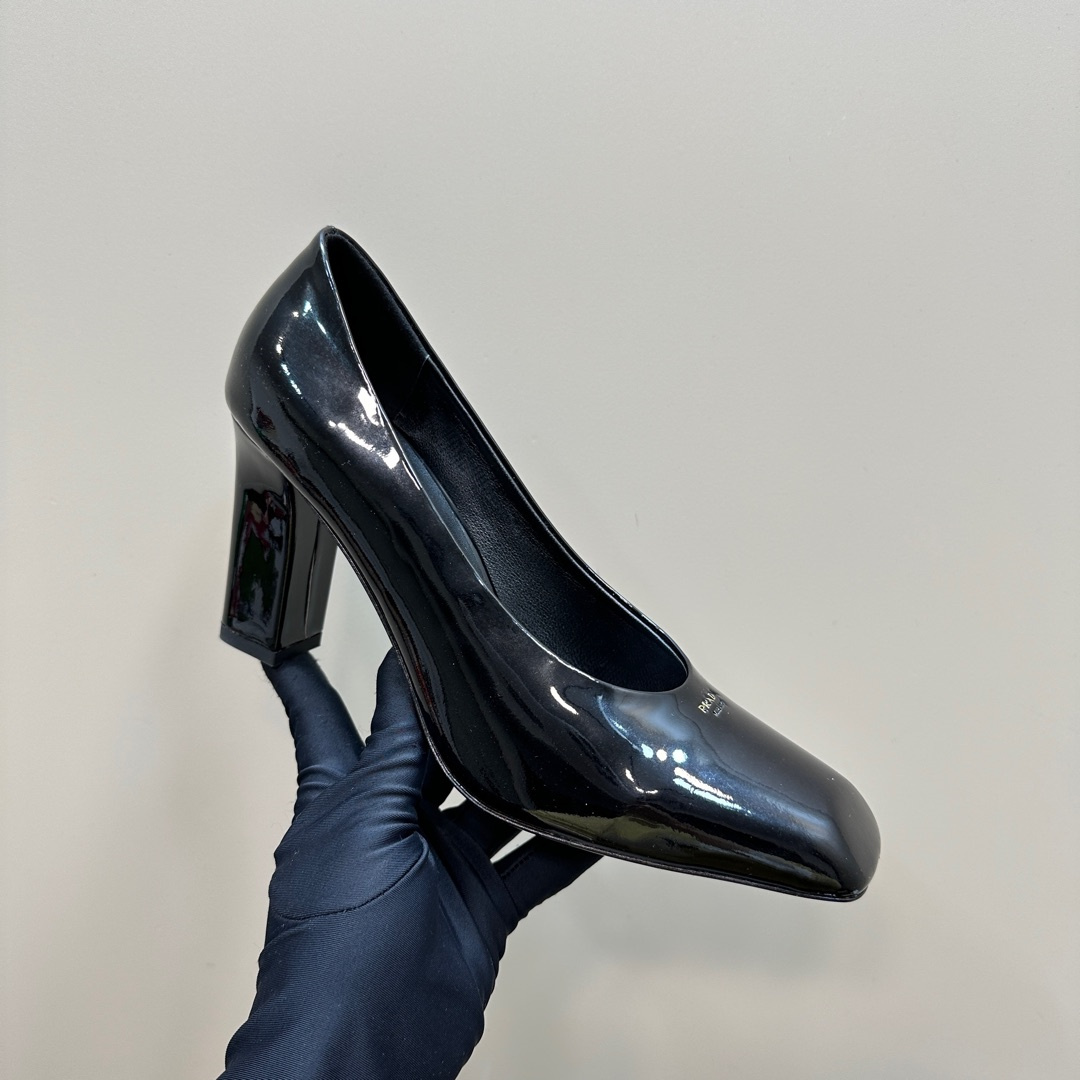 高仿Prada*1I837N方頭粗跟高踭鞋8.5CM漆皮黑色免檢版