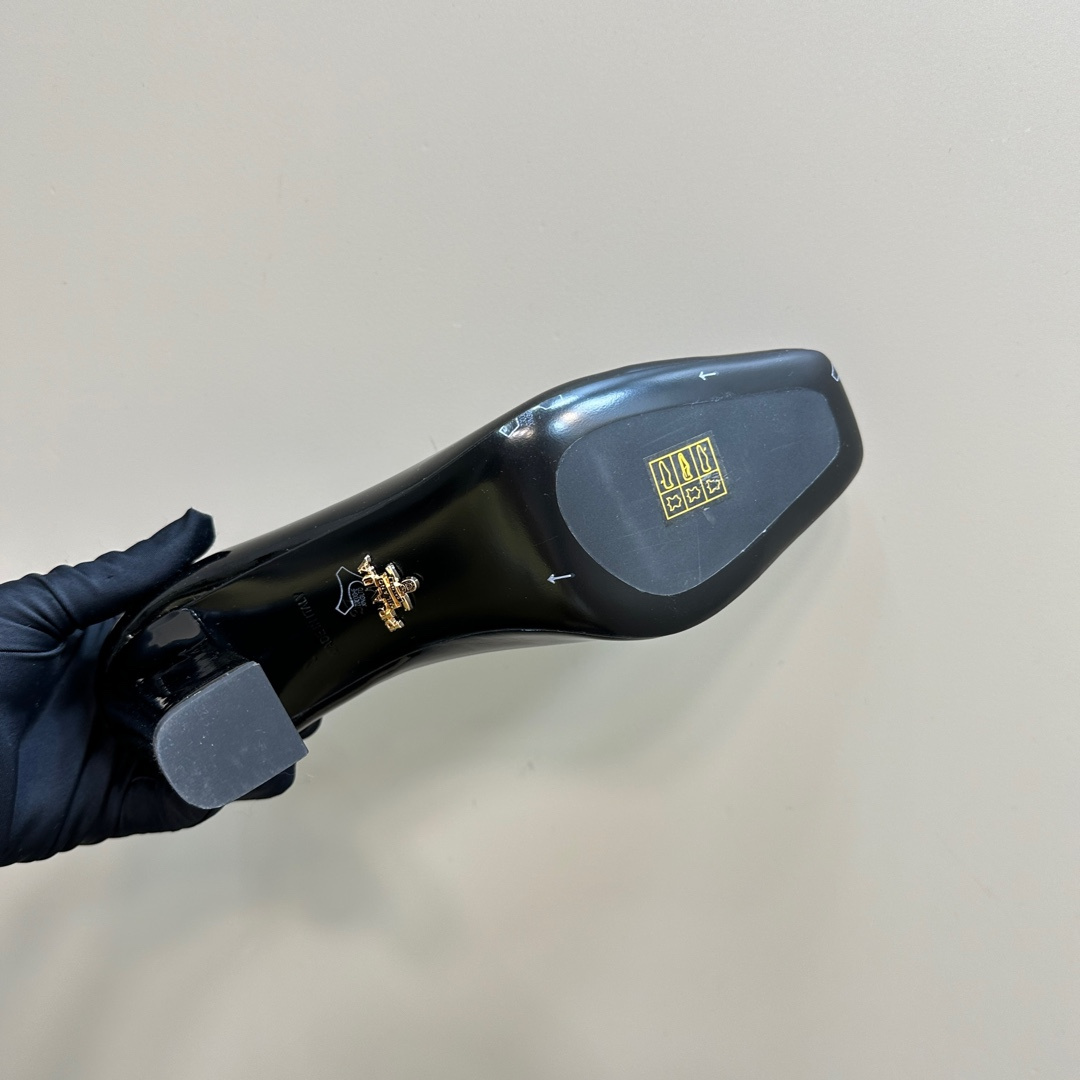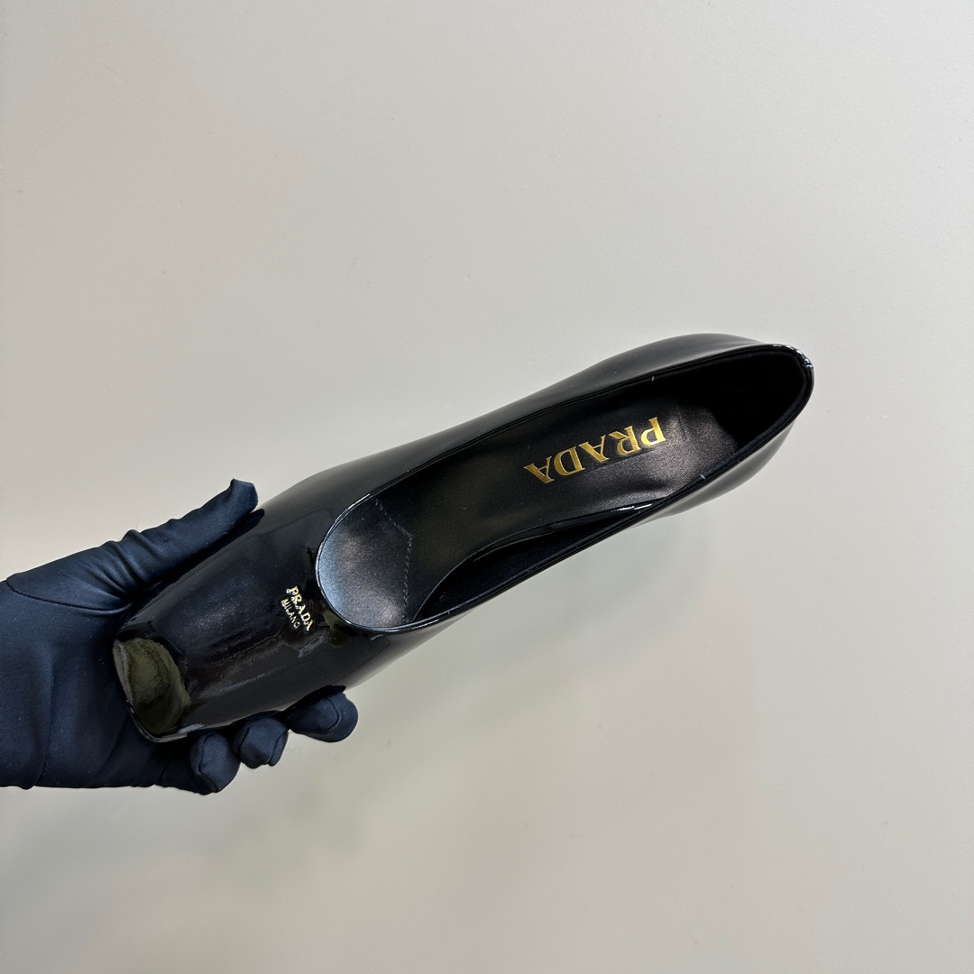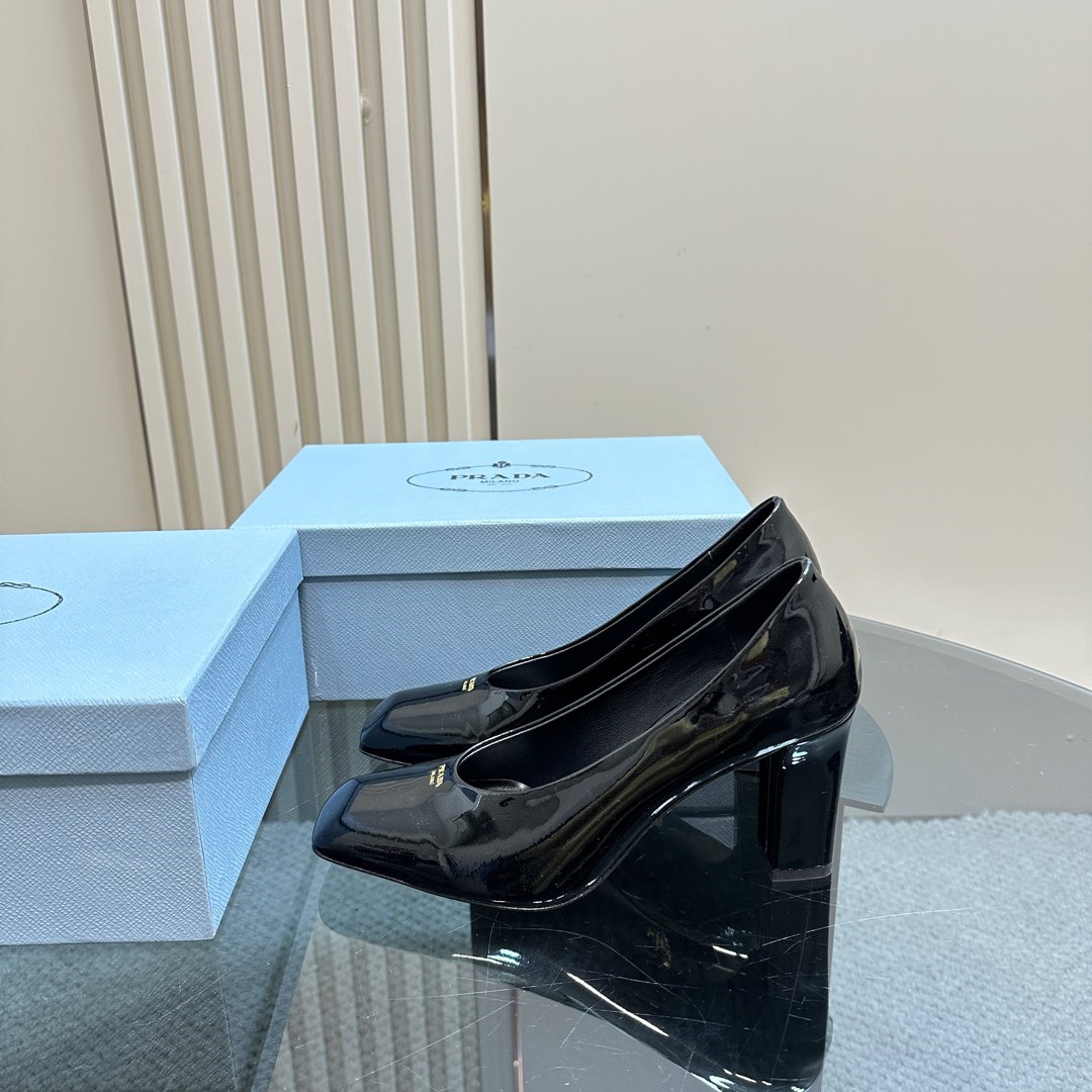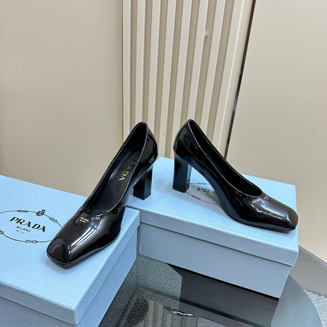 高仿Prada*1I837N方頭粗跟高踭鞋8.5CM漆皮黑色免檢版