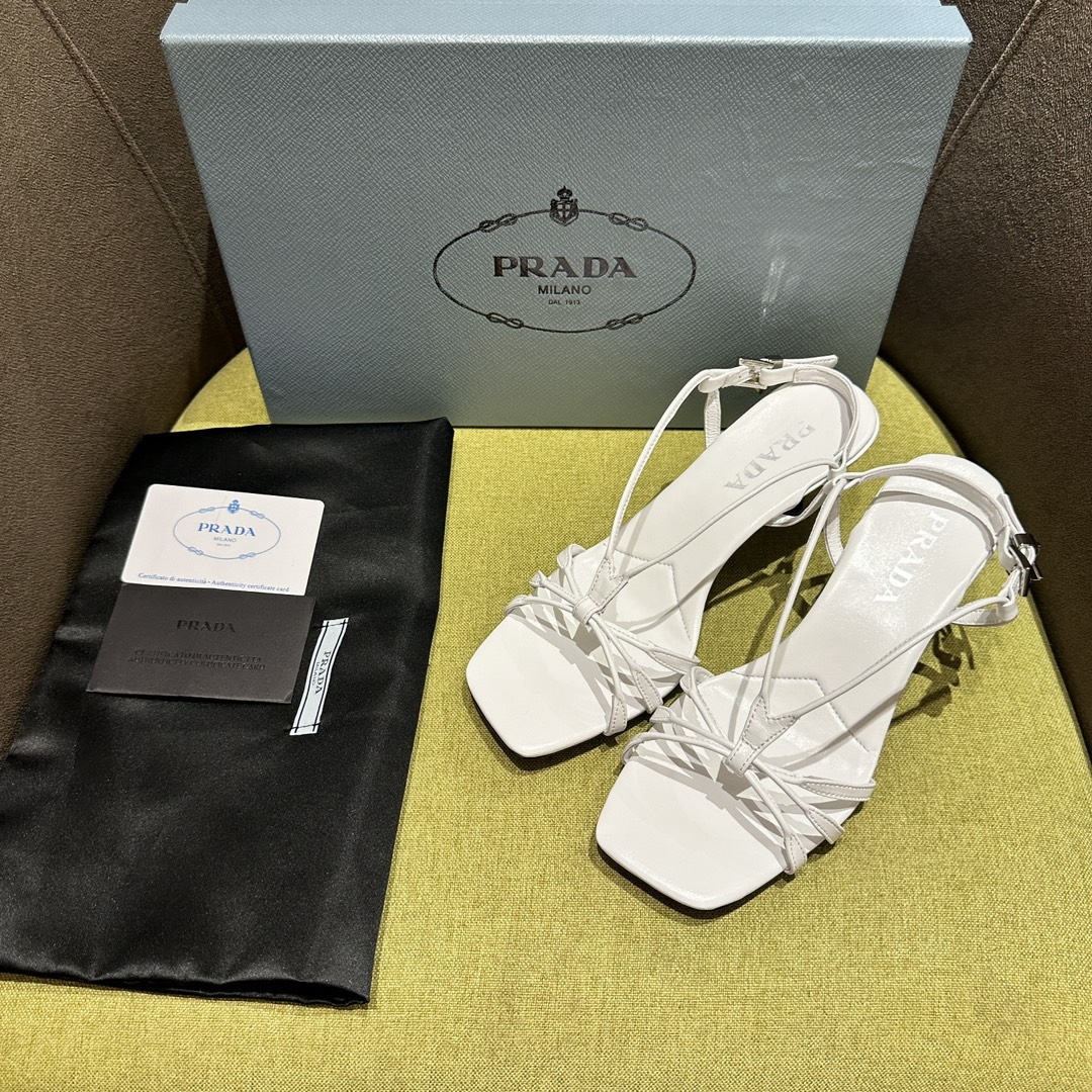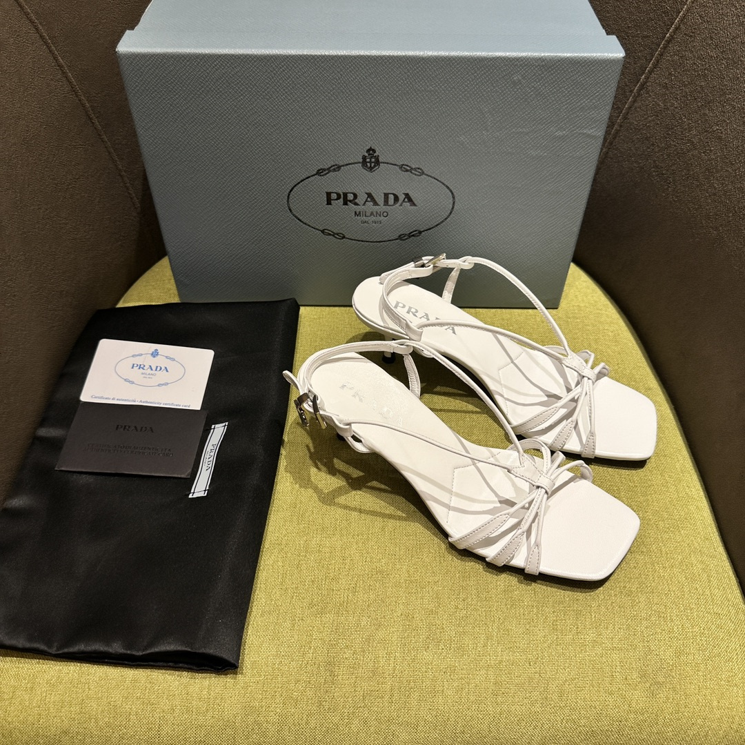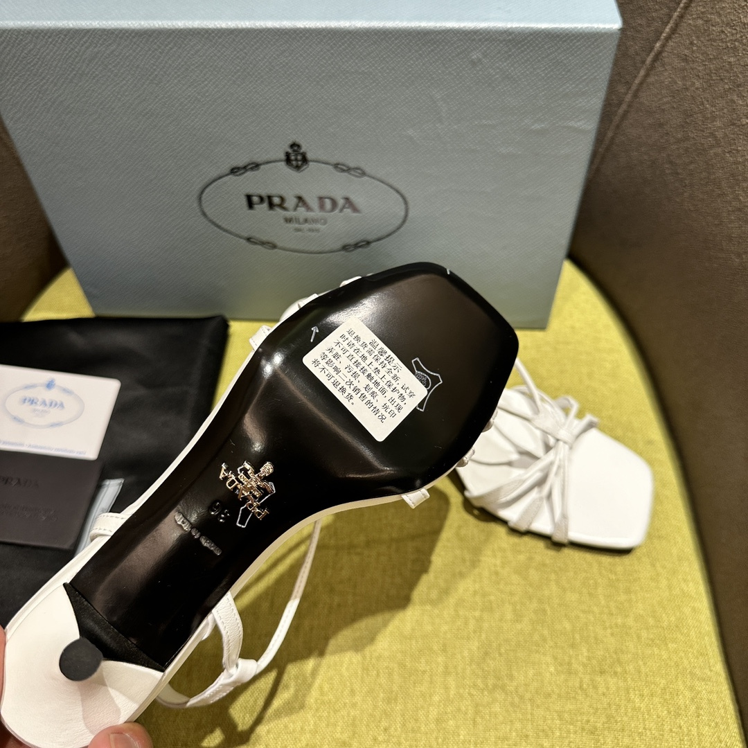 高仿Prada*1X504A方頭一字中踭涼鞋5.5CM白色免檢版
