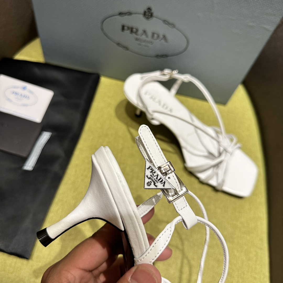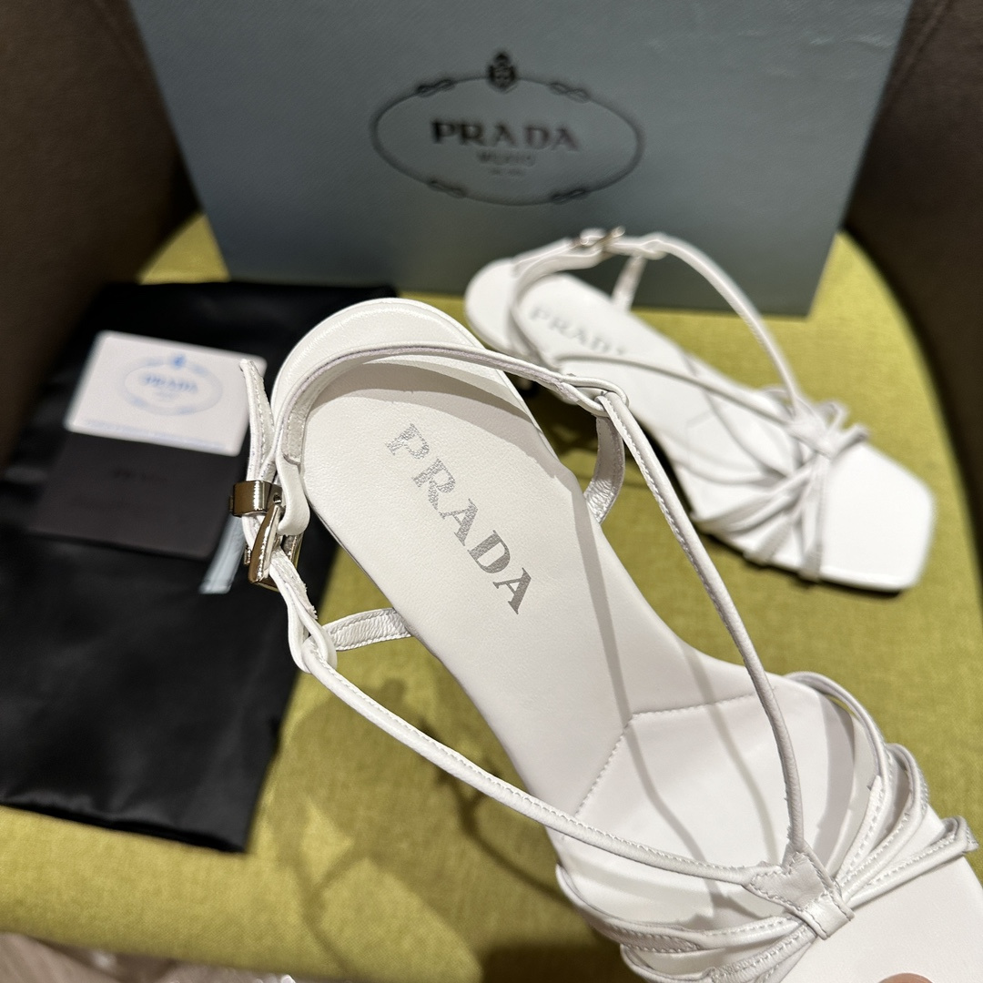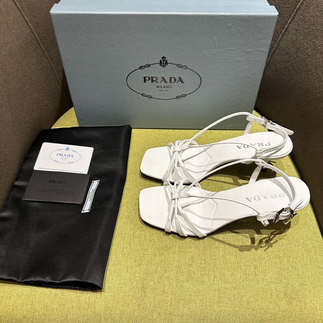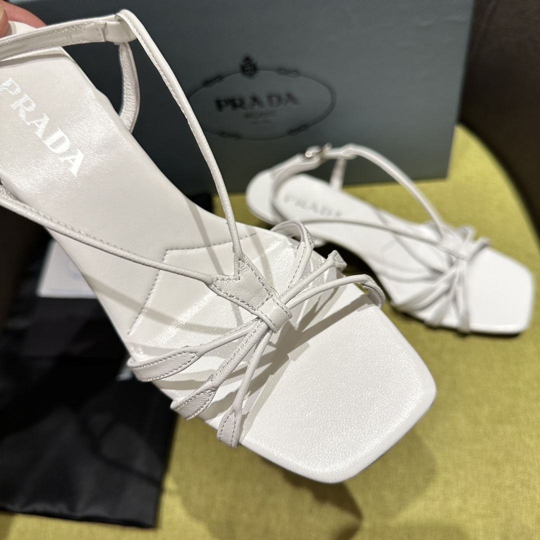 高仿Prada*1X504A方頭一字中踭涼鞋5.5CM白色免檢版