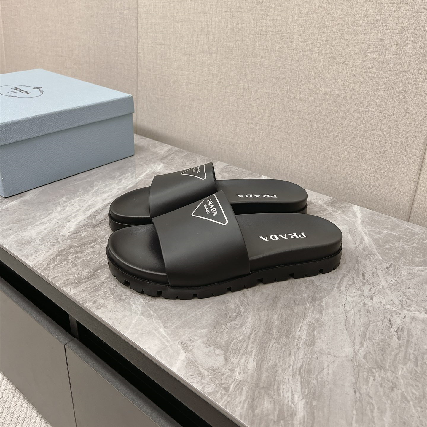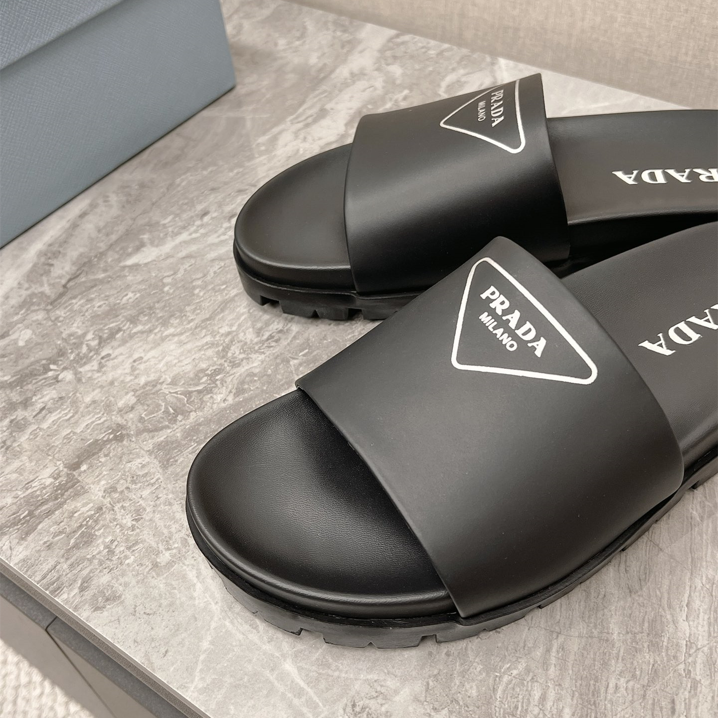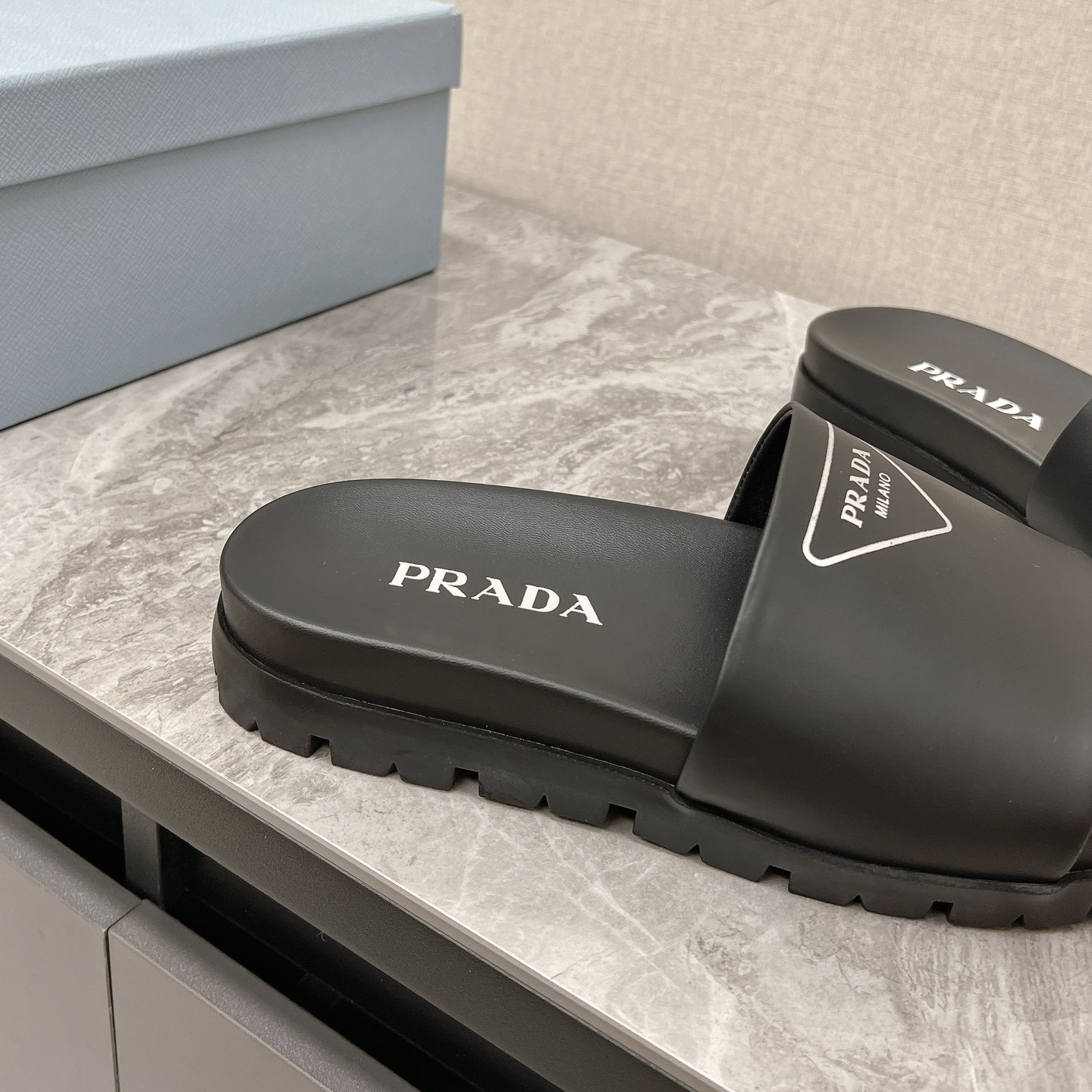 / 高仿Prada*1XX582N男女同款拖鞋塗層字母黑色免檢版