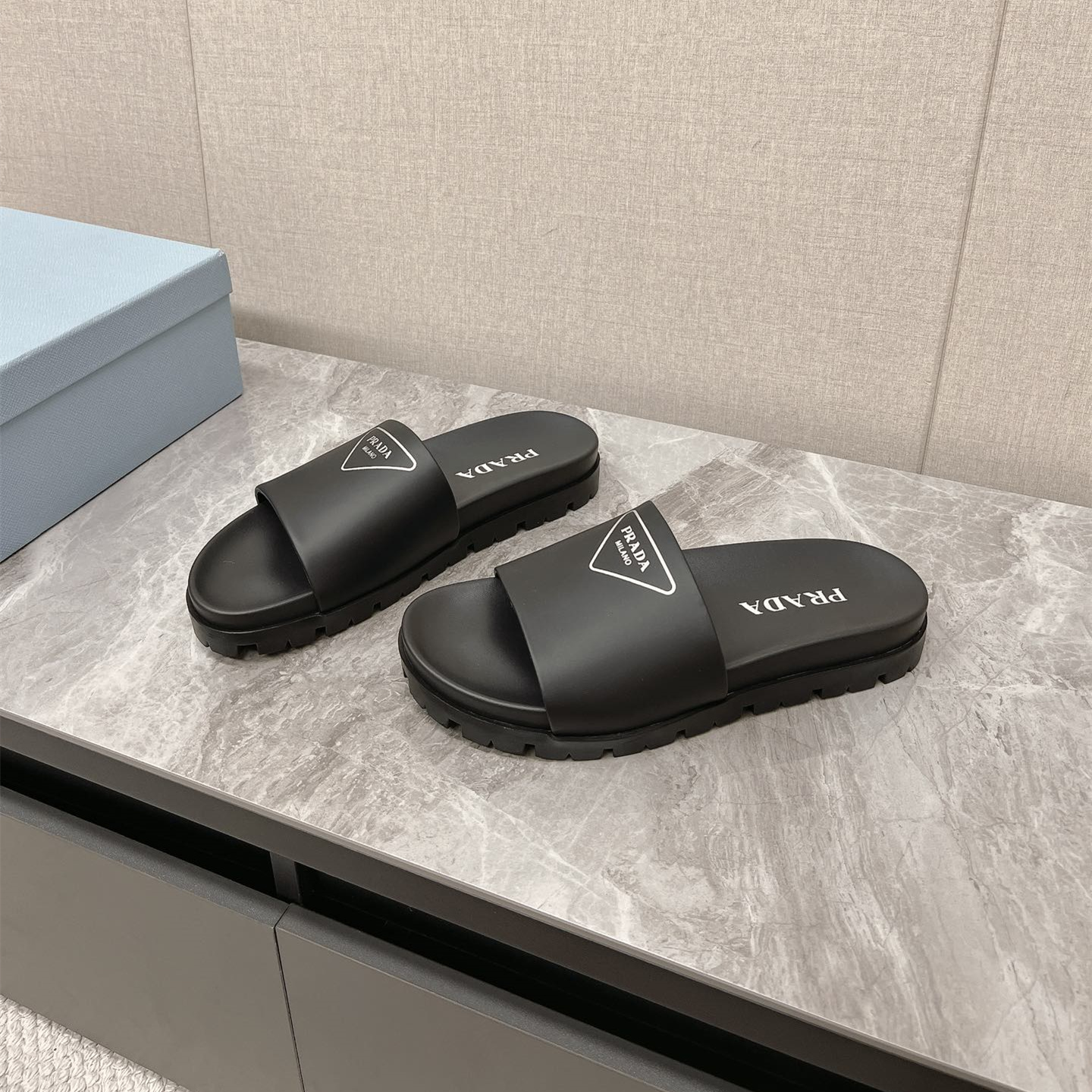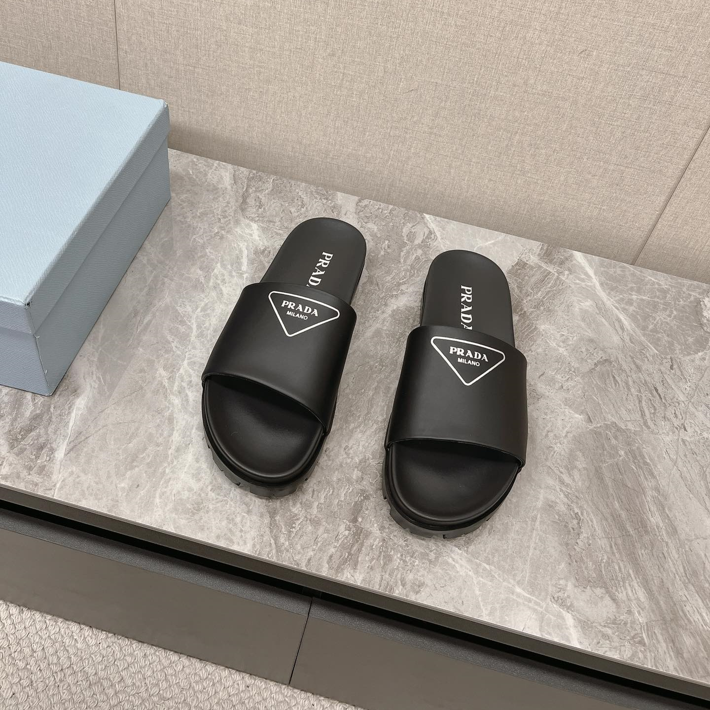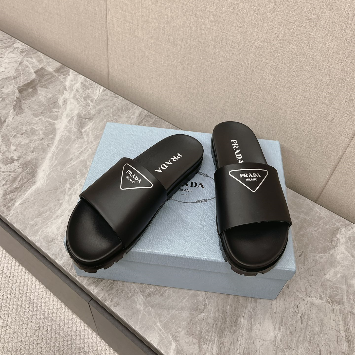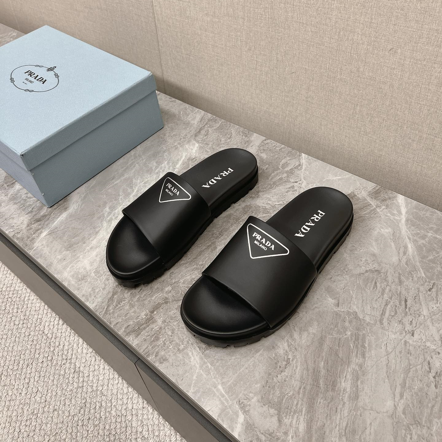/ 高仿Prada*1XX582N男女同款拖鞋塗層字母黑色免檢版
