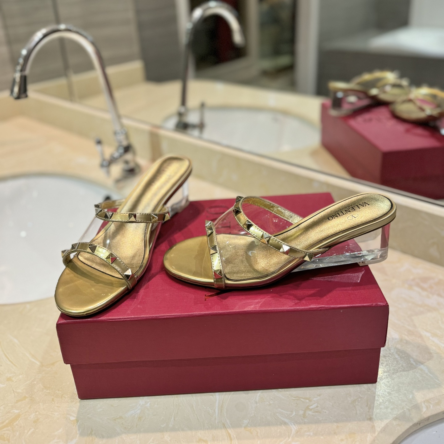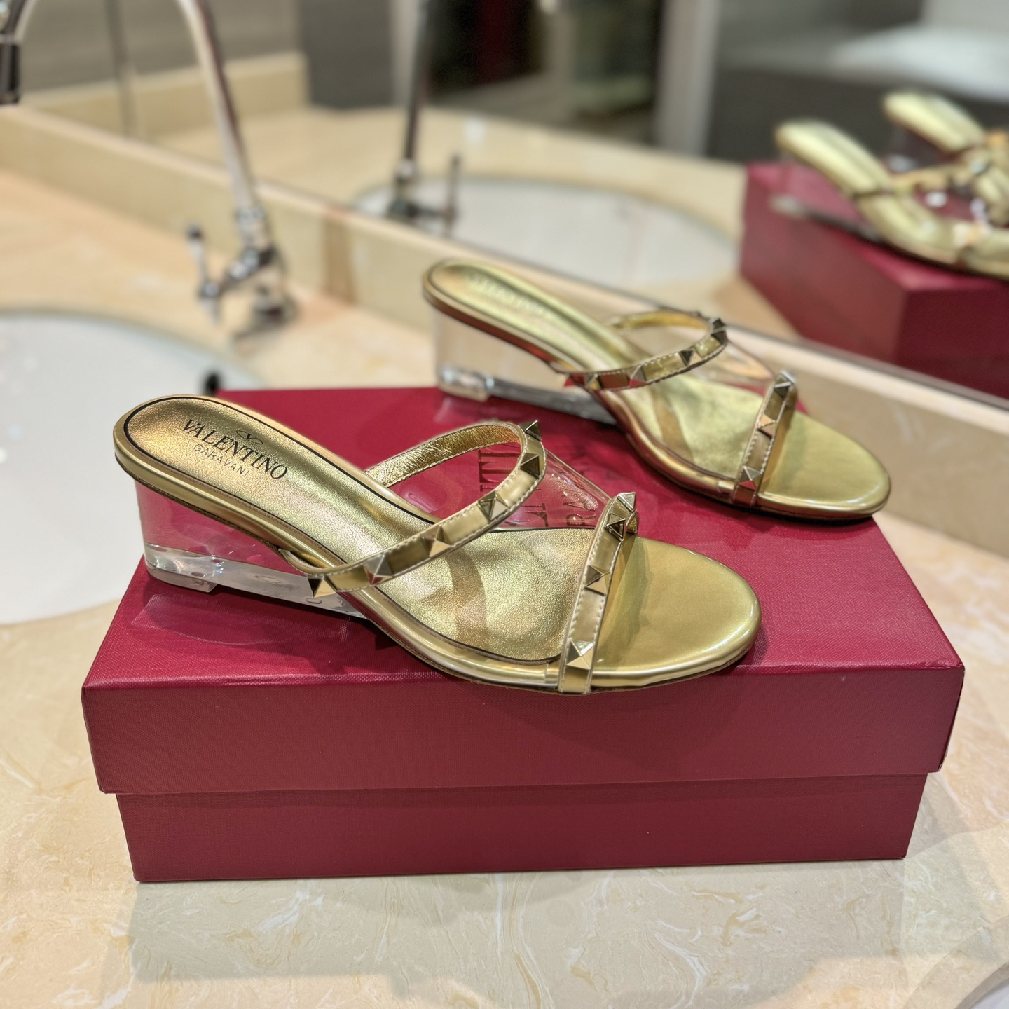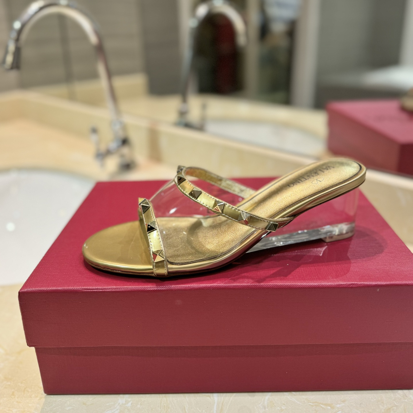 高仿Valentino*2W0S0GK鉚釘水晶踭涼鞋金色膠片4.5CM免檢版