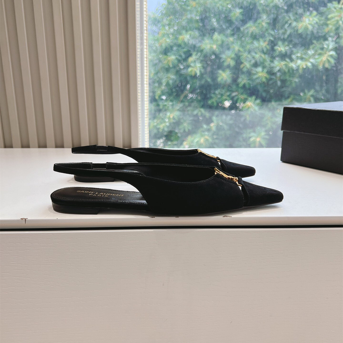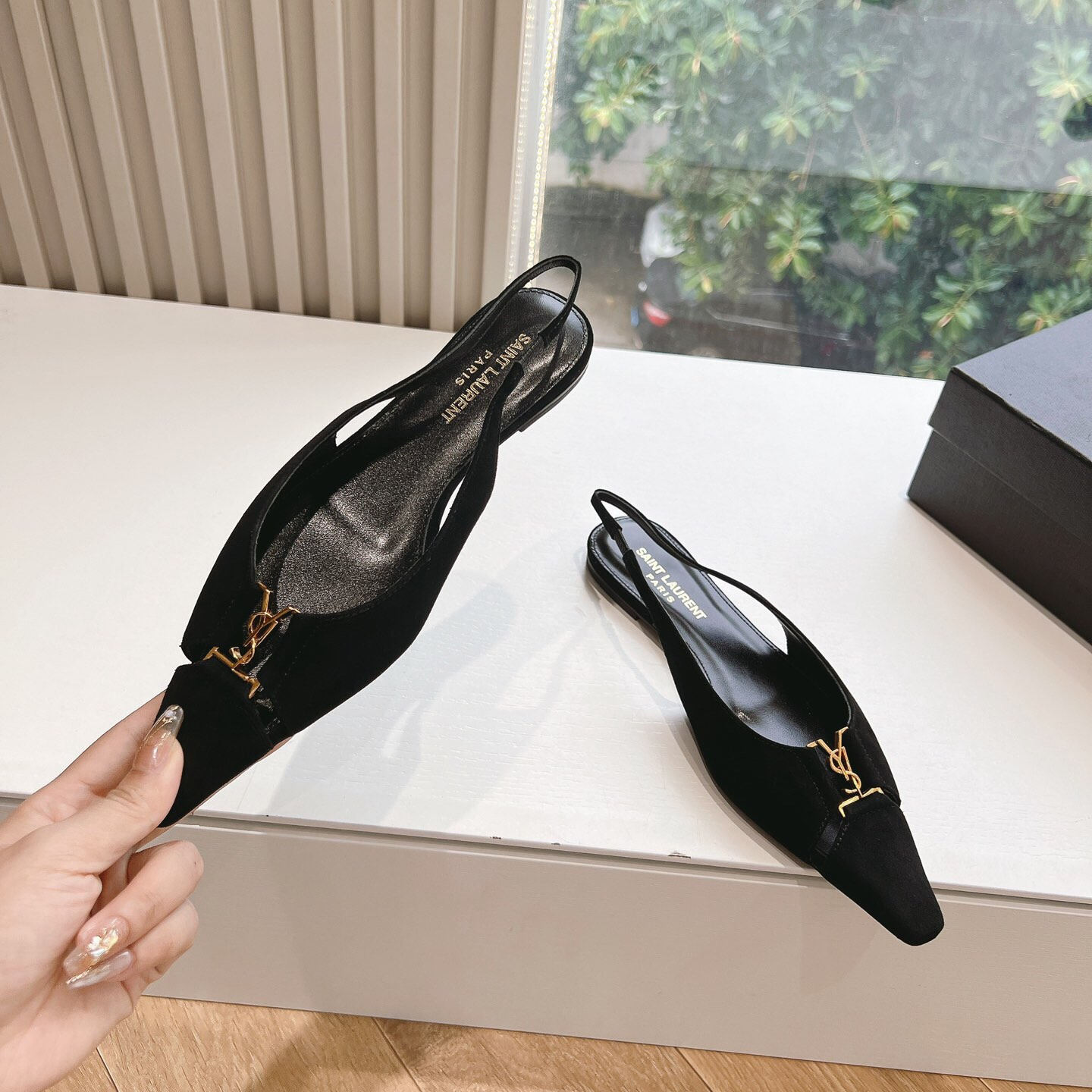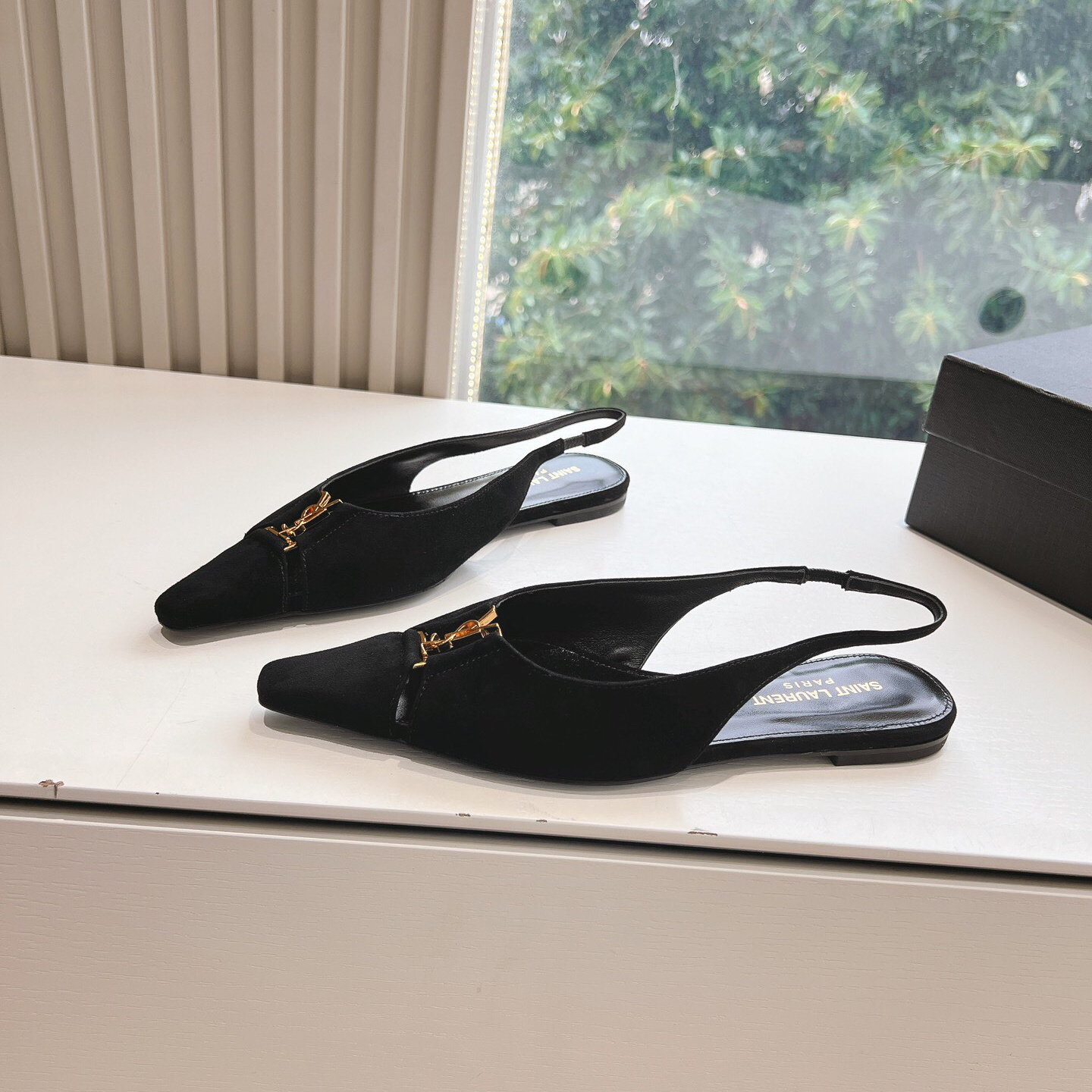 高仿YSL/聖羅蘭*Babylone系列803646T尖頭露跟平底鞋翻毛皮免檢版