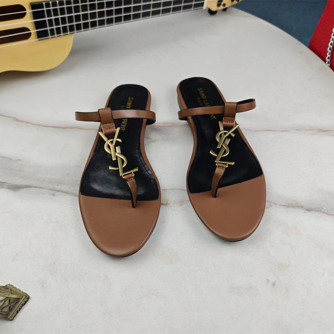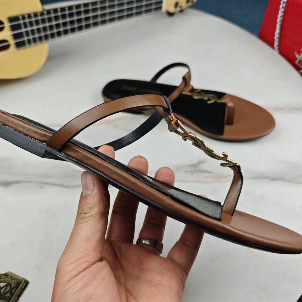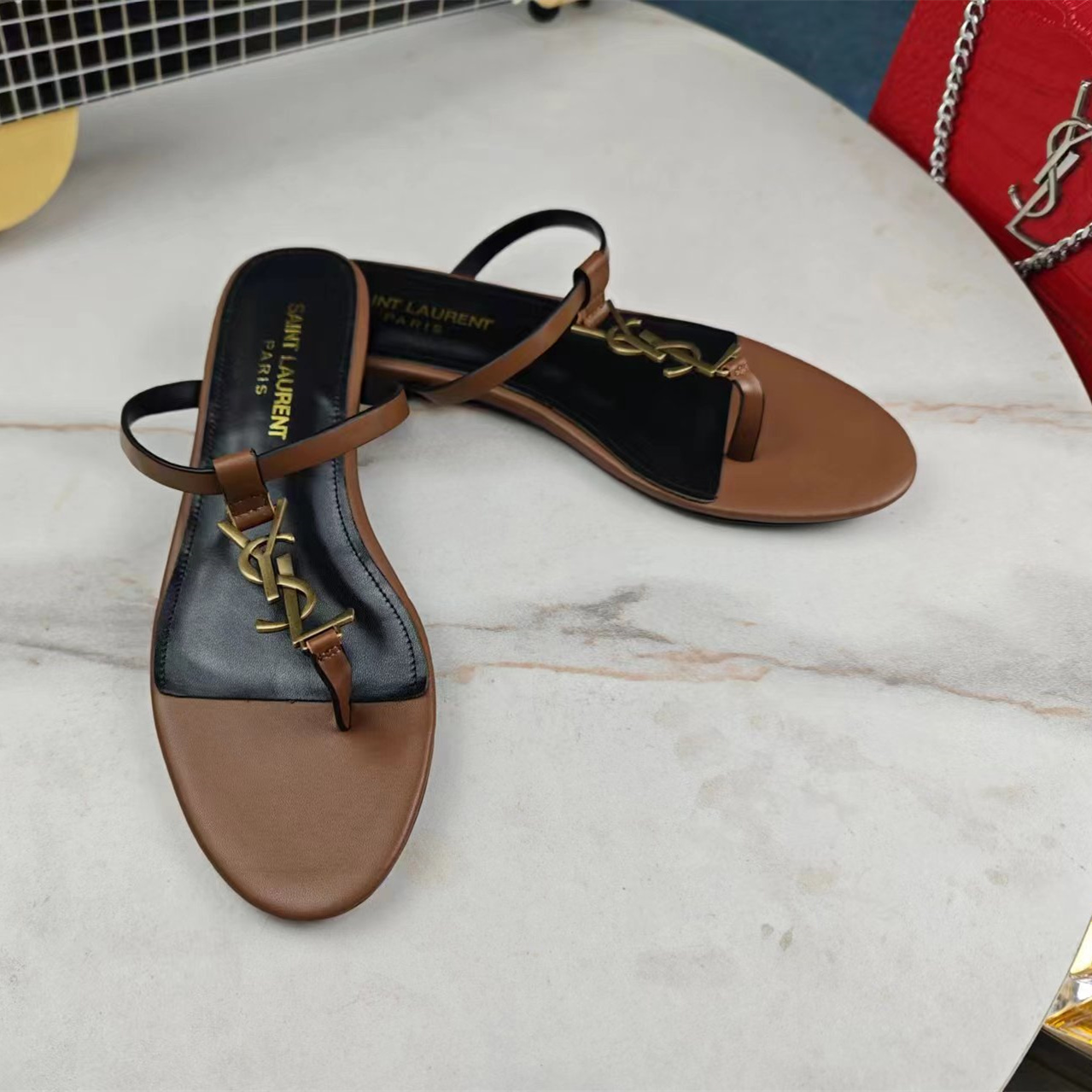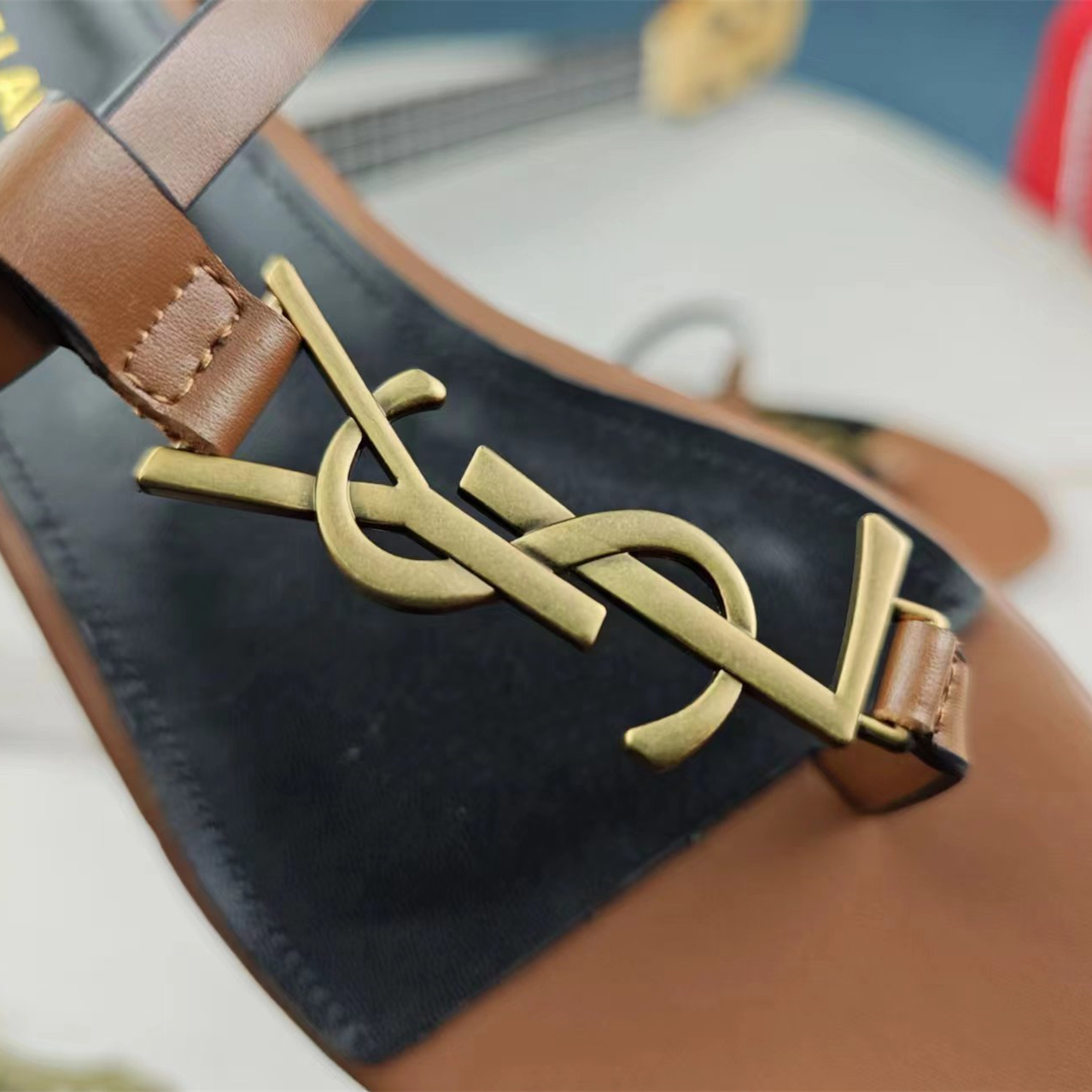 高仿YSL/聖羅蘭*Cassandra系列657917B/LOGO裝飾涼鞋棕色免檢版