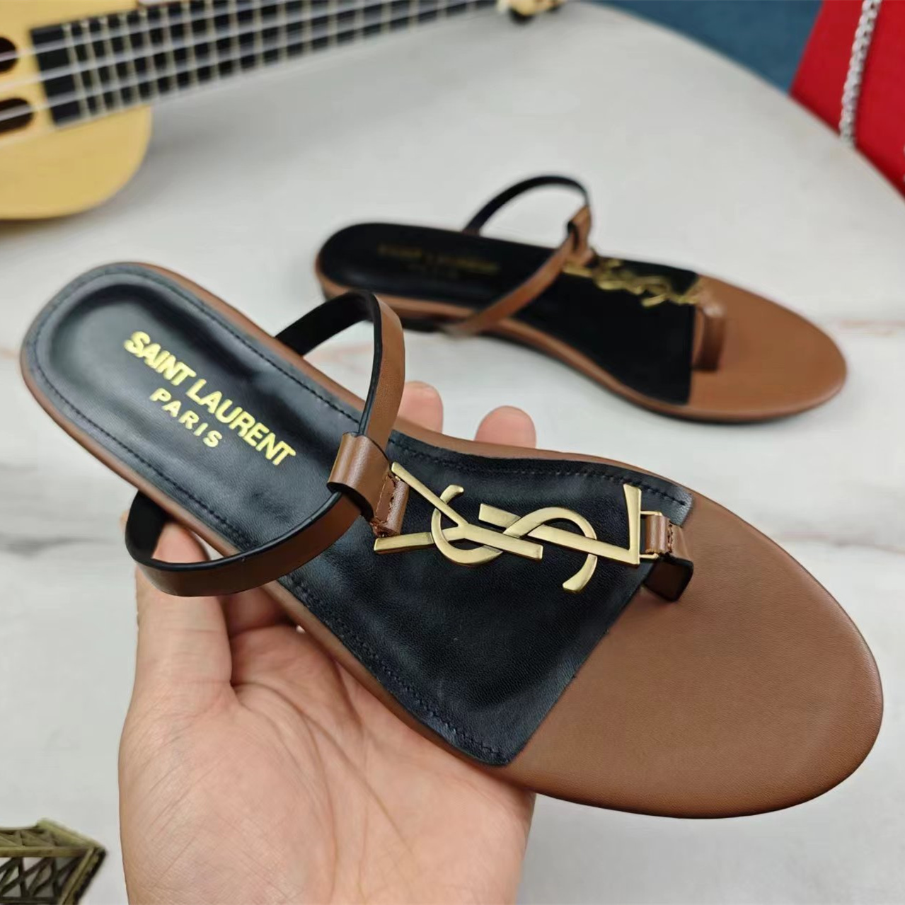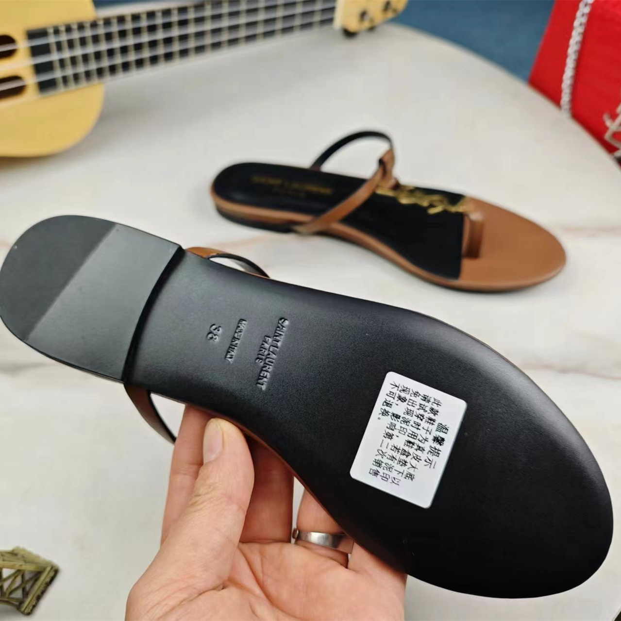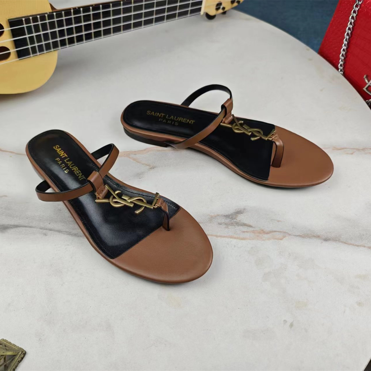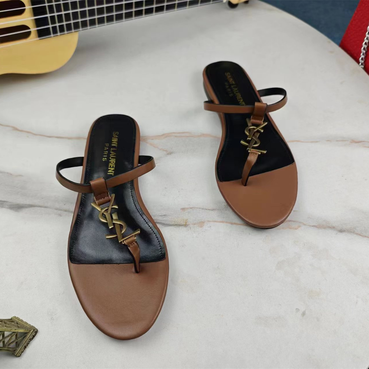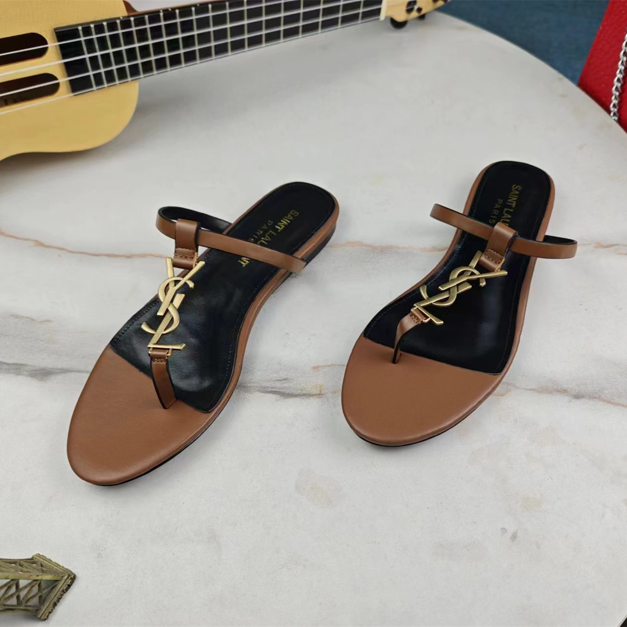 高仿YSL/聖羅蘭*Cassandra系列657917B/LOGO裝飾涼鞋棕色免檢版